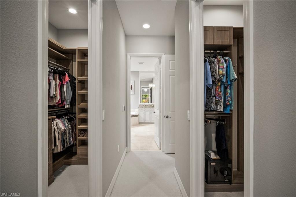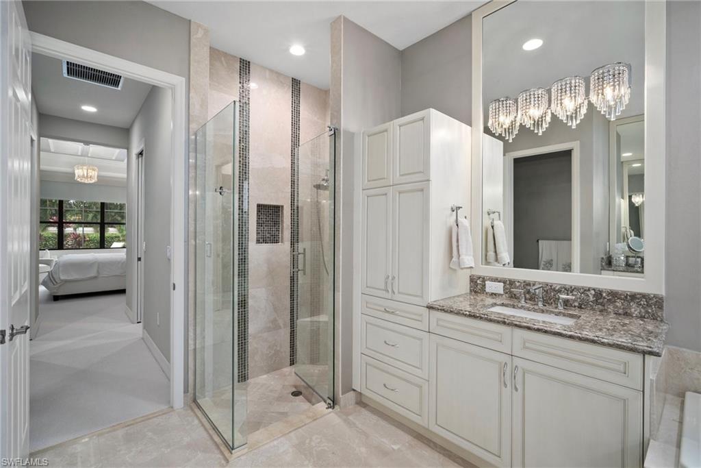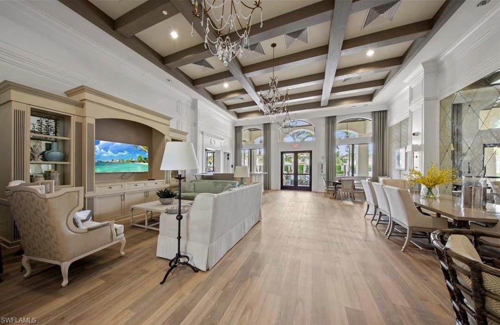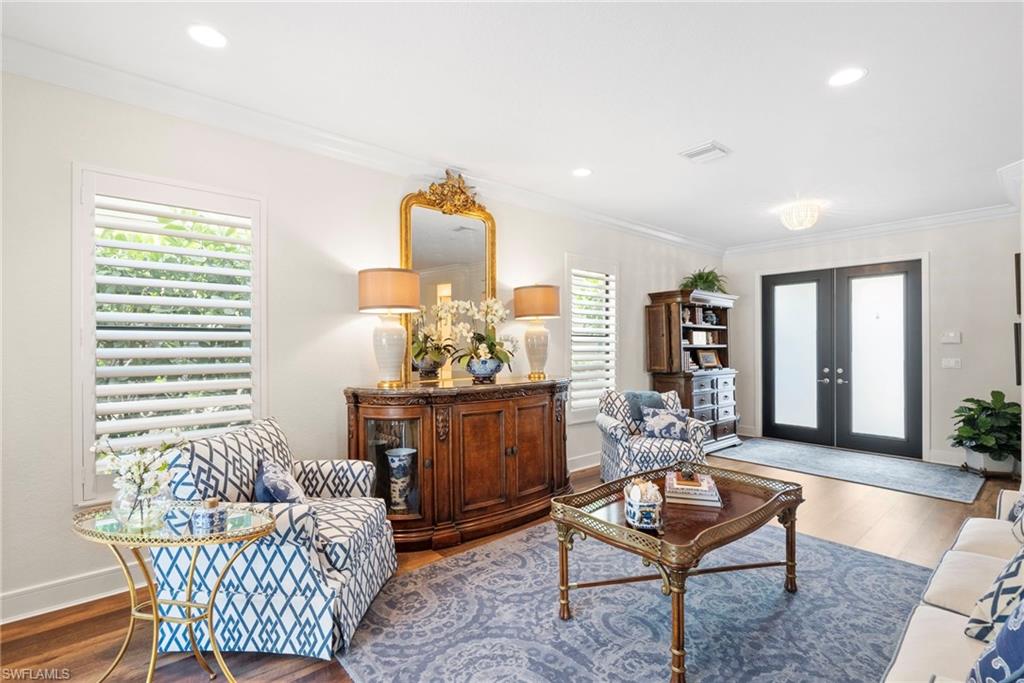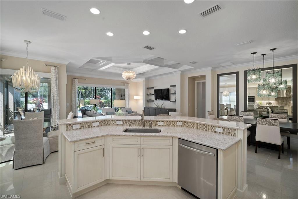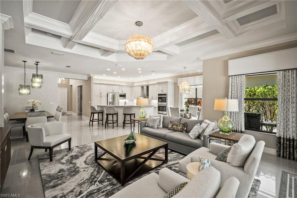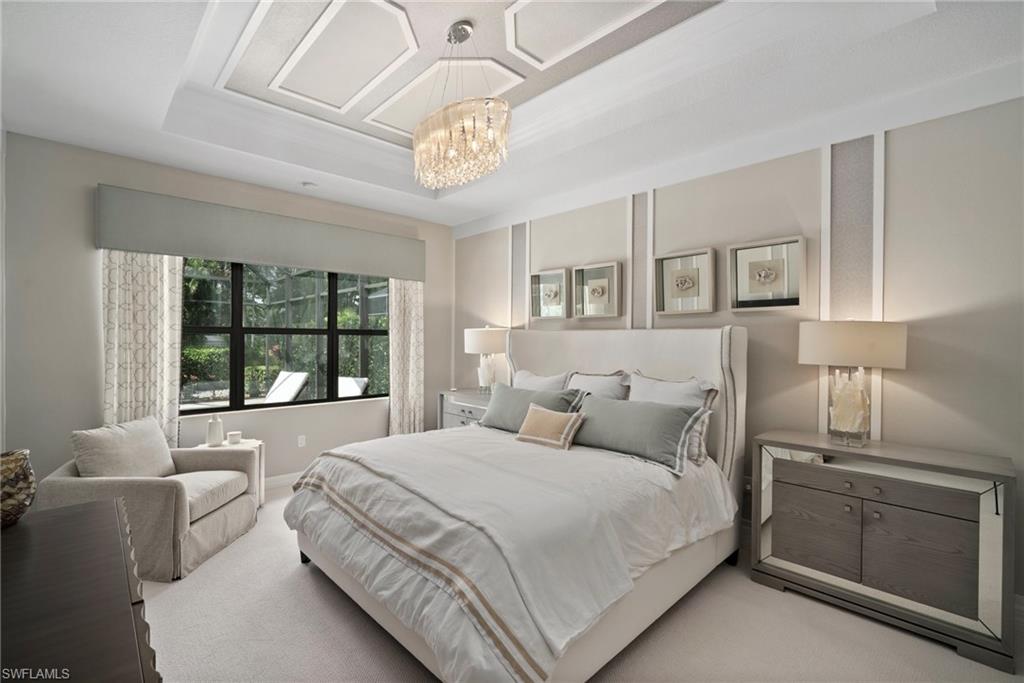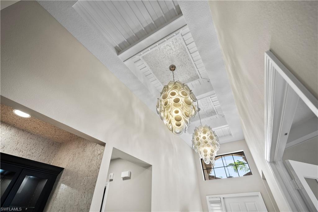 Professionally curated by Design West with over $300,000 in upgrades, this home showcases quality and style with custom coffered ceilings, elegant lighting, and premium finishes throughout. The open-concept layout blends everyday comfort with an entertainer’s flair featuring a custom media wall, and a built-in bar with wine cooler. There is meticulous attention to detail in the wall coverings, blinds and draperies which highlight the natural light and space. The kitchen offers quartz countertops, high-end appliances, and custom cabinetry with built-in pantry, and roll out drawers for smart, stylish storage. Every detail speaks to high end craftsmanship, from extensive woodwork around windows, doors, and mirrors, deep baseboards, crown molding, and intricate custom ceiling woodwork that elevate the entire space. All closets have been custom built as well. The owner’s suite is a true retreat with its custom ceiling and wall treatments. There are two fully built-out closets and a spacious spa-inspired bathroom that invites relaxation. Each guest suite enjoys its own private bath and wing for privacy. Throughout the home, custom window treatments—including silhouette shades and elegant drapery add warmth and privacy. All the bedrooms have remote powered blackout blinds. Step outside to a serene oasis with lush landscaping, a saltwater pool with a tranquil fountain, and a spacious covered lanai—perfect for year-round dining and entertaining. A whole house generator with 500 gallon propane tank, impact-rated windows and StormSmart hurricane screens provide peace of mind, while the epoxy-coated garage floor with built-in storage completes this one-of-a-kind offering. Marbella Isles offers world-class amenities and is conveniently located in the heart of Naples, in a great school district, just minutes from beaches, shopping, and downtown. Amenities include active pickleball & tennis programs, bocce courts, a resort-style pool, separate pool & play area for kids, world-class clubhouse with a fitness center, half-court basketball, & kitchen and games rooms. The community is meticulously maintained, has a solid HOA board and strong cash reserves.