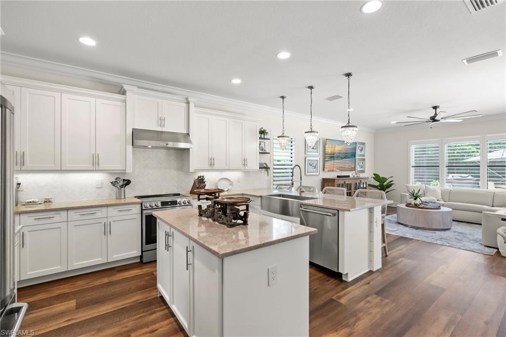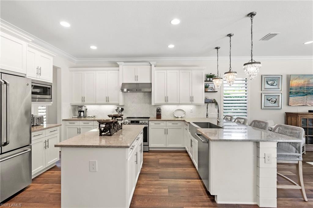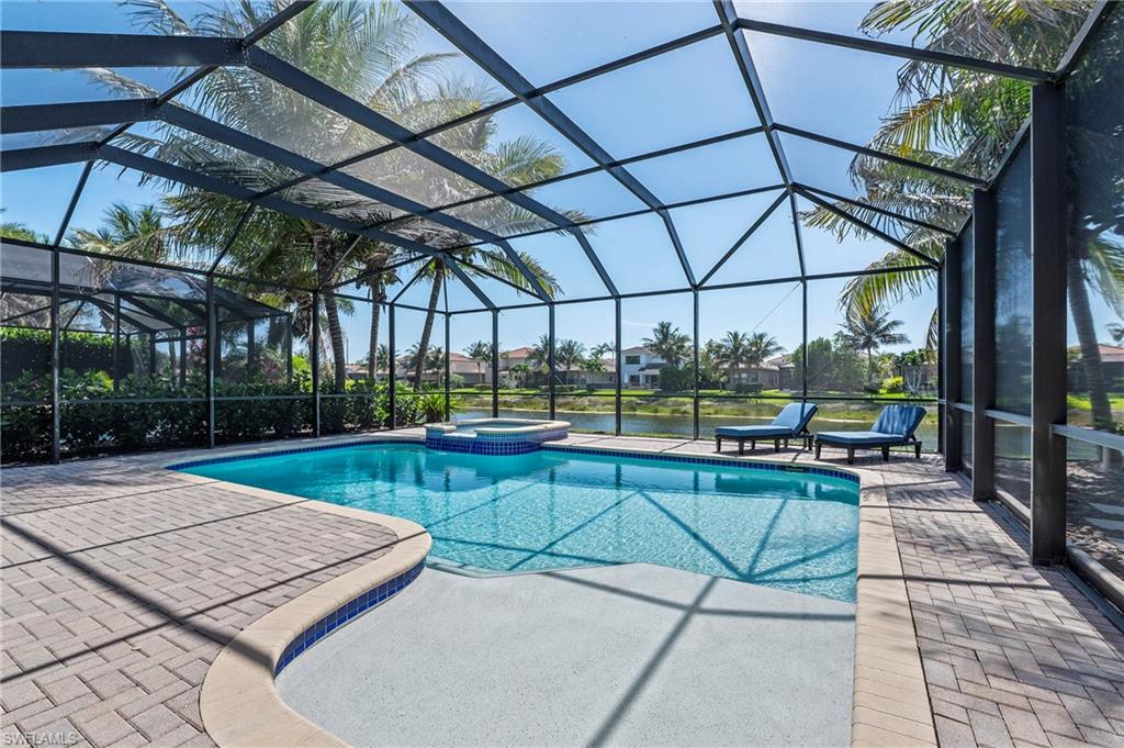 Welcome to this stunning 2,200+ sq. ft. waterfront residence in Marbella Isles, one of North Naples' most coveted gated communities. This one story residence features a beautiful saltwater pool and picturesque water views, creating the perfect setting for outdoor relaxation and entertaining. Inside, the gourmet kitchen is a chef’s dream with quartz countertops, newer stainless steel appliances, and custom lighting, ideal for both everyday meals and hosting guests. The open-concept living and dining room areas are thoughtfully designed with elegant woodwork and designer finishes, creating a space that is both sophisticated and inviting. The home offers four spacious bedrooms with numerous updates including new tile in all the bedrooms, a luxurious primary suite with custom walk-in closets and en-suite bath with dual vanities, a soaking tub, and elegant lighting. The new irrigation system and custom extended driveway and walkway add convenience and curb appeal. Located just minutes from upscale restaurants, shopping, and the stunning beaches of Naples, this home provides easy access to all the best the area has to offer. Marbella Isles itself is a resort-style community with amenities like a clubhouse, resort-style pool & spa, children’s waterpark & playground, tennis, pickleball, an indoor basketball court, fitness center, and game room. With two gated entrances, this community offers the perfect balance of privacy, convenience, and luxury living.