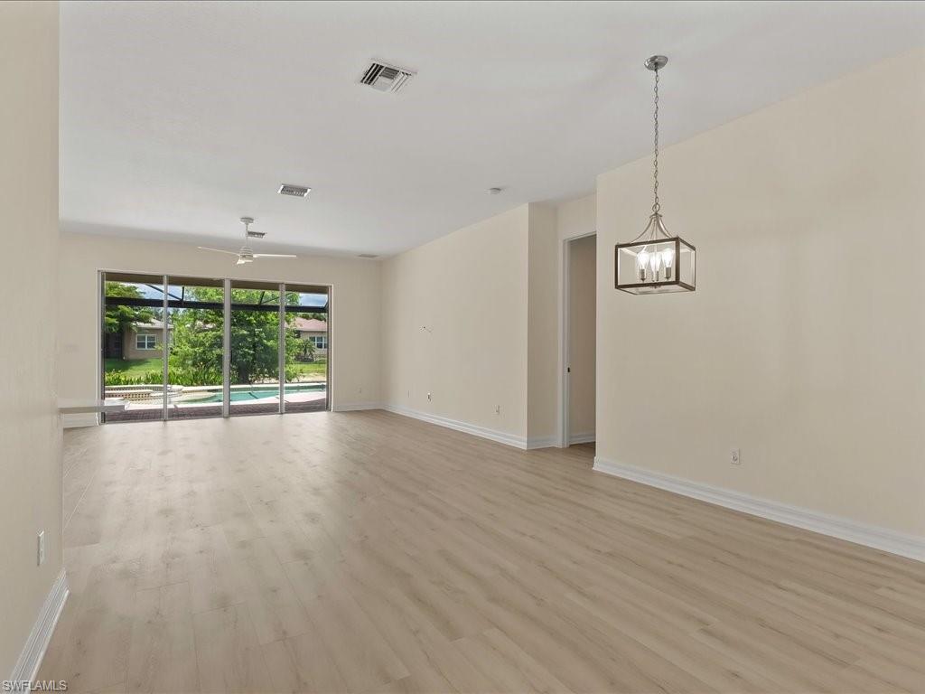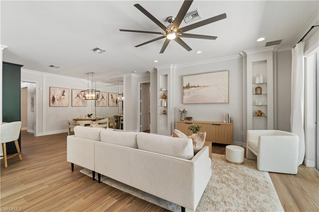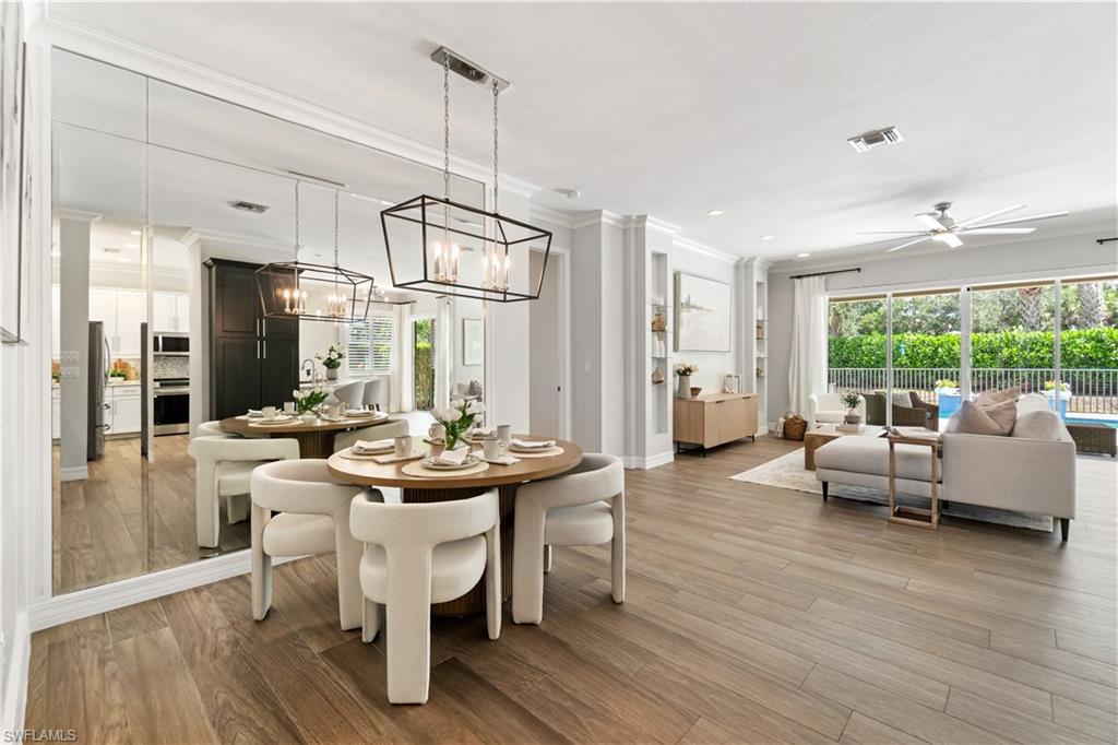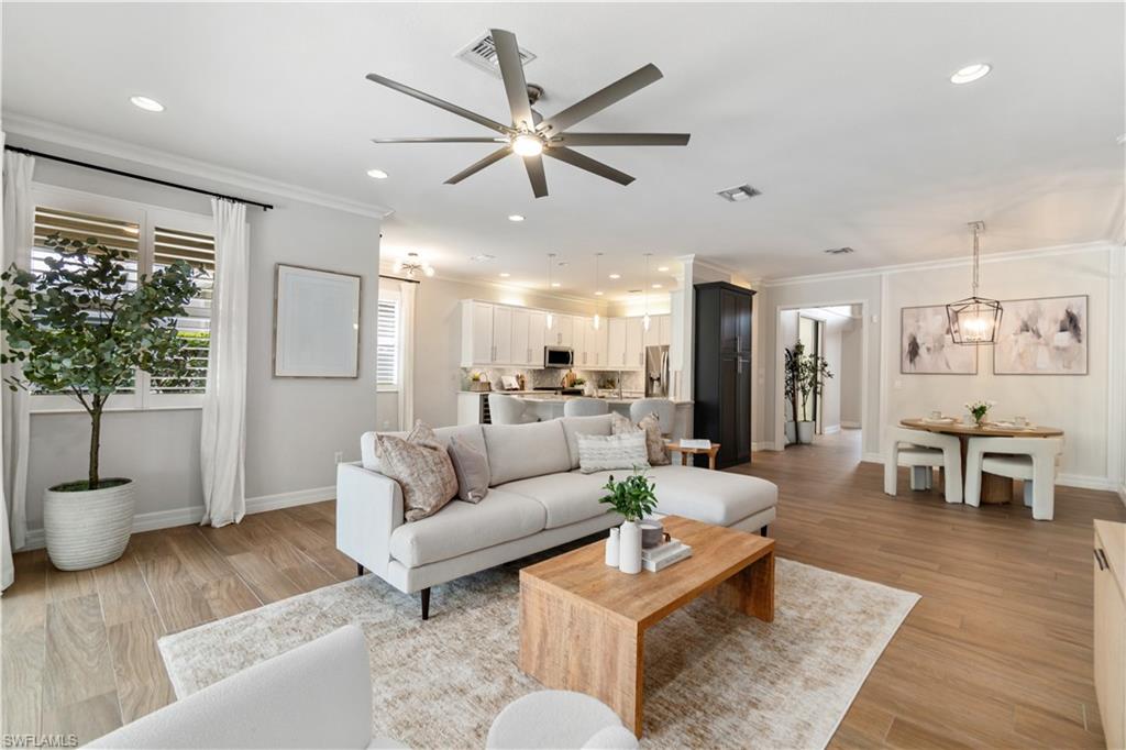 Beautifully renovated, newer construction home in a prime Naples location, nestled within the highly sought-after gated community of Marbella Lakes. Offering 3 bedrooms plus a den and 3 full bathrooms, this stunning residence is filled with natural light and features an open-concept layout with wide plank, wood-look tile flooring and plantation shutters. As you step through the front door, you’re greeted by a dramatic entryway featuring soaring volume ceilings, custom wood beams, and elegant pendant lighting. Beautifully furnished and decorated, this home exudes style and comfort (installed June 2025 — available separately and negotiable*). The beautiful, modernized kitchen features white quartz countertops, marble backsplash, white cabinetry, a wine fridge, and two adjacent dining areas — ideal for both casual meals and entertaining. The spacious split floor plan provides privacy, with the primary suite set apart from the guest bedrooms. The luxurious primary suite features private access to the pool deck, dual walk-in closets with custom built-ins, and a large ensuite bath with dual vanities, a glass-enclosed shower, and a separate soaking tub. Step outside into your private backyard oasis, complete with a resort-style pool with a waterfall feature, stone paver decking, a covered seating area with electric screens for either open air or screened relaxation, and a side yard that’s ideal for pets or outdoor activities. Marbella Lakes is a gated, guarded community offering low HOA fees and exceptional amenities, including a resort-style pool and spa, fitness center, tennis and pickleball courts, indoor and outdoor basketball, billiards, a children’s play area, and an active social calendar. All just minutes from Naples’ famous beaches, world-class dining and shopping on 5th Avenue, and located within an “A-rated” Collier County school district.