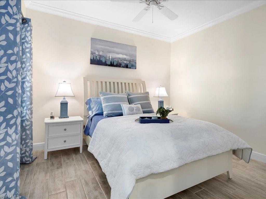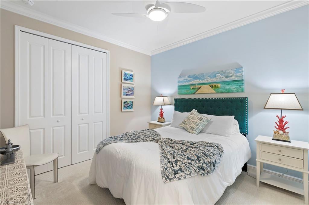 Located in Marquesa Isles, this two-bedroom plus den residence blends timeless design with modern upgrades. The foyer opens to 9-foot ceilings, 8-foot doors and 24-by-12-inch ceramic tile flooring in the main living areas. Glass French doors lead to an 11-by-12-foot den, suitable for a home office, reading space or guest accommodations. The open kitchen features an oversized quartz island, G.E. stainless steel appliances, designer tile backsplash, 42-inch cabinetry with crown molding and under-cabinet lighting. The 16-by-17-foot great room includes a coffered ceiling with crown molding and southern exposure lake views. The primary suite includes a walk-in closet, additional closet, and an en-suite bath with dual sinks and an oversized, designer-tiled shower. The screened lanai spans 14-by-10 feet with a 10-foot extension and sunshade, overlooking the lake. Additional features include impact pocket sliding doors, plush bedroom carpeting, custom window treatments, Smart Hub integration with Z-wave devices, Hotwire fiber-optic service, and an 18-by-20-foot garage with epoxy floor, insulated door and attic insulation. Marquesa Isles amenities include a clubhouse, resort-style pool and hot tub, dog park and landscaped grounds, all within a gated community close to Naples shopping, golf and beaches.