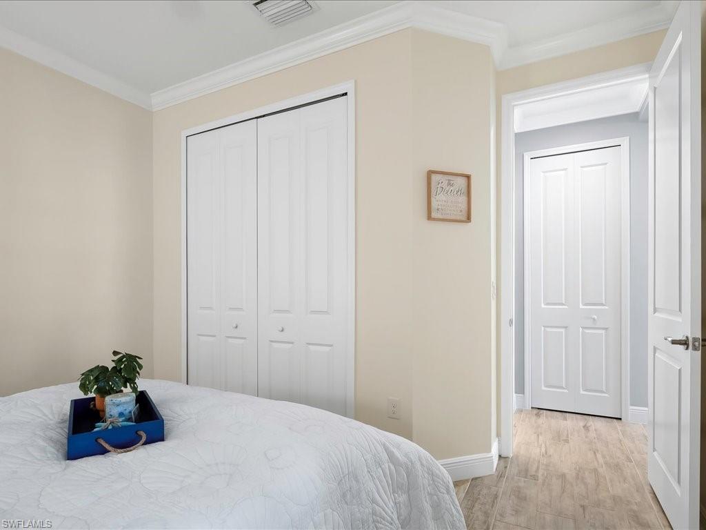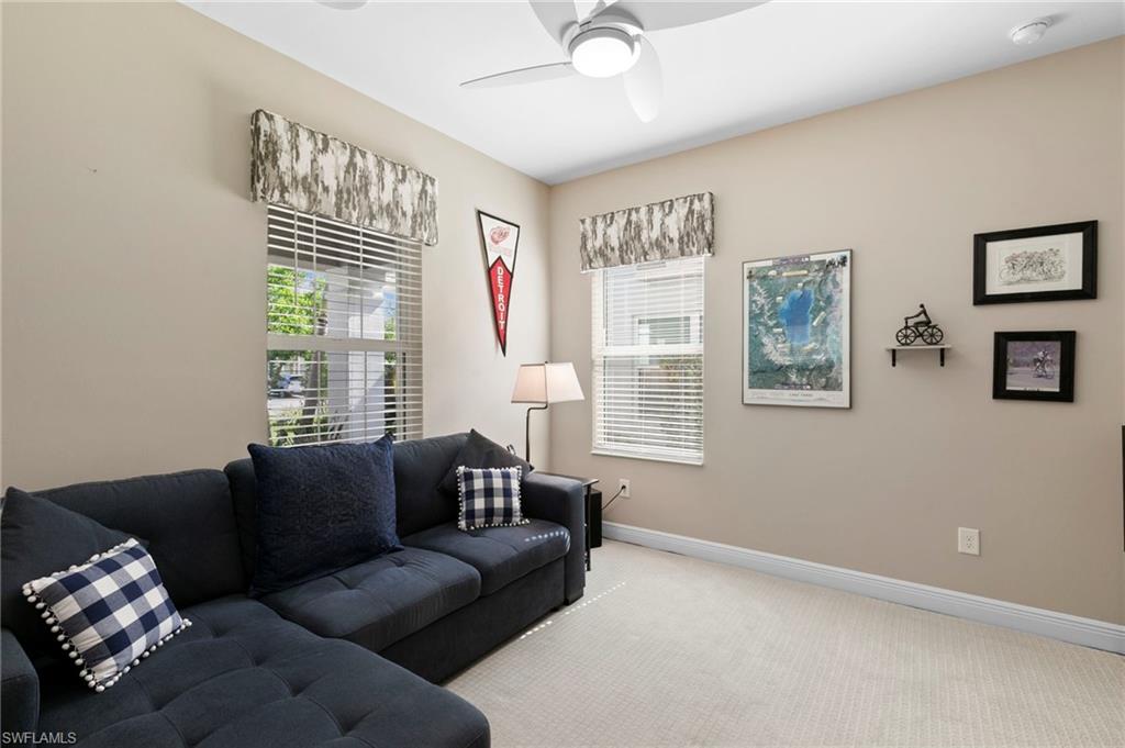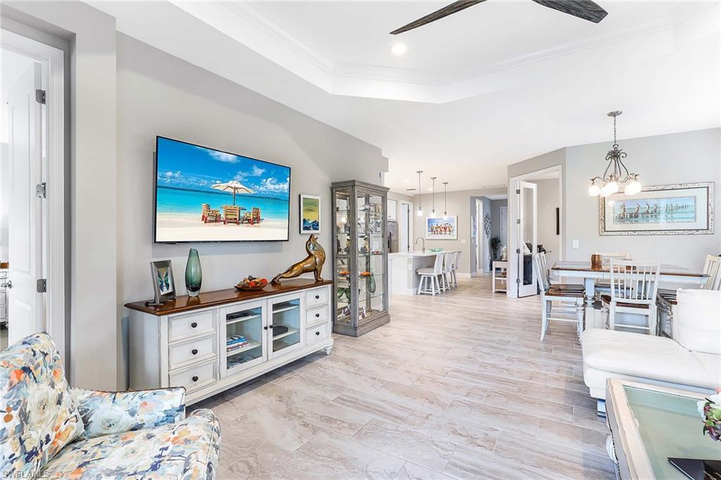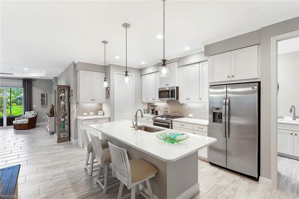 REDUCED $25,000!! This PET-FRIENDLY 3 bedroom plus den SINGLE-LEVEL villa offers a tranquil backyard setting. Situated in the X-zone, this 2019 home benefits from LOWER INSURANCE COSTS! A custom glass front door welcomes you into an open floor plan with tons of light, spanning over 1,800sf. The gourmet kitchen boasts an island, quartz countertops, a tile backsplash and a NATURAL GAS range all complimented by shiplap detailing around the island. Crown molding runs throughout the home, accentuating the high ceilings and 8' DOORS! The primary suite, featuring brand new carpet, offers a luxurious bath and spacious closet with custom shelving and upgraded hardware. Additional updates include IMPACT WINDOWS/DOORS throughout including POCKET SLIDERS opening to an EXTENDED lanai with an additional outdoor paver patio, as well as low voltage exterior lighting in the front and back. The home also includes a custom wall unit with a shiplap accent wall in the family room, wood shelving in the pantry, a laundry room with extra storage with wood shelving and upper cabinets and an epoxy-coated garage floor. Hardwired security cameras provide peace of mind, while privacy landscaping enhances the serene backyard setting. This peaceful, gated community is centrally located, only MINUTES from DOWNTOWN NAPLES, fabulous shopping, restaurants and pristine beaches! Neighborhood amenities include a beautiful clubhouse, pool and spa, fire pit and a dog park! LOW HOA FEES includes Hotwire fiber optic TV and internet (no Xfinity!) + lawn care and irrigation. NO CDD.