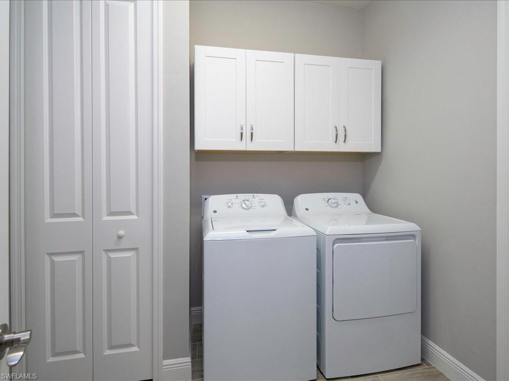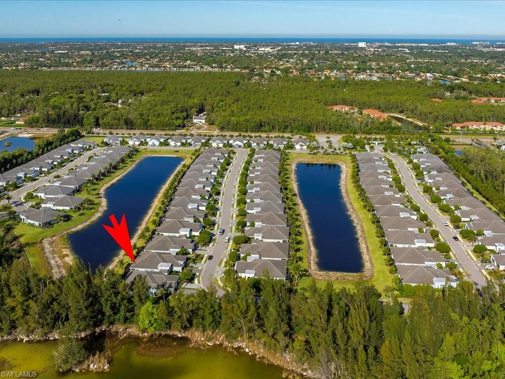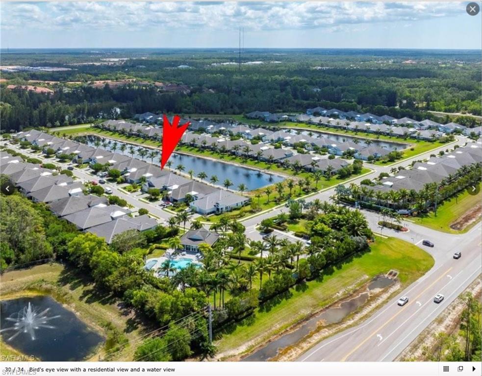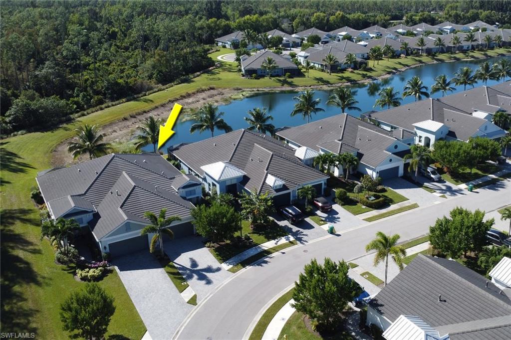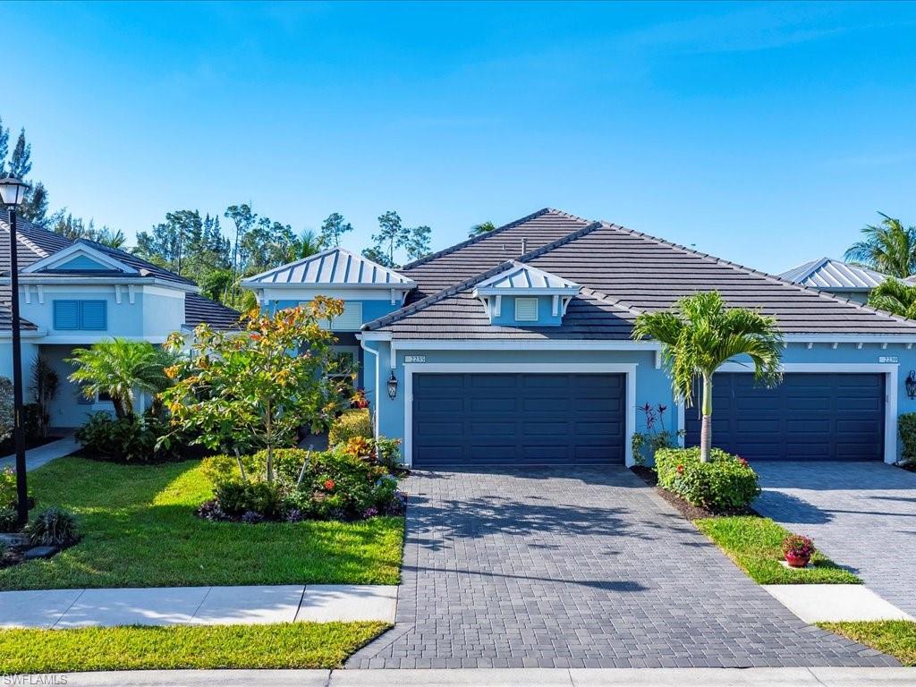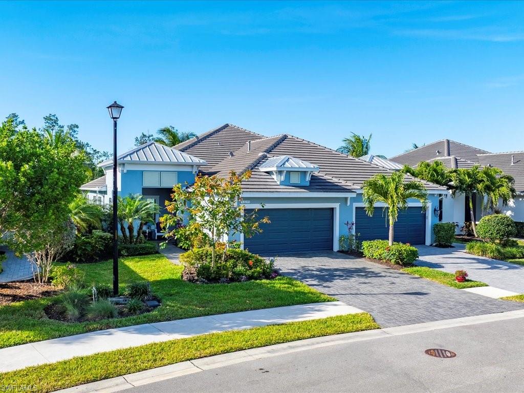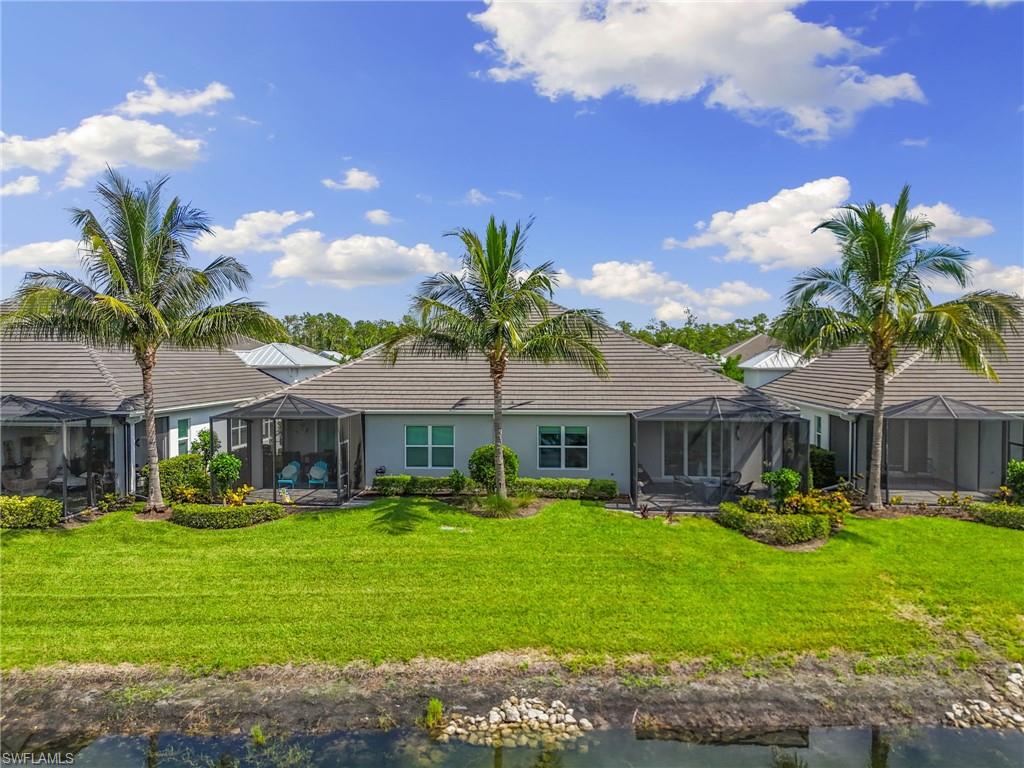 This one's a must see! Built in the later half of 2022 and rarely used corner lot. Contemporary colors and styling. Bright, spacious, 3 bedroom plus den, 2 bath, single level attached villa. Living area sliders open onto an extended screened lanai with leas scenic lake view. Front porch entry leads into a bright open floor plan with upgrades throughout including gourmet kitchen package, kitchen island, quartz countertops, 36" cabinets, stainless steel appliances, tile floors throughout, 8' doors, impact windows/doors, natural gas, shelved pantry, laundry room with shelving and cabinets and so much more. No CDD. Affordable HOA dues which include TV and internet, lawn care and irrigation. Situated in a FEMA X-zone means lower insurance costs and increased peace of mind. Enjoy the convenience of being only minutes from the heart of downtown Naples with all the amenities Naples living has to offer. Come relax in a peaceful gated community with pool and spa, clubhouse and even a dog park. Just take a look and you'll know you want to be here!