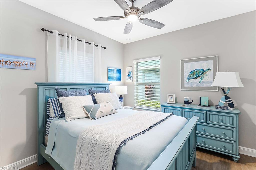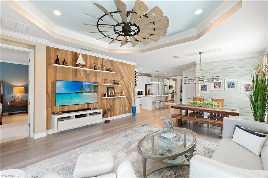 Built in 2020 and maintained in pristine condition, this coastal villa offers refined living in one of Central Naples desirable gated communities. With quality concrete block construction and impact-resistant windows throughout, this three-bedroom-plus-den residence is move-in ready and thoughtfully upgraded. The interior features tile and European French plank wood flooring with no carpet to maintain. A quartz island anchors the gourmet kitchen, complemented by a natural gas range, counter-depth stainless refrigerator, and clean soffit lines above cabinetry. A tray ceiling adds architectural interest to the great room, where 8-foot stacking sliders invite natural light and open to a screened lanai with peaceful water views. The primary suite includes dual vanities, a spacious walk-in shower, an electric bidet, and custom closet cabinetry. Functional upgrades include designer lighting from Wilson Lighting, a SimpliSafe security system and an epoxy-finished garage with pull-down attic access. Low HOA dues cover high-speed fiber optic internet and cable. No community development district or flood insurance required. Enjoy access to a community pool, clubhouse and dog park, all just minutes from Gulf beaches and dining in Old Naples.