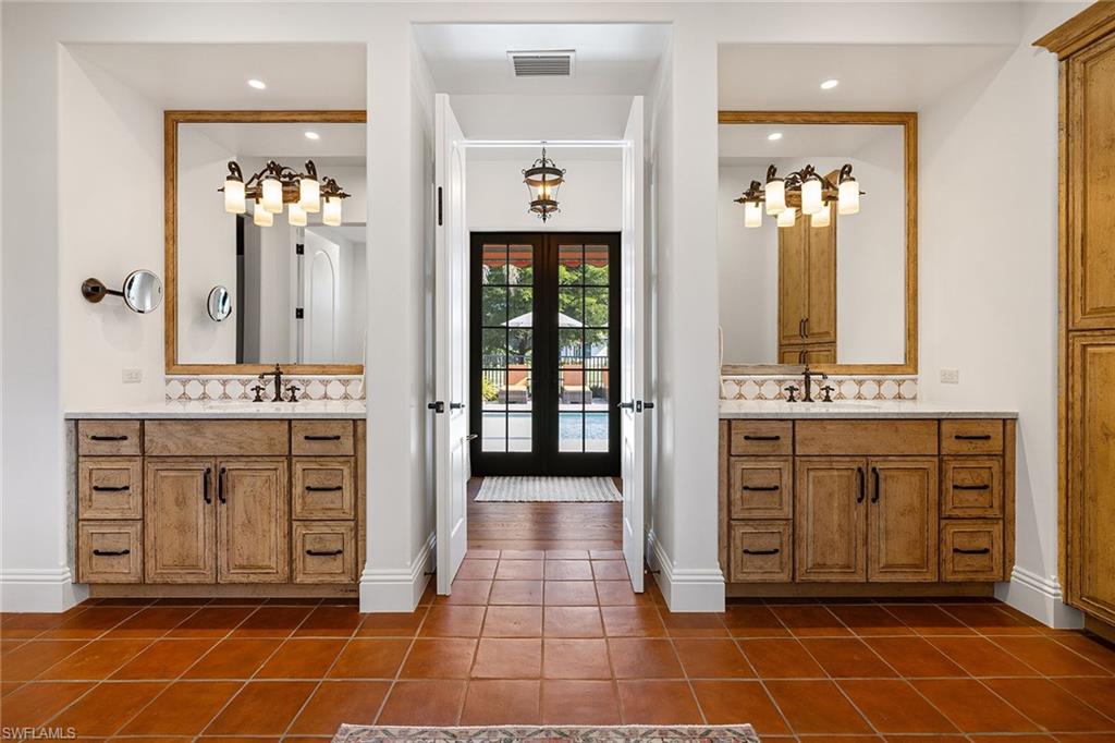 NO WAITING-GOLF CLUB MEMBERSHIP available immediately! Absolutely stunning home nestled on almost an acre on Tee 15 South! Enter the grand front door into the Grande Foyer anchored with a fireplace & curving stairs to the 2nd floor and with floor to ceiling windows/sliders and extending to beautiful lanai and the good morning sunrises beyond. New flooring throughout first floor, upgraded to LED lighting throughout, and upgraded light fixtures inside & out. This home is ideally designed for entertaining, from the formal & informal living spaces, the welcoming wet bar complete with wine refrigerators and gracious seating. The artisan designed kitchen is a chef delight with top tier appliances, warming tray, trash compactor, range hood, double oven/cook top, single wall oven, garbage disposals in both kitchen sinks, stainless steel sinks, touch facet on main kitchen sink indoor icemaker, new quartz countertop offering "miles" of prep space, a custom island, and 3 self-cleaning ovens. The Butler's Pantry is well equipped with additional dishwasher & sink, beverage fridges, 2 additional icemakers, loads of storage and additional countertop spaces. 2 reverse osmosis in kitchen & outdoor kitchen. The dining room has beautiful natural light. There is a sink and refrigerator in the upstairs entertainment center. Each of the generous bedrooms are en-suite and the primary suite is an oasis of relaxation with a seating area, spacious walk-in closets and leading to a spa inspired bath complete with oversized soaking tub, masterful shower & dual vanities. The lanai is opulent, with a soaring two story screen, cozy covered entertaining space, full outdoor kitchen, 2 TV’s on lanai, outdoor speakers for surround sound, new outdoor fans, all new grill parts for both fireplaces, all overlooking a sparkling pool with integrated spa, soft & hard scaping including a Koi Pond with waterfall! Updates include 4 A/Cs new in past 5 years, new roof in 2022, new pool heater & pump, 75 gallon hot water heater, whole house Lutron lighting system, whole house Creston control system, 30 zone whole house water shutoff, whole house water filter & softener, termite control around perimeter, indoor/outdoor security cameras, outdoor security lighting, added landscape & landscape lighting, storm screens, garage door spring replaced, garage cabinets, outdoor sink in garage, finished floor & lighting in garage and it is air conditioned! Mediterra offers world-class amenities, including two Tom Fazio-designed 18-hole championship golf courses, a Gulf-front beach club & restaurant, pickleball, tennis & bocce courts, an updated clubhouse, a soon-to-be expanded sports & lifestyle center and more.