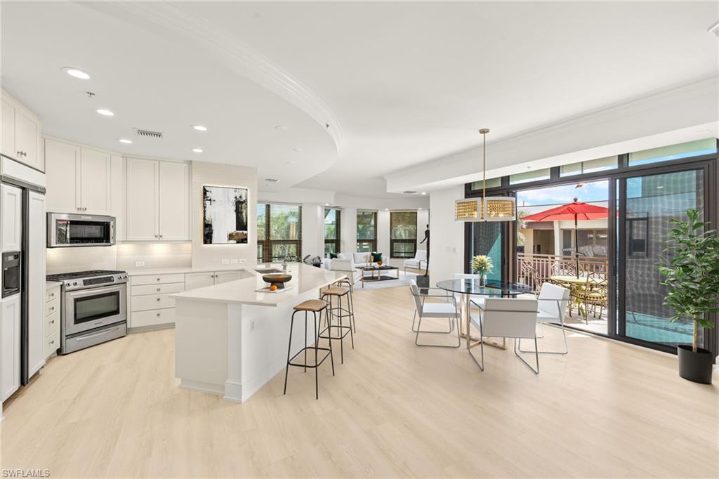 Positioned as one of the most sought-after residences in all of Mercato, this rarely available corner unit presents a unique opportunity for the discerning buyer. Offering three bedrooms and three full bathrooms, the home masterfully combines high-end finishes with the energy of a walkable, urban lifestyle—creating a living experience that is both elevated and effortless. Meticulously renovated, the residence features luxury vinyl plank flooring, quartz countertops, and fully redesigned bathrooms with frameless glass shower enclosures, contemporary tilework, and upgraded plumbing throughout. The open-concept layout is anchored by tray ceilings, impact-rated windows and sliders, and a natural gas range, delivering both sophistication and practical appeal. One of the most compelling aspects of this unit is its direct placement on Mercato’s exclusive amenity level. Without the need for elevators or long walks, residents enjoy immediate access to the resort-style rooftop pool and spa, a fully equipped fitness center, Viking grilling stations, fire pit, and a dedicated dog park—all just steps from the front door. Two secured garage parking spaces and an on-floor private storage room further enhance day-to-day convenience. Located just above some of Naples’ most popular dining and retail destinations—including Whole Foods, Bar Tulia, Rocco’s Tacos, the new Waxin’s Naples, and many more—this home places you at the center of one of Naples’ most dynamic neighborhoods. With Vanderbilt Beach only 1.5 miles away and downtown Naples just a short drive from your door, this residence offers the perfect balance of luxury, location, and lifestyle. A rare offering in one of Naples’ most vibrant communities.