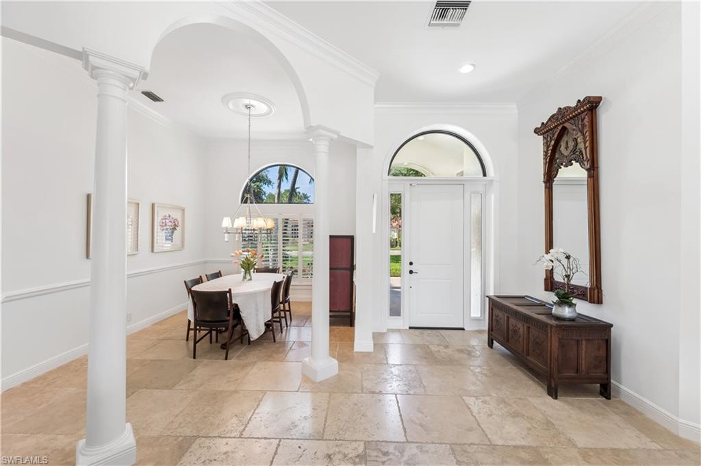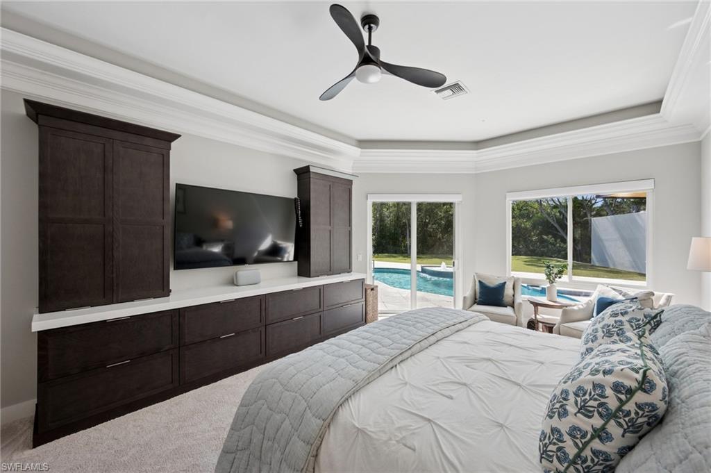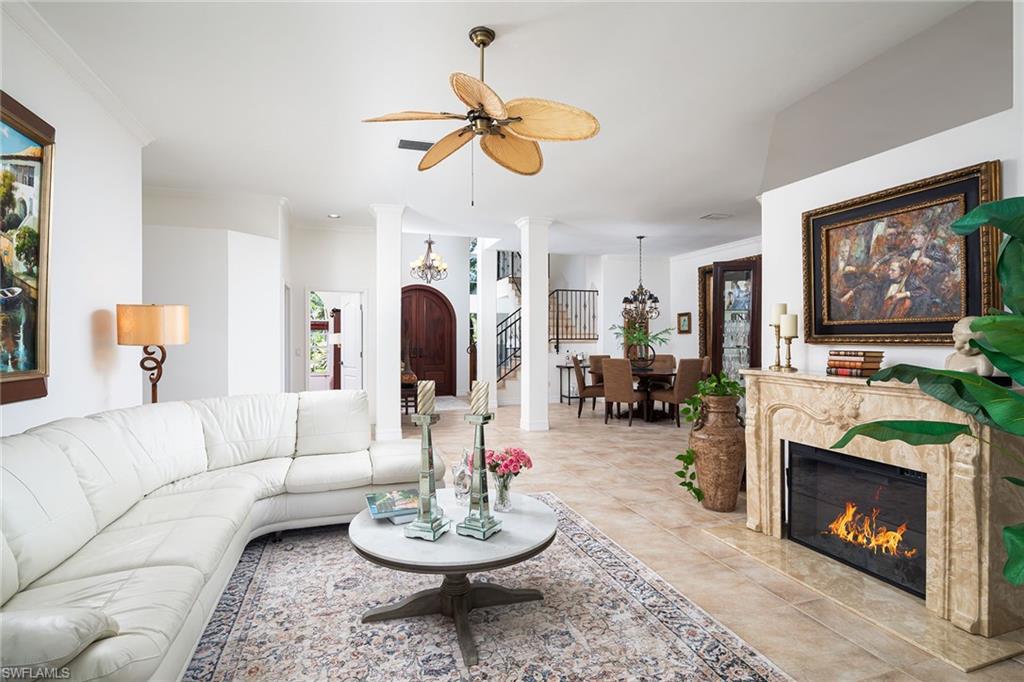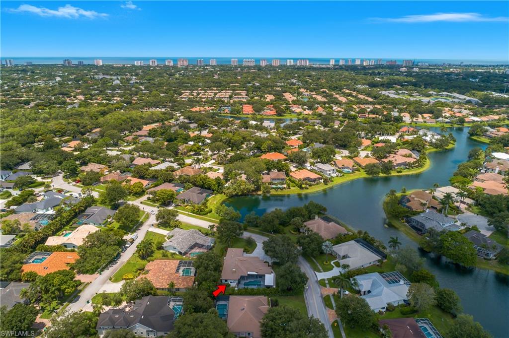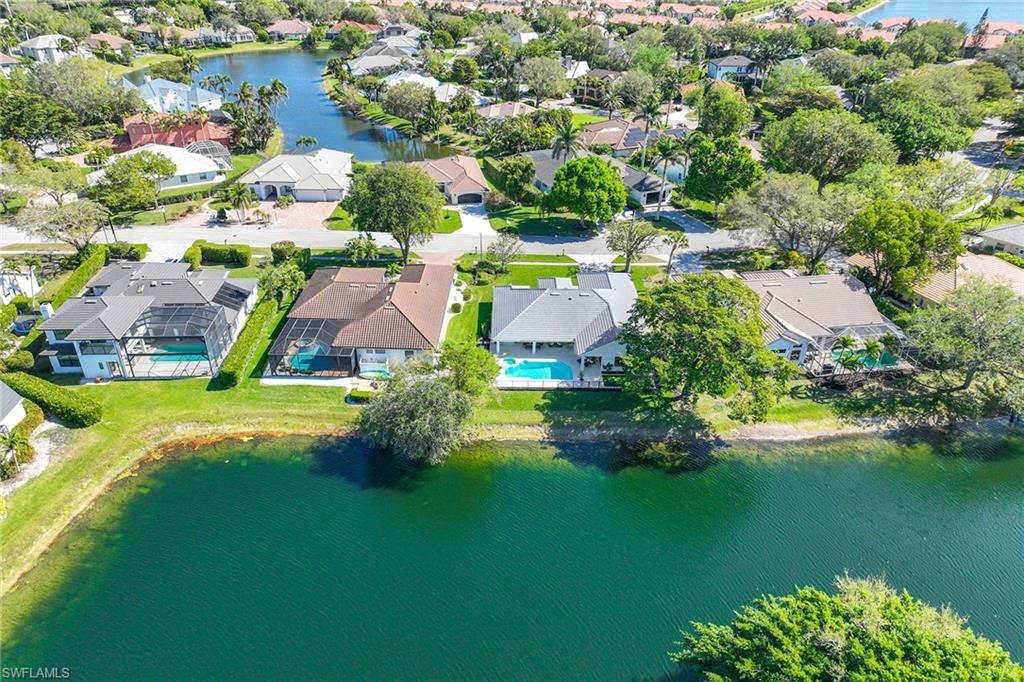 Sparkling long lake views are the backdrop for this timeless, sprawling home on a cul-de-sac street in the heart of Monterey. The signature space in this house is the fabulous second main or massive flex room on the second floor that comes complete with walk-in closet with built-ins and full bath. The distinctive front Mahogany doors, marble staircase and wrought-iron banister elevate the entry to the home. The outdoor space comes complete with resurfaced pool and spa, large covered area with outdoor kitchen and fantastic vistas looking east over the lake. The indoor space offers warm and inviting kitchen complete with glazed wood and glass paneled cabinetry, huge pantry, wine refrigerator and newer stainless appliances. The adjoining gathering room comes complete with huge palladium window maximizing the morning light and a signature stone accent wall with fireplace. Updated baths, wood flooring in bedrooms and den, built-ins with Murphy bed in study, impact windows on upstairs windows and two front windows in music room, two newer HVAC systems (2021 and 2022), water heater 2019, and massive two-plus car garage with terrific built-ins completes the package! Monterey continues to be among the leading communities in North Naples conveniently just three miles to Vanderbilt Beach and two miles to Mercato and Waterside Shops with 24-hour guarded gatehouse. Excellent amenities include award-winning clubhouse for private events, fitness center, heated lap pool, Har-Tru tennis courts with active tennis programs and pro play area, and basketball/pickleball court. A-rated public schools and three excellent private schools nearby.