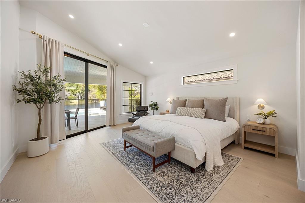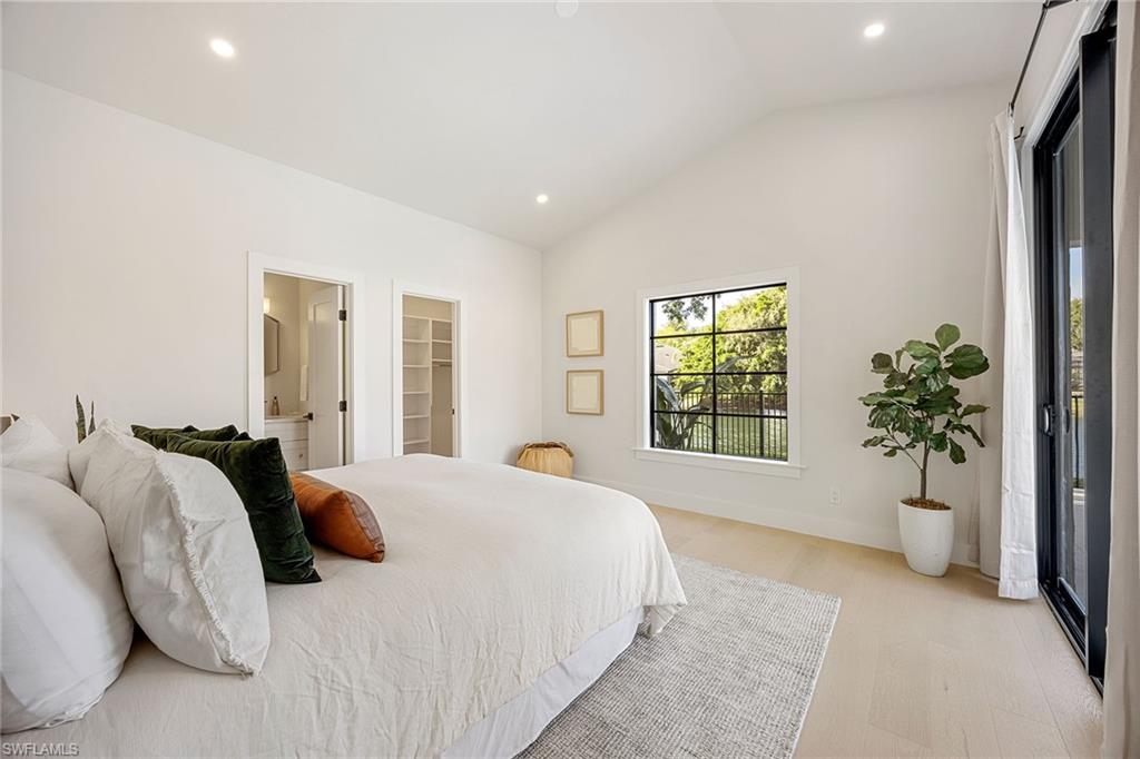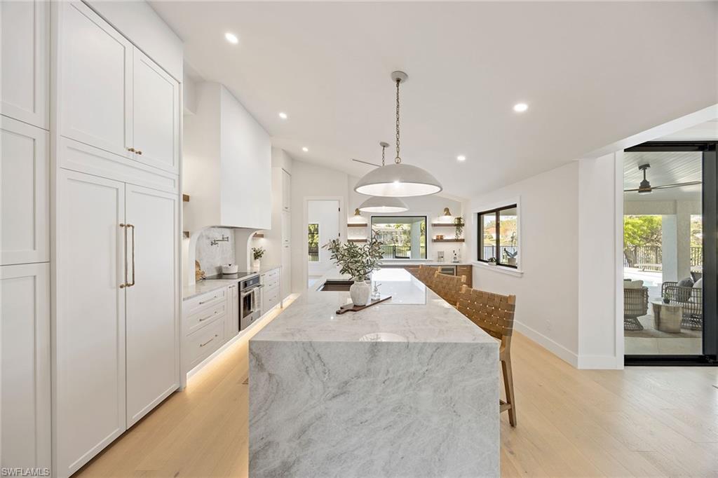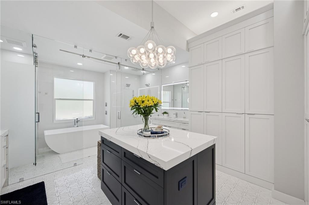 Coastal modern describes this spectacular total renovation in Monterey. This fabulous lakefront pool home offers soothing lake views with charming setting and is perched at the end of a quiet U-shaped street. Stunning architecture greets you with dramatic soaring 20 ft beamed ceilings and a huge bank of windows in the massive great room. The full renovation is fantastic, complete with gorgeous redesigned kitchen with massive center island and bar with dual zone wine refrigerator, white oak floors throughout, new impact windows and sliders, sleek new front doors, new pavered driveway and patio, new pool and spa, solid core 8ft shaker doors and new casings, baseboards and window wood trim throughout, newly repiped plumbing, new electrical box and electric throughout, new irrigation system, new AC ductwork, oversized laundry, luxurious owner’s suite complete with massive state-of-the-art bathroom, and signature dressing room loaded with space. Other superb finish details include freshly epoxied garage floors, chic lighting package inside and out, glassed in den, quartz and marble kitchen finishes, Sub-Zero refrigerator, Viking dishwasher, GE Cafe oven, induction cooktop with pot filler and microwave, Blanco sink,, oversized garage with 2nd refrigerator, newer roof (2018), new tankless hot water heater, and more. A fabulous wetroom in the owner’s suite comes complete with three Kohler shower heads (including two rain heads), stand-alone Empava tub, lighted mirrors and porcelain tile. The home is immaculate, stylish, state-of-the-art and move-in ready and the sunny eastern exposure floods the home with morning sunshine. Monterey continues to be among the leading communities in North Naples conveniently just three miles to Vanderbilt Beach and two miles to Mercato and Waterside Shops with 24-hour guarded gatehouse. Excellent amenities include award-winning clubhouse for private events, fitness center, heated lap pool, Har-Tru tennis courts with active tennis programs, kid’s play area, and basketball/pickleball court. A-rated public schools and three excellent private schools nearby. Photography and owner’s suite dressing room built-in cabinets are virtually staged.