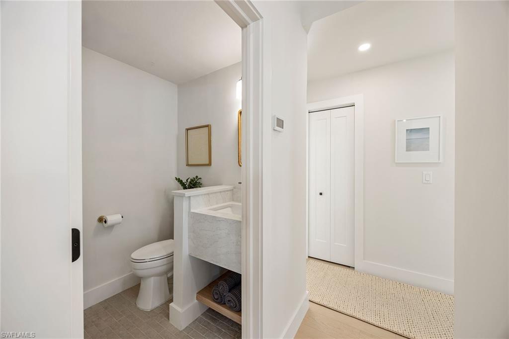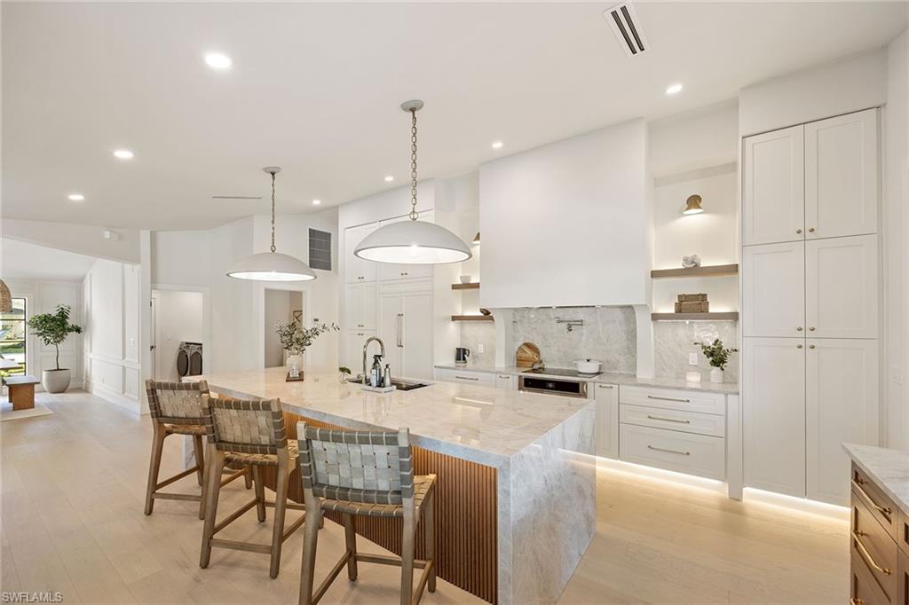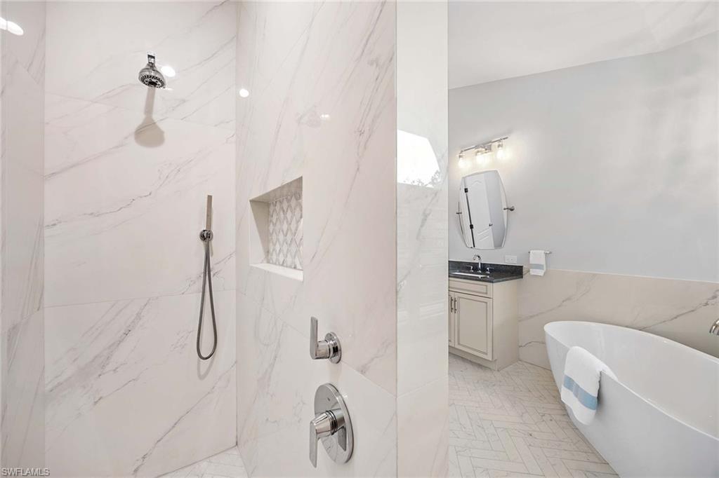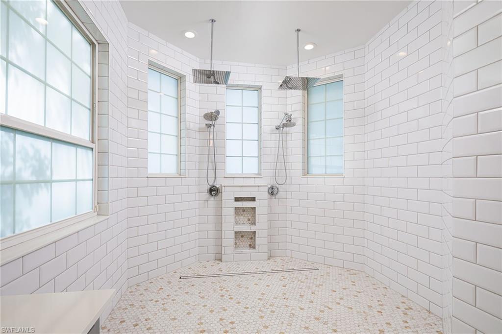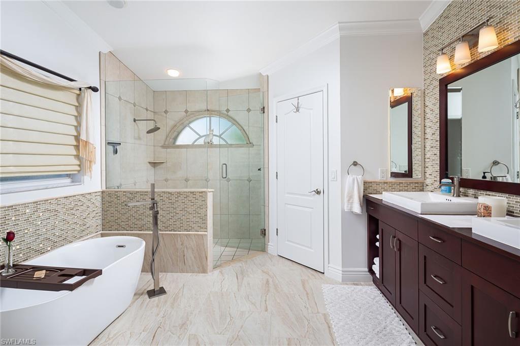Coastal modern describes this spectacular total renovation in Monterey. This fabulous lakefront pool home offers soothing lake views with charming setting and is perched at the end of a quiet U-shaped street. Stunning architecture greets you with dramatic soaring 20 ft beamed ceilings and a huge bank of windows in the massive great room. The full renovation is fantastic, complete with gorgeous redesigned kitchen with massive center island and bar with dual zone wine refrigerator, white oak floors throughout, new impact windows and sliders, sleek new front doors, new pavered driveway and patio, new pool and spa, solid core 8ft shaker doors and new casings, baseboards and window wood trim throughout, newly repiped plumbing, new electrical box and electric throughout, new irrigation system, new AC ductwork, oversized laundry, luxurious owner’s suite complete with massive state-of-the-art bathroom, and signature dressing room loaded with space. Other superb finish details include freshly epoxied garage floors, chic lighting package inside and out, glassed in den, quartz and marble kitchen finishes, Sub-Zero refrigerator, Viking dishwasher, GE Cafe oven, induction cooktop with pot filler and microwave, Blanco sink,, oversized garage with 2nd refrigerator, newer roof (2018), new tankless hot water heater, and more. A fabulous wetroom in the owner’s suite comes complete with three Kohler shower heads (including two rain heads), stand-alone Empava tub, lighted mirrors and porcelain tile. The home is immaculate, stylish, state-of-the-art and move-in ready and the sunny eastern exposure floods the home with morning sunshine. Monterey continues to be among the leading communities in North Naples conveniently just three miles to Vanderbilt Beach and two miles to Mercato and Waterside Shops with 24-hour guarded gatehouse. Excellent amenities include award-winning clubhouse for private events, fitness center, heated lap pool, Har-Tru tennis courts with active tennis programs, kid’s play area, and basketball/pickleball court. A-rated public schools and three excellent private schools nearby. Photography and owner’s suite dressing room built-in cabinets are virtually staged.