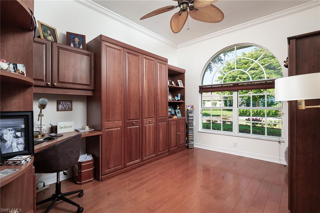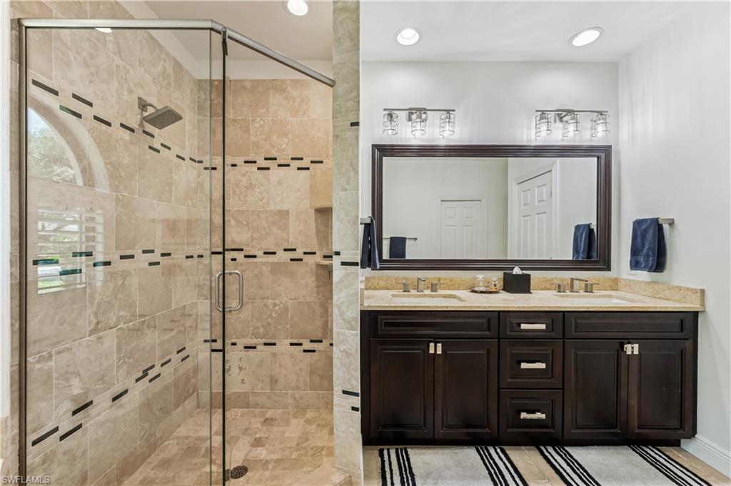 Beautifully updated pool home on a quiet lakefront lot in the highly sought-after Monterey lives large with an open great room layout, a deep covered lanai, 12-foot ceilings inside and out and eight-foot doors. Many improvements have been made, including impact windows and lanai doors (two mitered glass windows are not impact), a new picture frame lanai enclosure (2018), a new roof (2017), a renovated primary bath (2022), a new AC system and AC ductwork (2023), gorgeous mahogany-stained Plastpro front doors, a Clopay garage door, new interior doors, beautiful hardwood flooring and newer baseboards and casings throughout the living area and bedrooms. Spectacular full renovation of the primary bath with sparkling quartz counters, an exquisite oversized walk-in shower with no threshold, gleaming subway tile, a dual rain head and dual Aquabliss handheld shower heads. The open kitchen with a granite island is the perfect gathering area with beautiful white cabinetry, drawers and pull-outs, a walk-in pantry and a new Samsung stainless steel refrigerator and range. Other features include plantation shutters, well for irrigation and an oversized side-load garage with built-in cabinets and epoxy floors. The versatile floor plan offers a study with a closet that can be used as a fourth bedroom and a separate den area is easily convertible into second home office or enclosed playroom. The meticulous, move-in condition and negotiable furniture offerings complete the package. Monterey continues to be among the leading communities in North Naples conveniently located just three miles to Vanderbilt Beach and two miles to Mercato and Waterside Shops with a 24-hour guarded gatehouse. Excellent amenities include an award-winning clubhouse for private events, a fitness center, heated lap pool, Har-Tru tennis courts with active tennis programs, kids play area, and a basketball/pickleball court. A-rated public schools and three excellent private schools nearby.