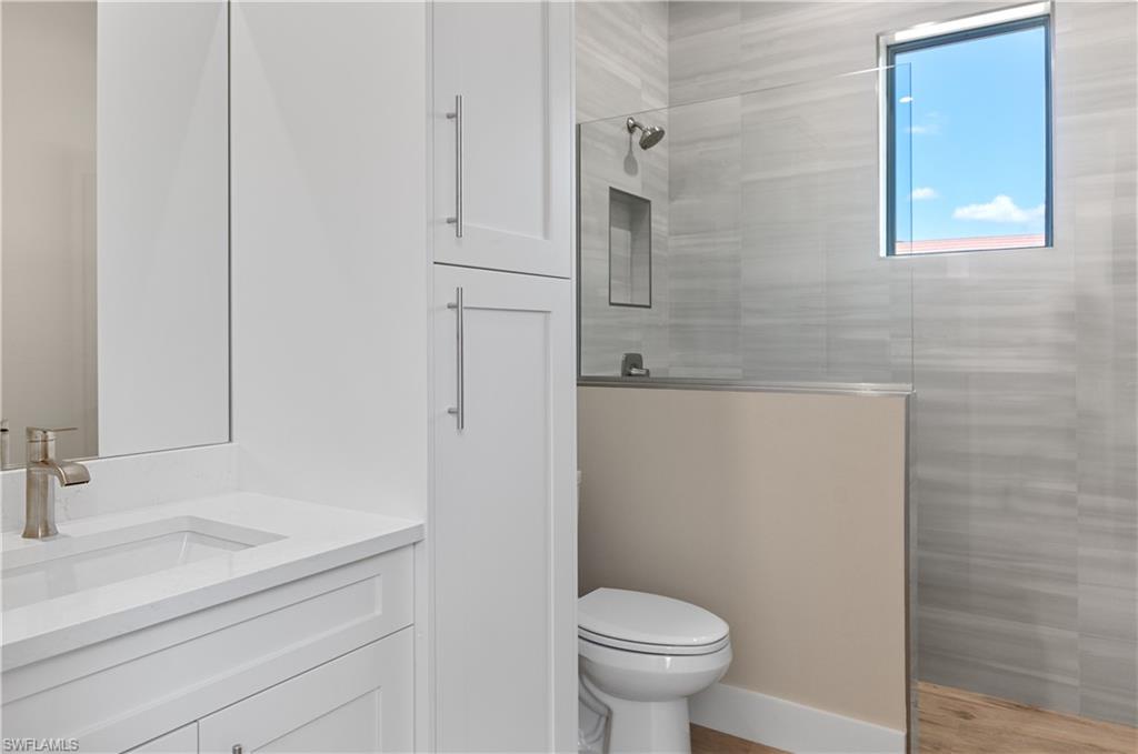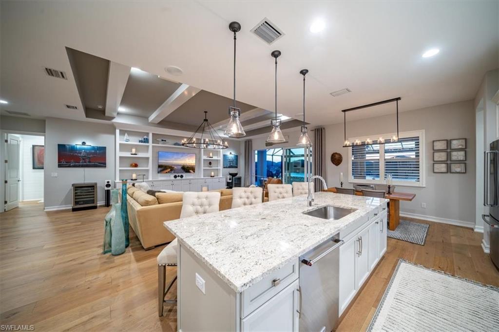 Stunning coastal-inspired home in Naples Reserve. This sophisticated coastal residence, built in 2022, is a perfect example of elegant living in the desirable Naples Reserve community. Offering four bedrooms or three plus den, three full baths, and 2,467 square feet of thoughtfully designed space, the popular Wisteria floor plan by Stock Development balances style, comfort, and functionality. A spacious three-car garage, enhanced with insulated doors, custom cabinetry, and a mini split air-conditioning unit, adds everyday convenience. Some of the interior highlights include extensive upgrades which set this home apart, including Storm-Smart hurricane shutters, a whole-house Generac generator, and impact-resistant windows and doors. Inside, refined details abound such as 9-inch crown molding, solid wood doors, prefinished hardwood flooring, plantation shutters, custom closet systems and professionally designed finishes throughout. The kitchen is a culinary showpiece with quartz countertops, upgraded cabinetry and hardware, pot filler, KitchenAid front-door refrigerator, and high-end appliances. Convenient cabinet for entertaining with bar refrigerator and glass-front cabinetry. A custom great room with beamed ceiling and built-in wall system with lighting provide ideal spaces for entertaining or relaxing. All baths are beautifully finished with wallpaper, bidets, custom tile accents and upgraded cabinetry. Moving to the stunning outdoor living space, the one-of-a-kind lanai is more than exceptional and designed as an extension of the home’s interior comfort. Features include a saltwater pool and spa with rock water element, umbrella stand, and Pentair system, travertine tile flooring, wood plank ceiling, fireplace, custom bar and grill area, and overhead speaker system. A tumbled rock waterfall accent and lush landscaping with custom lighting create an extraordinary outdoor environment that beckons from the moment you enter the home. The primary bedroom suite offers a custom-designed walk-in closet, elegant bath with upgraded cabinetry, and a spacious shower and soaking tub, blending luxury and practicality in a gorgeous environment. The beautiful guest bedrooms and bath have convenient access to the lanai without going through the living area. Naples Reserve provides an unmatched lifestyle with resort-style amenities including pickleball, tennis, bocce, volleyball, a state-of-the-art fitness center, two dog parks, boating, full-service dining, poolside tiki bar and a full-time social director. Between downtown Naples and Marco Island, the home is minutes from beaches, golf, shopping, dining and water recreation. Professionally decorated and meticulously maintained, this residence is must-see.