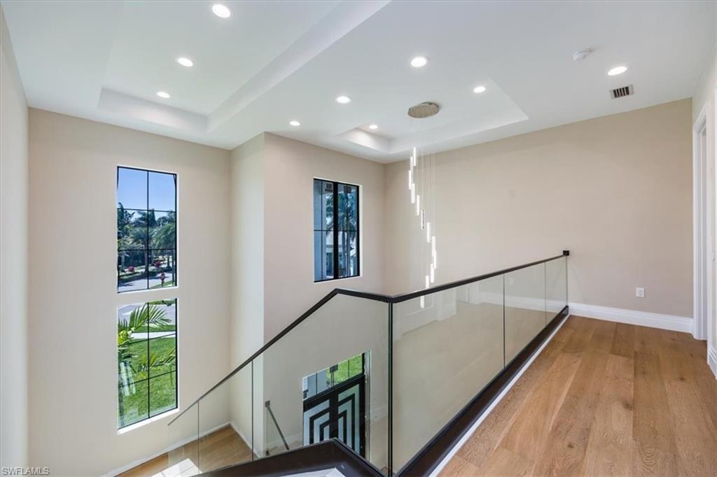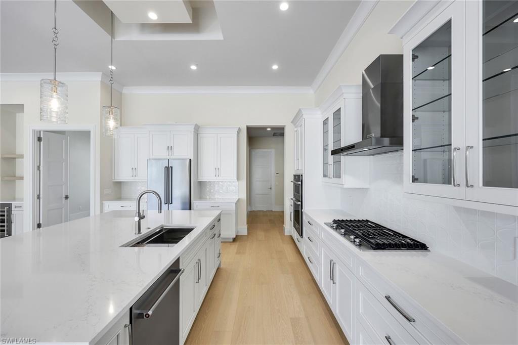Brand-New Construction Lakefront Luxury in Parrott Cay at Naples Reserve: This stunning new-build on a premium corner lot offers panoramic lake views and exceptional craftsmanship throughout. From the moment you enter through custom double doors, you're greeted by soaring ceilings, solid wood floors, and a dramatic glass-railed staircase. Every detail has been thoughtfully curated—from the fluted tile fireplace and LED-lit ceiling accents to the climate-controlled wine display and designer lighting. The gourmet kitchen features custom cabinetry, a hidden walk-in pantry, waterfall-edge countertops, full-height backsplash, and high-end Thor appliances—including a built-in coffee maker. Blue accent cabinetry adds a bold, modern touch echoed throughout the home. The spacious owner’s suite includes two oversized walk-in closets with built-ins and a spa-style bathroom with soaking tub, double vanities, and a multi-head walk-in shower. Upstairs, three guest bedrooms each offer en-suite baths and walk-in closets, with two opening onto a full-length balcony overlooking the lake. A large family room with built-ins and a second fireplace completes the upper level. Outdoor living is elevated with a panoramic screened lanai, custom pool, and a fully equipped summer kitchen featuring a sink, ice maker, and beverage fridge. The home also includes a full security system with cameras for peace of mind. Located in the prestigious, guard-gated community of Parrott Cay, residents enjoy resort-style amenities including bocce, tennis, beach volleyball, a lakeside firepit, and a Tiki Bar. Just minutes from Marco Island, Fiddler’s Creek Publix, and downtown Naples.