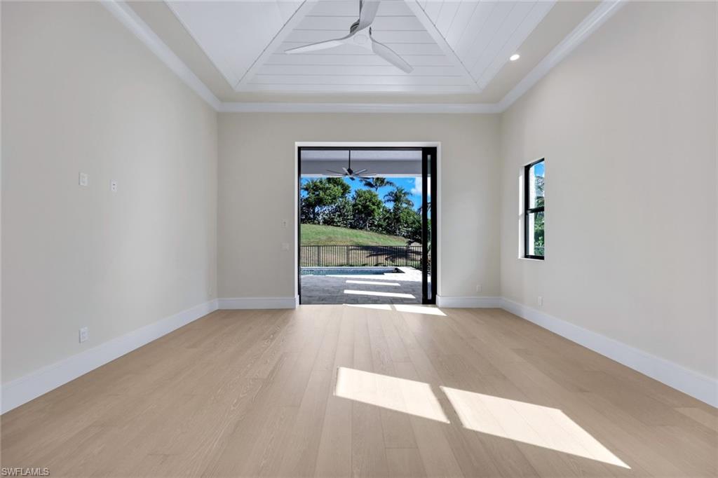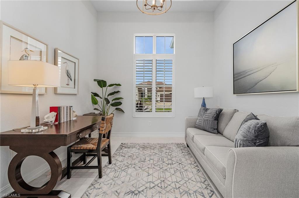 Welcome to Crane Point at Naples Reserve! One of Naples’ most popular communities where luxury and laid-back living meets vacation-style amenities. This custom Stock Development "Madison" model captures the best of Florida living with peaceful lake and private preserve views on "rowing Lane". Designed for both family comfort and versatility, this 2971 sqft-4-bedroom plus den, 4.5-bath home, offers a spacious retreat for everyone. From the moment you step inside the foyer, you will notice statement designer lighting, dramatic 16-foot ceilings with custom wood tray accents and expansive glass sliders with a bee-line to SPECTACULAR VIEWS. Wood-look tile dresses the main living areas while a coastal palate of blues accent the walls. The dining area is nestled in a perfect location for bird watching and tranquil views of the lake. The gourmet kitchen stands as the heart of the home with quartz countertops, top-tier appliances with a gas range, a wine cooler, and generous cabinetry for effortless storage. Each guest suite features its own ensuite full bath- offering privacy for friends and family. The primary suite features his/hers custom walk-in closets and a spa-style bath in the master bathroom featuring a freestanding tub and glass-enclosed shower with two separate vanities. Step outside to an expansive lanai with a full outdoor kitchen/BBQ, dining setup and multiple lounging spaces with a panoramic screen that perfectly frames some of Naples Reserves most sought-after views. Unwind in your very own lakeside custom pool & spa after a day of fun. A full outdoor bath with access into the main house allows for convenience and practicality. Other great features include plantation shutters throughout, a 500-gallon propane tank, impact-resistant windows and doors, a whole-house water purification system, Vitex Smart Home technology, storm smart electric shades to protect all exterior furnishings, a spacious laundry-room with upper/lower cabinetry & laundry tub, an air-conditioned three-car epoxied garage with Wi-Fi control and more. Naples Reserve also permits private boat slips behind certain homes—an uncommon luxury that brings lake life right to your backyard. Residents enjoy resort-style amenities including a lakefront pool and lap-pool, fitness center, tennis and pickleball courts, bocce, two dog parks, walking and biking trails, and 22 lakes for kayaking and paddleboarding. Exciting updates are on the horizon with the community’s new restaurant, tiki bar, and clubhouse renovation, set to debut in March 2026, promising an even more vibrant and social coastal lifestyle to this already fantastic community!! Just minutes to the Fiddlers Creek Plazas' Publix and several shops, 20 minutes to Marco Island and 20 minutes to downtown Naples restaurants and white-sand beaches!