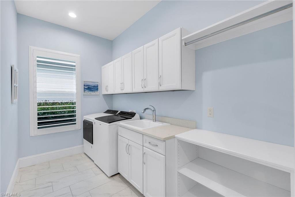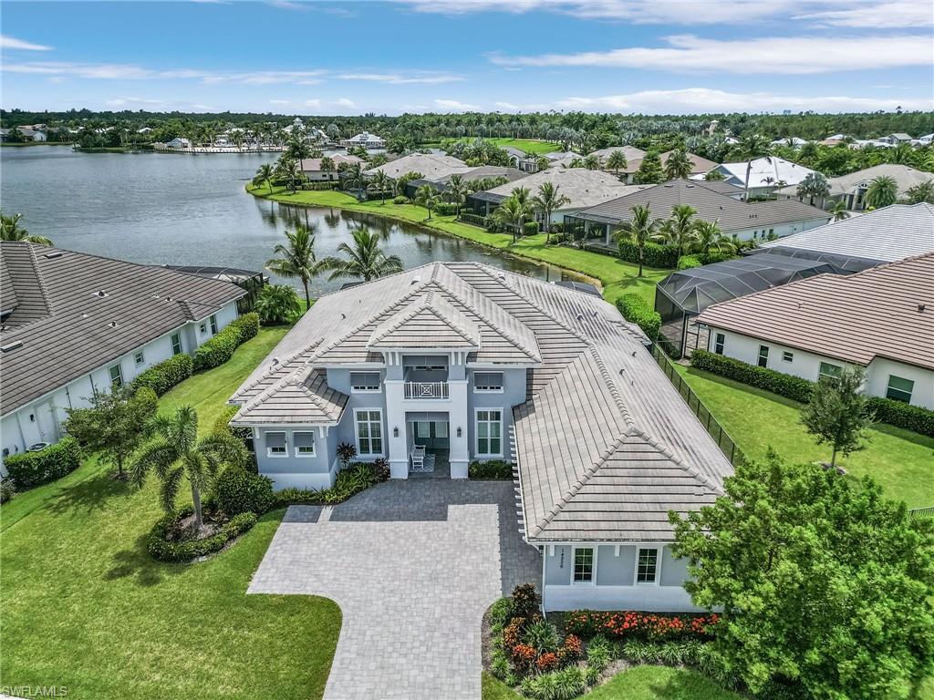 Coastal luxury describes this spectacular new Stock Homes Madison Model on one of the best lots in Naples Reserve, offering panoramic lake views & nightly sunsets. This exquisite 4 bedroom plus den, 4.5-bathroom home dazzles with 16-foot ceilings adorned with custom woodwork, upscale designer lighting, 30-inch porcelain tile and Montage wood flooring. Plenty of room in this sizable laundry room with built-in cabinetry, with ensuite bathrooms in each guest room, state of the art Xfinity Home security system, air-conditioned two car garage, water purification system, an upgraded fiberglass Advisar hurricane impact entry door, impact-resistant windows, plantation shutters, large white custom-built cornices ensconcing electronic shades and much more. The chef's kitchen is a masterpiece featuring quartz countertops, custom-designed pantry, top-of-the-line appliances, and extensive cabinetry. Enjoy entertaining under the crystal chandelier as you gaze out onto the serene lake. The master suite is a sanctuary with dual walk-in custom closets with quartz countertops and a spa-inspired bathroom, complete with a freestanding soaking tub and a walk-in shower enclosed in glass. All bedrooms feature custom upgraded closets and wood flooring. The expansive lanai is an outdoor paradise, boasting a panoramic sixty-foot pull screen for unobstructed views, generous lounging and dining spaces with marble pavers, and a fully equipped outdoor kitchen with an expansive granite wall and Vintage grill. The living room boasts a navy shiplap feature wall with all bedrooms with upgraded fans. The outside facade of the house also features genuine shiplap and Coppersmith sconces with African orchids and expansive tropical landscaping with upgraded irrigation system. The garage and finished attic are insulated with climate control and feature custom organization and cabinetry. Residents of Naples Reserve enjoy access to a state-of-the-art fitness center, a resort-style lakefront pool and beach, two dog parks, bocce, tennis, pickleball courts, dining options, walking and biking trails, a childrens play area, and 22 lakes for a wide array of water sports.