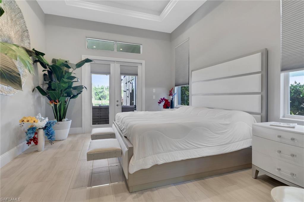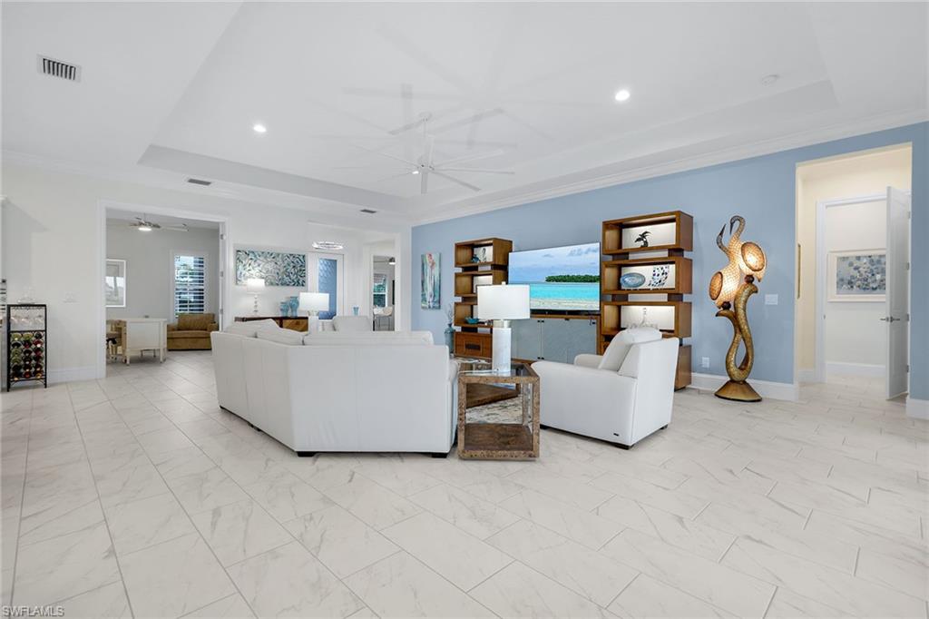 Welcome to a rare opportunity in the boutique community of Naples Reserve, where sophistication blends seamlessly with relaxed coastal living. Crafted by Stock Development, and showcasing the distinctive touches of Linda Burke Interiors, this beautiful home sits on an oversized lakefront lot, offering panoramic water views and direct access to two large lakes. For those dreaming of water recreation, a private boat dock may be built, elevating your Florida lifestyle to new heights. From interior luxury living, to the spacious lanai and pool area, this home is designed for discerning buyers who want both style and quality. Featuring 12-foot tray ceilings, expansive impact-rated windows and doors, you may entertain effortlessly in the chic, beautifully styled great room or transition to the spacious lanai where your custom Smokey Stone outdoor kitchen, dramatic waterfall pool and spa, and inviting firepit create a sanctuary. The oversized outdoor dining space is dramatic with the full kitchen, panoramic view cage, custom awning and cozy fire pit. Step inside to discover a chef’s kitchen distinguished by quartz countertops, designer cabinetry and high-end gas appliances with a cook-top range and custom designer hood. This pristine and beautifully decorated home offers the finest in finish details including plantation shutter window treatments. The primary bedroom suite is a tranquil retreat with a spa-inspired bath and dual custom designed walk-in closets. Charming French doors open to the lanai and pool area. Three guest bedrooms, a bright and spacious den and a formal dining area ensure space and privacy. The lighting throughout is custom and superior. Recently appraised for more than $2.1 million and offered with furniture negotiable, this wonderful four-bedroom plus den home requires no flood insurance. Note the immaculate three-car garage with air conditioning, extra insulation and epoxy flooring along with SunGuard tinted windows throughout, plus additional landscaping and outdoor lighting. Don't forget the 500-gallon propane tank which powers the whole-house generator and both kitchens. Every feature, from tinted SunGuard windows to professionally designed landscaping and outdoor lighting reflects luxury without compromise. With no flood insurance required and a recent high value appraisal, energy efficient upgrades, new custom-built closets and designer touches, this home offers both investment confidence and security in today's market. Enjoy a drive in the six-person golf cart (also negotiable). Naples Reserve is a sought-after community offering robust social and sports activities, a newly remodeled restaurant and kitchen, pickleball, tennis, tiki bar, a lakeside marina, a resort-style pool, a clubhouse and an activity-filled fitness center. The Marco Island lifestyle of beaches and boating are minutes away, as is the pleasure of fine cuisine in Old Naples. More than a home, it's an invitation to escape to your own paradise in Naples, FL.