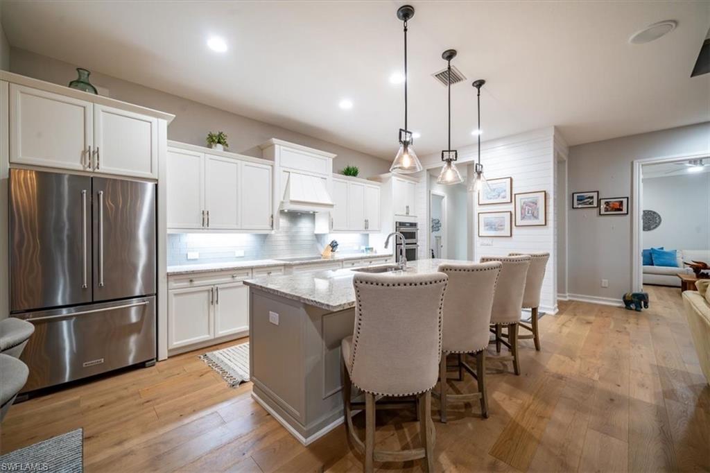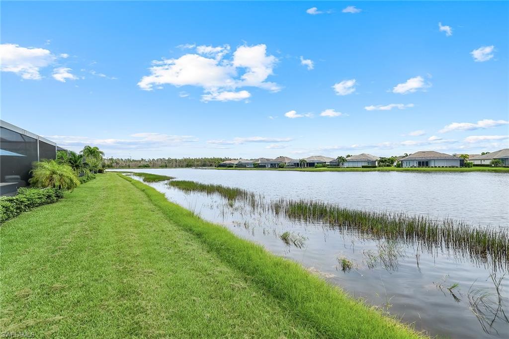 Experience the ultimate in luxury and resort-style living in this exceptional 2019 Stock-built Marathon 3 floor plan home. Perfectly situated on an oversized western exposure lot with breathtaking sunset views over the lake. Spanning 4,050 total sq. ft. of indoor and outdoor living space. Gorgeous wide plank white oak engineered hard wood flooring throughout much of the home. This meticulously upgraded home offers 3 bedrooms plus an office/den, 3.5 baths, soaring volume ceilings, and an open-concept great room with media wall with open and closed storage. The gourmet kitchen is a chef’s dream, featuring an expansive island, KitchenAid appliances, a walk-in pantry, tiled backsplash and so much more. The primary suite is a private retreat with custom his-and-hers closets and a spa-like bath with a freestanding tub and walk-in shower with seamless shower doors. Smart home technology allows you to control so much with apps and Alexa technology. Step outside to an oversized saltwater pool, integrated spa, summer kitchen, panoramic screened lanai, and custom pool lighting, plus electric storm smart fabric Kevlar screens to close off the covered lanai space which are all designed for relaxation and entertaining. Additional upgrades include a whole-home generator, impact windows, an upgraded electrical panel, an instant hot water heater, enhanced landscaping, and a 3-car extended garage with epoxy flooring, and electric keypad entry. This home is also able to add a dock at the rear of the property if you so desire. Nestled within the exclusive, gated community of Naples Reserve, this home offers low HOA fees and access to world-class amenities, including a resort-style pool, tiki bar with food and beverage service, state-of-the-art fitness center, bocce, pickleball, tennis, sand volleyball courts, a lakefront beach, marina, kayak and electric boat rentals, scenic walking and biking trails, two dog parks, and a vibrant social calendar managed by an on-site Lifestyle Director. Whether seeking tranquility or an active social scene, Naples Reserve delivers the perfect balance. This move-in-ready masterpiece offers an unparalleled lifestyle.