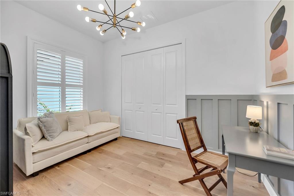 Enjoy the ultimate in luxury coastal living with this new, never-lived-in single-family pool home offering a rare combination of modern design, lakefront views, and a prime central Naples location with no HOA fees. Sitting at a high elevation of 14.8 feet, this property provides peace of mind and added security. Just minutes from world-renowned beaches, shopping, dining and top attractions, this stunning residence was custom-built in 2025 by Kaye Lifestyle Homes and professionally furnished, with furnishings negotiable. Designed for full-time living and high-end investment potential, this open-concept four-bedroom, three-bath home features a flat tile roof, soaring 12-foot tray ceilings, wide-plank hardwood floors, and hurricane-impact glass windows and doors throughout. The great room impresses with custom wall detailing and glass sliders opening to tranquil lakefront views. The gourmet kitchen offers white soft-close cabinetry, quartz countertops, a tile backsplash, pendant lighting and a large island with bar seating. A spacious walk-in pantry and new stainless steel appliances, including range, refrigerator and freezer, microwave, and dishwasher, complete the space. The adjacent dining area overlooks the water and provides direct lanai access. Go outside to a private, resort-style lanai featuring covered outdoor living with two modern ceiling fans and a custom outdoor kitchen complete with a built-in stainless steel barbecue, mini refrigerator and sink. The open heated pool and spa, built by Summit Pools, are surrounded by a fully fenced brick paver deck with unobstructed lakefront views, allowing you to enjoy stargazing nights without a cage. A dedicated pool bath provides added convenience for outdoor living. The luxurious owner’s suite offers peaceful lake and pool views, a 3D textured accent wall, two walk-in closets with built-ins and a spa-inspired bath with dual vanities, quartz counters, soaking tub and a walk-in shower with textured tile, rain head, niches and private windows. One guest bedroom has its own en-suite bath with a walk-in shower that also functions as a pool bath, while the remaining guest bedroom is served by a full bath with a custom tile shower and tub combination. The spacious layout includes a versatile fourth bedroom that can also serve as a den, office or study, complete with a closet, modern light fixture and double door entry. Additional upgrades include white plantation shutters throughout, custom trim and baseboards, washer and dryer with utility sink, epoxy garage flooring, Ring doorbell, Arlo camera system and pre-wiring for a generator. Seller offers transferable flood insurance, along with a 10-year builder warranty and 2-10 Home Buyers Warranty coverage for added peace of mind. In desirable Twin Lakes, this lakefront home offers exceptional convenience with no HOA, ideal as a luxurious residence or smart investment.