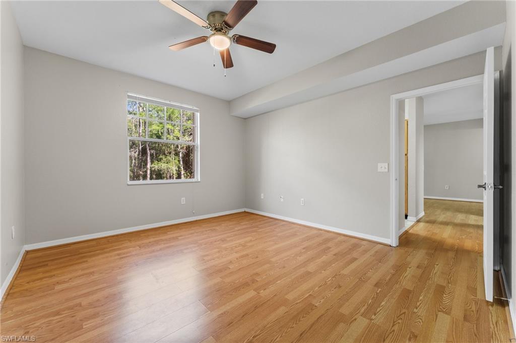 Spacious and elegant first floor 1 bedroom / 1 bath condominium comes with wood flooring in the living area and bedroom and a beautifully renovated modern shower. The condominium comes with a serene and private view, an eat-in kitchen, wood grain cabinets, a breakfast bar that opens up to the living/dining room, a huge walk-in closet in the bedroom and a walk-in laundry room with tons of room for storage! Fairway Preserve has outstanding amenities including a clubhouse with fitness center, swimming pool, spa, racquetball court and a tiki bar. High speed internet, pest control and valet trash removal are included in the HOA fee. Fairway Preserve is a gated community and is only 2 miles from 75 on Immokalee Road.