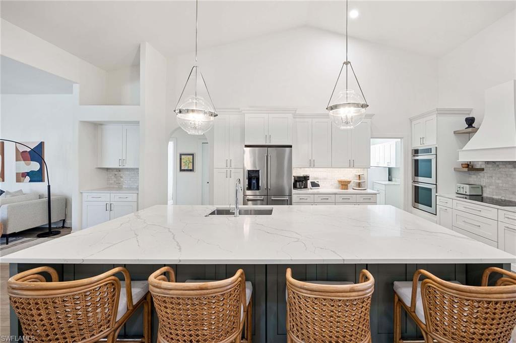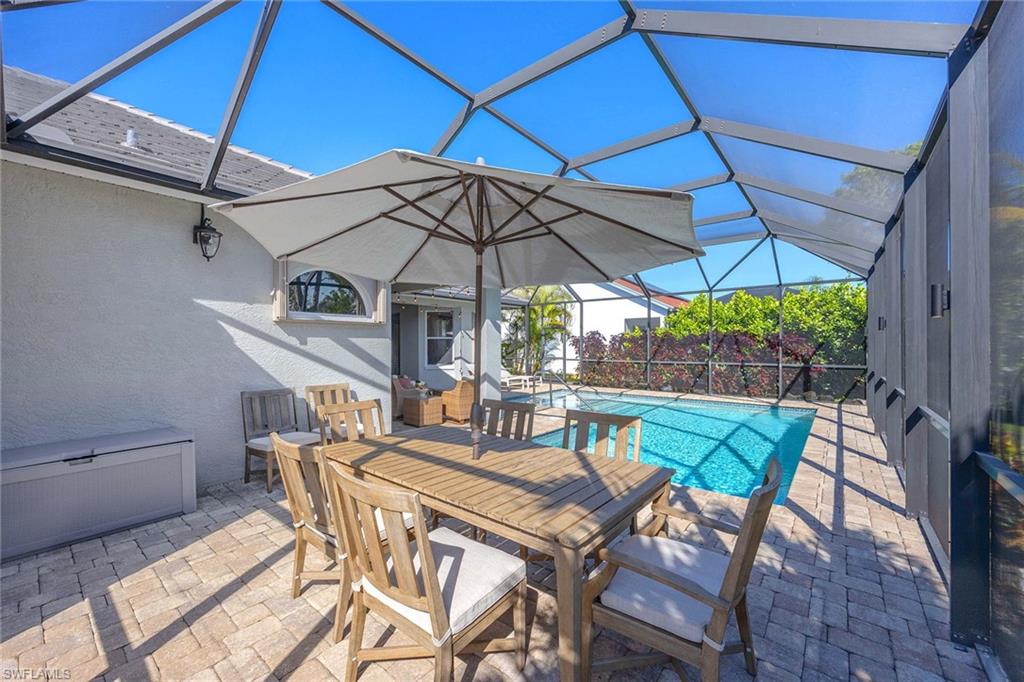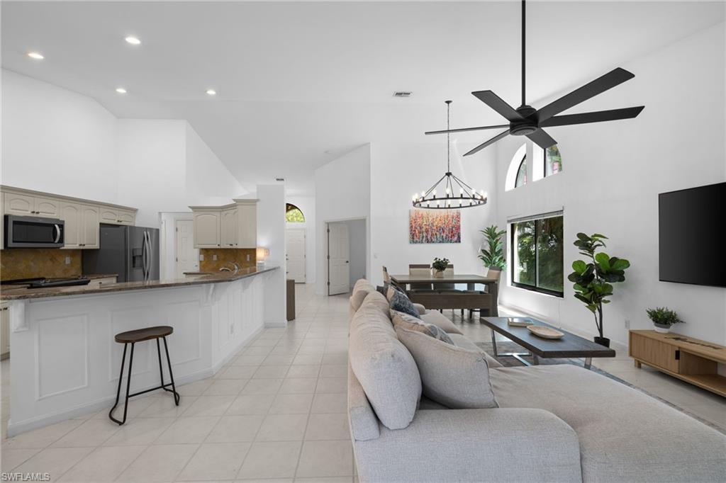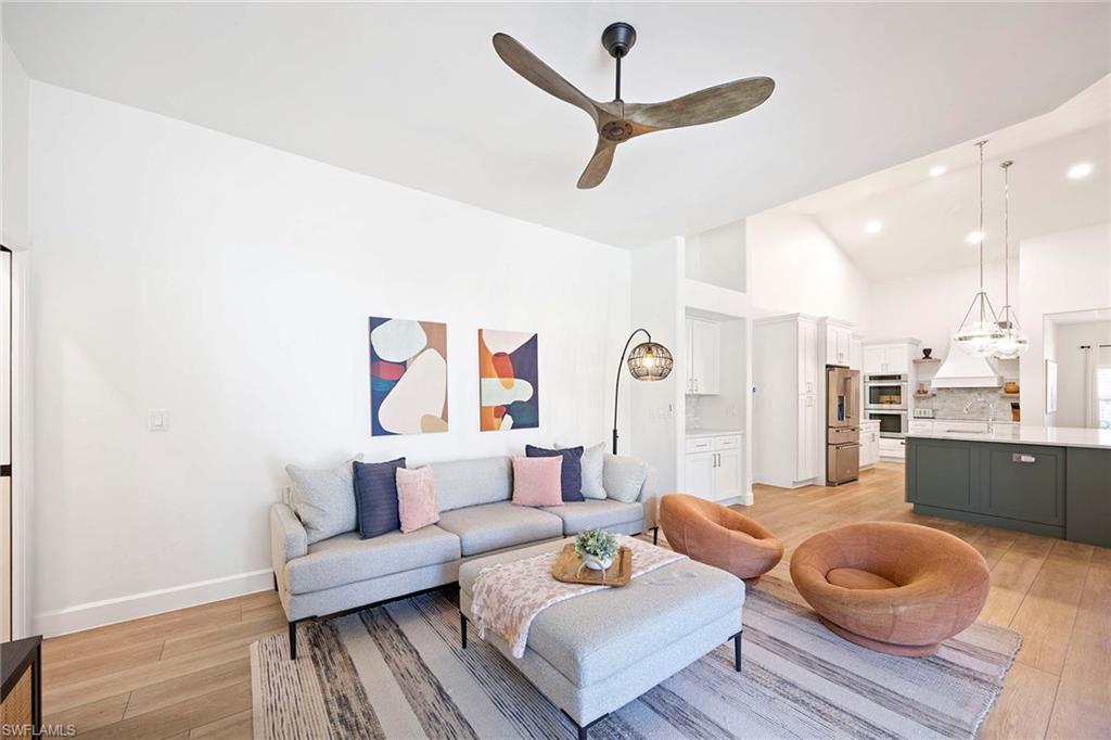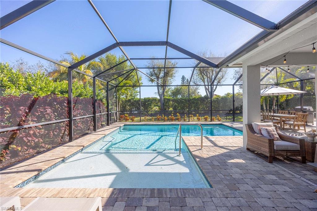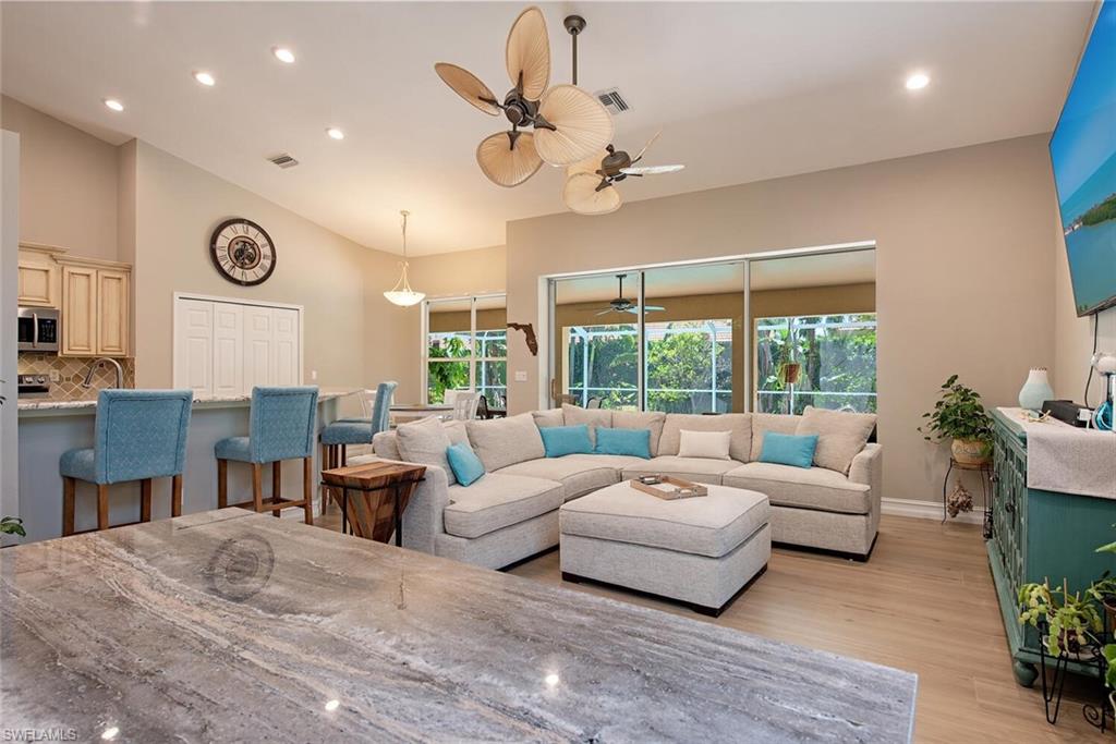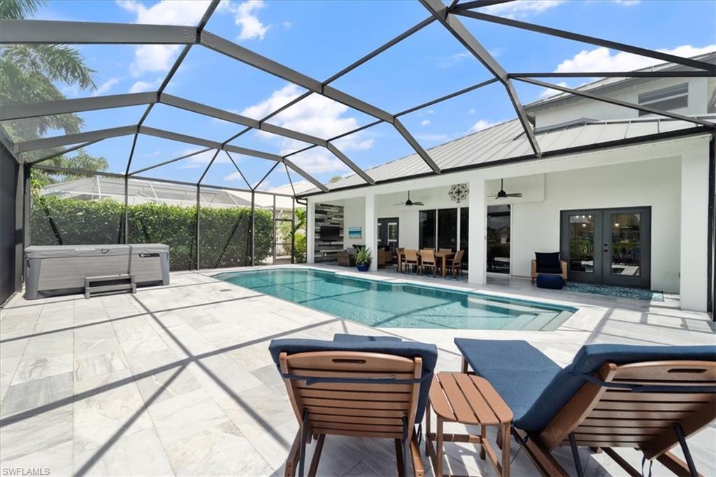 An open-concept great room with vaulted ceilings enhances the spacious and inviting ambiance of this home. Designed for entertaining, the reimagined floor plan features an elevated chef’s kitchen with top-of-the-line appliances, sleek quartz countertops, an 8-foot statement island, double-wall ovens and marble backsplash. A formal dining area and welcoming foyer flow seamlessly for effortless gatherings. Luxury vinyl plank flooring, new recessed lighting and modern fixtures elevate the interiors. A family room off the kitchen offers an additional retreat, with both spaces opening to a private outdoor oasis. The saltwater pool, therapy bench, shaded lounge and dining area create a resort-style setting. The oversized primary suite includes a remodeled en-suite bath with a glass-walled shower, soaking tub and dual vanities, plus lanai access and a flex space for work or hobbies. Three guest rooms and two baths ensure privacy and comfort. Additional highlights include a full-size laundry room and an epoxy-finished two-car garage. In The Orchards, a gated community with premier amenities, this residence is minutes from Mercato, top-rated schools and pristine beaches. Updates include a new roof (2019), new water-heater and whole-house water filtration (2024), upgraded electric panel for EV charging (2024) and more.