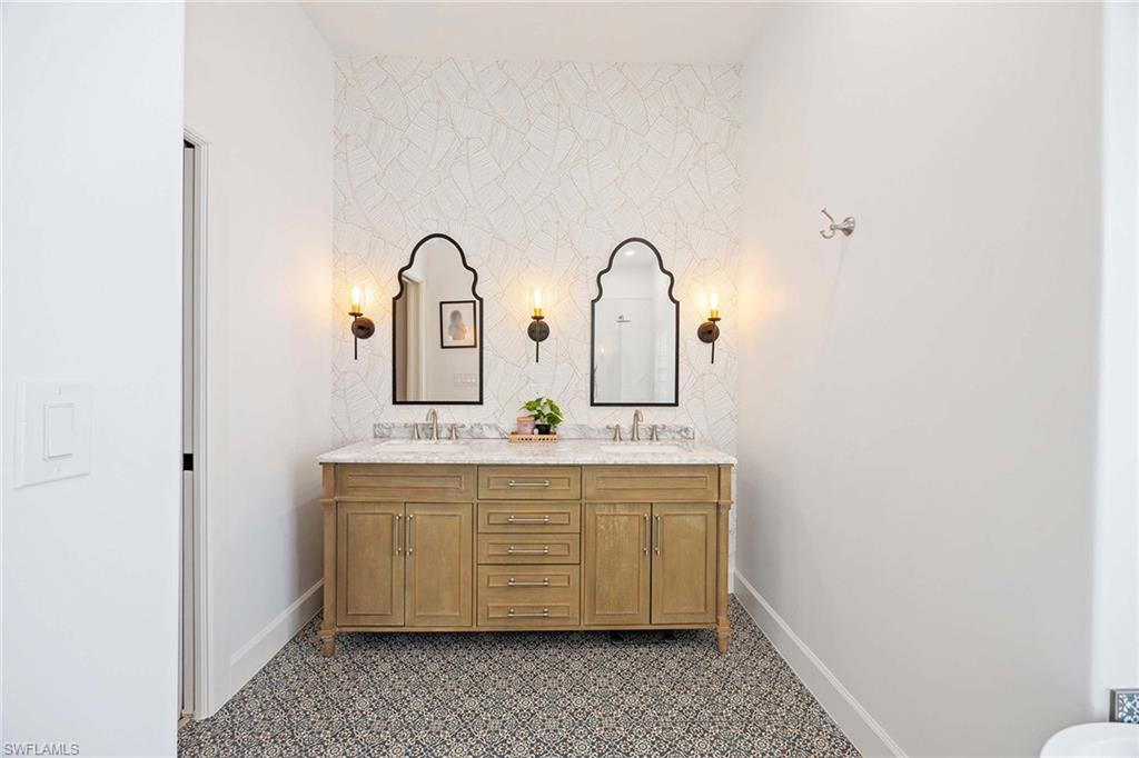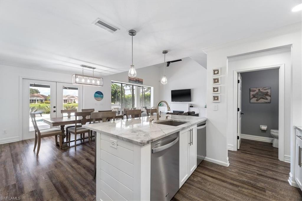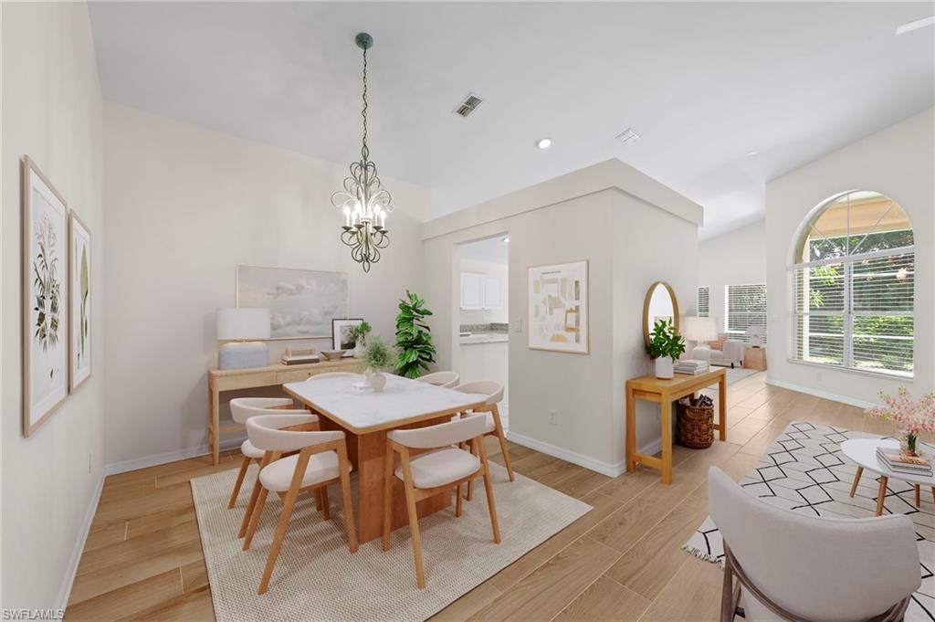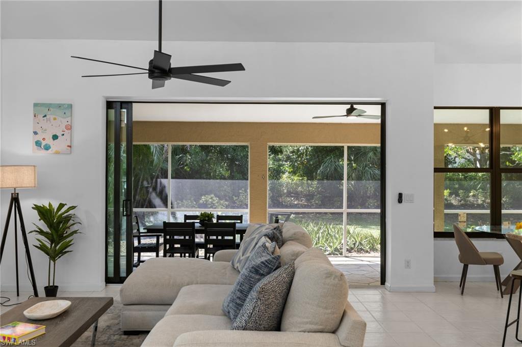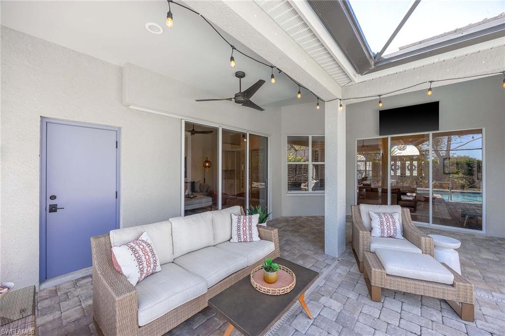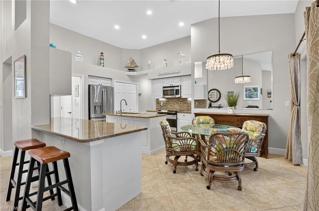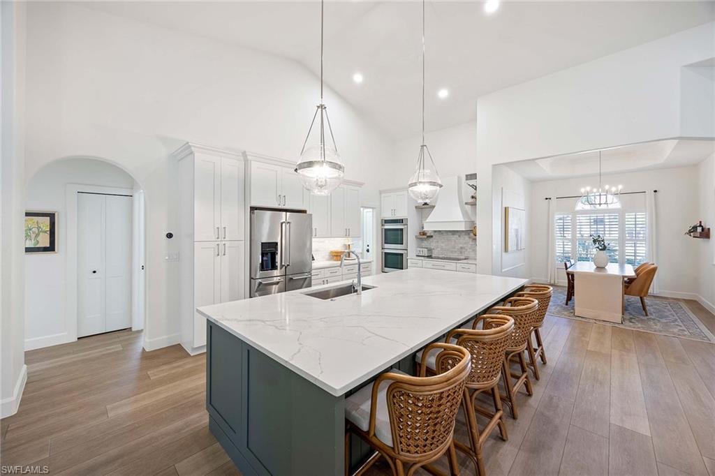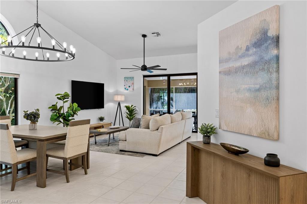 An open-concept great room with vaulted ceilings enhances the spacious and inviting ambiance of this home. Designed for entertaining, the reimagined floor plan features an elevated chef’s kitchen with top-of-the-line appliances, sleek quartz countertops, an 8-foot statement island, double-wall ovens and marble backsplash. A formal dining area and welcoming foyer flow seamlessly for effortless gatherings. Luxury vinyl plank flooring, new recessed lighting and modern fixtures elevate the interiors. A family room off the kitchen offers an additional retreat, with both spaces opening to a private outdoor oasis. The saltwater pool, therapy bench, shaded lounge and dining area create a resort-style setting. The oversized primary suite includes a remodeled en-suite bath with a glass-walled shower, soaking tub and dual vanities, plus lanai access and a flex space for work or hobbies. Three guest rooms and two baths ensure privacy and comfort. Additional highlights include a full-size laundry room and an epoxy-finished two-car garage. In The Orchards, a gated community with premier amenities, this residence is minutes from Mercato, top-rated schools and pristine beaches. Updates include a new roof (2019), new water-heater and whole-house water filtration (2024), upgraded electric panel for EV charging (2024) and more.