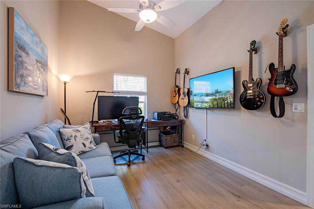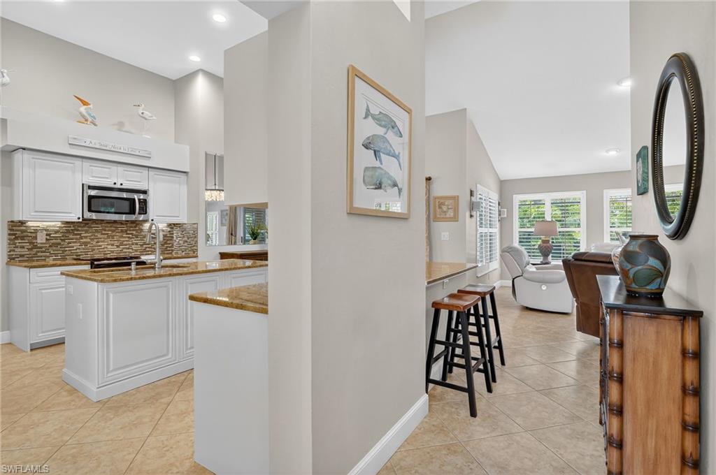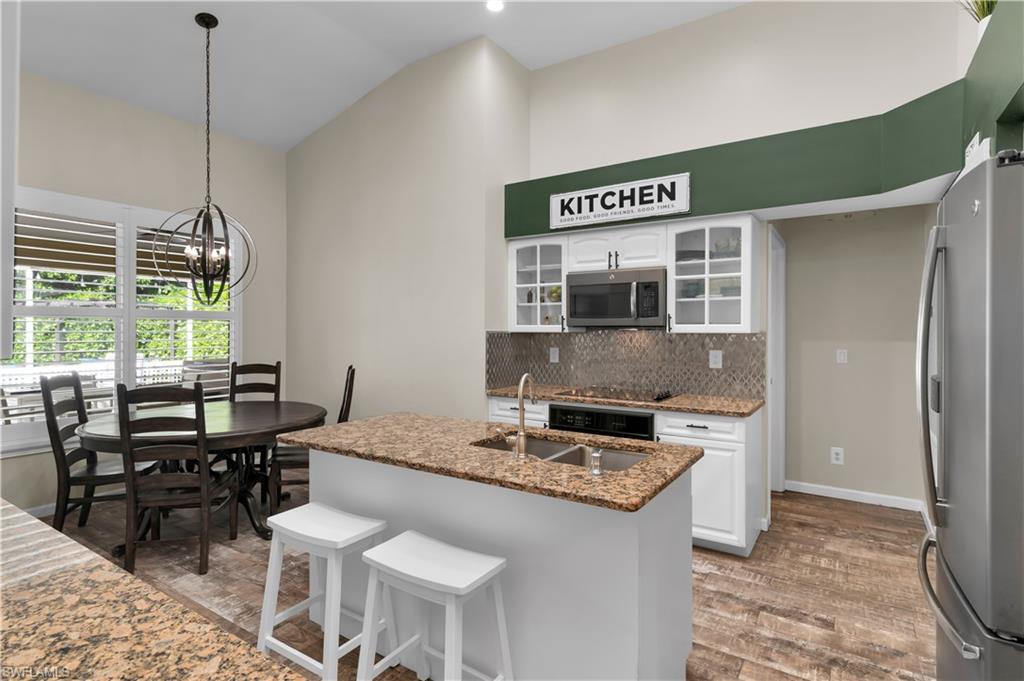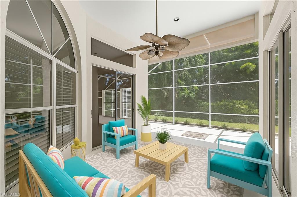 Welcome to an exquisite residence at 7550 Citrus Hill Lane in Naples, FL, where elegance meets comfort in this charming home. Spanning 2,412 square feet, this beautifully appointed four-bedroom, two-and-a-half-bathroom haven is nestled on a generous lakefront lot, offering an inviting sanctuary for discerning homeowners. Step inside to discover a welcoming ambiance with wood-like flooring gracing the main living area, setting a sophisticated tone throughout. The heart of the home, the stunning kitchen, is a chef's delight, featuring pristine white cabinets, luxurious quartz countertops, and a striking coastal blue/green backsplash that adds a touch of vibrancy and charm. You'll appreciate the sink reserve osmosis system for pure drinking and cooking water, complementing the whole-house water softener for enhanced comfort. Retreat to the serene master suite, where the master bathroom offers a spa-like experience with dual vanities, a spacious shower, and a relaxing soaking tub. The California closet provides ample space for a well-organized wardrobe. Designed for both work and play, this home includes a dedicated office space, catering to those who appreciate convenience and functionality. An AC duct air purifier ensures a healthy and fresh indoor environment. Step outside to the screened-in pool area, an ideal setting for relaxation or entertaining guests. Enjoy the tranquil views of the lake from the outdoor seating area, complete with a TV for ultimate leisure and enjoyment. The backyard is a true oasis, featuring an organic garden and several fruit trees, perfect for those who love fresh produce. The Orchards is a serene, gated enclave that promises an extraordinary lifestyle. Residents can enjoy a network of walking and biking trails, two heated swimming pools, a state-of-the-art fitness center, and courts for tennis and pickleball. Located in North Naples, close to shopping, dining, and SWFL's beautiful beaches, this home combines luxury and convenience with exceptional value, all while maintaining low HOA fees