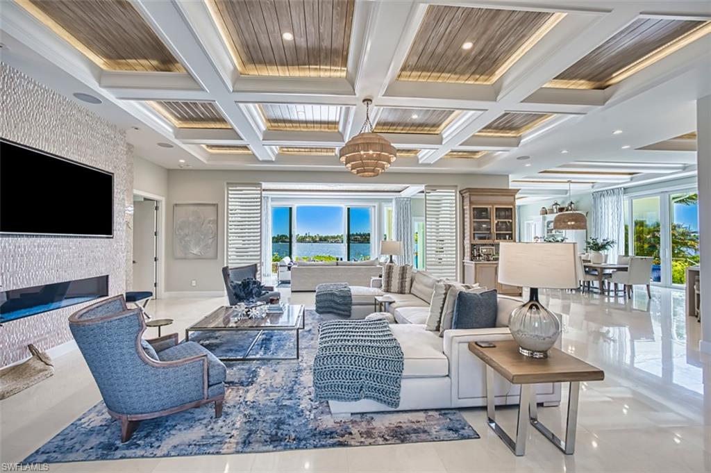 Offering spectacular waterfront living at it's finest is this crowning jewel of Jewel Box Avenue. Residing at the point of Chesapeake canal and Naples Bay stands this 4 bedroom en-suite estate with panoramic west facing water views from nearly every room. Owners will enjoy the first floor primary en-suite with 2 large walk in closets, huge primary bath with separate shower and soaking tub. Steps from the primary bed is a cozy outdoor sitting area with electric (remote controlled) retractable screens and shutters to enjoy the amazing sunsets over the bay. Guest will enjoy the second floor privacy with elevator access. Each en-suite has its own wrap around balcony access with spacious lounge areas and west facing water views. Additionally the second floor offers multiple en-suite wet bars, sitting area and media room that could easily be used as a 5th bedroom. Perhaps the star of the show is the nearly 8000 sq-ft of outdoor living space with waterfront infinity edge pool, 2 spas, outdoor kitchen, pool bath and multiple docks and boat lifts. Boaters will appreciate this section of Naples Bay is a no wake zone and the home resides well away from the channel marked area thus offering peace and quiet calm waters. Additionally the boat lifts have been strategically installed on the north canal side of the property offering further protection. The area has recently undergone extensive dredging and this property can dock larger vessels with a 24,000 lbs boat lift and 13,000 lbs jet ski/kayak platform lift. The list of upgrades to this home are extensive with a recent 7 figure renovation and refurnishing which WAS NOT a result of flooding or any storm damage. If you are looking for a well built turnkey waterfront property that lives like a high end resort 1340 Jewel Box should be considered.