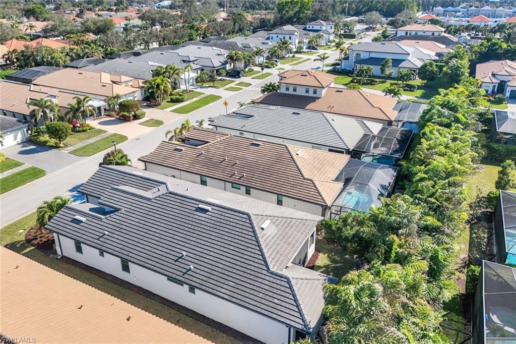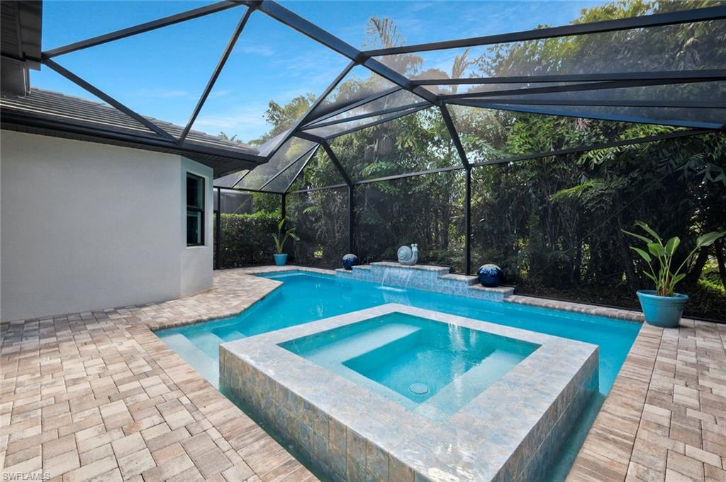 Tucked behind privacy hedges on a desirable corner lot, this residence in Palazzo at Naples boasts the largest lot with a rare rear yard. This beautifully appointed furnished 4 bed 4 bath plus loft home provides an exceptional blend of elegance, comfort, and indoor-outdoor living. Be sure to click on the lifestyle video! The extended screened lanai is a private paradise, showcasing a sparkling pool with a waterfall feature, spa, built-in gas fire pit, and multiple covered and open-air lounging and dining areas—ideal for sunset cocktails or starlit dinners. Inside, Sonos sound system surrounds you, the timeless tile floors flow throughout the open-concept layout. The soaring two-story design includes a great room that seamlessly connects to the gourmet kitchen, complete with a gas range, sprawling island, chic pendant lighting, and a walk-in pantry. Upstairs, a versatile loft/family room convertible to 5th bedroom accompanies a 4th guest bedroom and 4th full bath, while two additional guest bedrooms are downstairs, each of which enjoys its own bath. The spacious primary suite offers serenity and seclusion, featuring two walk-in closets and an ensuite bath with dual vanities, a soaking tub, and a separate glass-enclosed shower for a spa-like retreat. Designed with versatility in mind, this home provides ample space for work, relaxation, and entertainment and a home generator. Located in the gated enclave of Palazzo at Naples, residents enjoy proximity to white sand Gulf beaches, upscale shopping and dining at Mercato, world-class golf, and Southwest Florida International Airport. With only 85 architecturally distinctive homes, Palazzo is a tranquil, low-maintenance community that defines upscale Naples living. Memberships to nearby country clubs are available & not mandatory, making Palazzo a great choice.