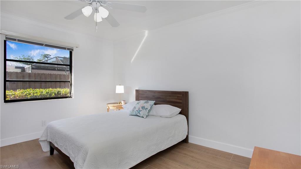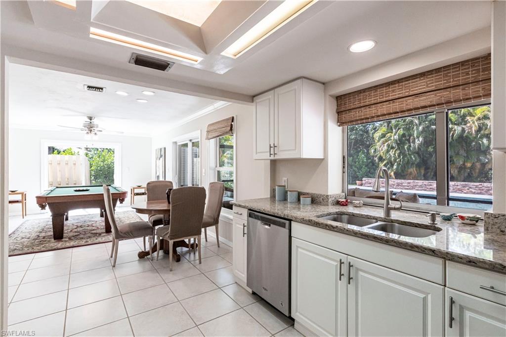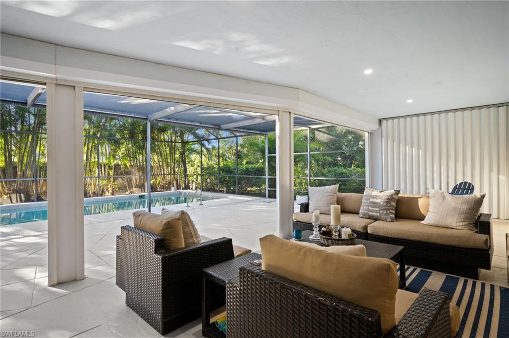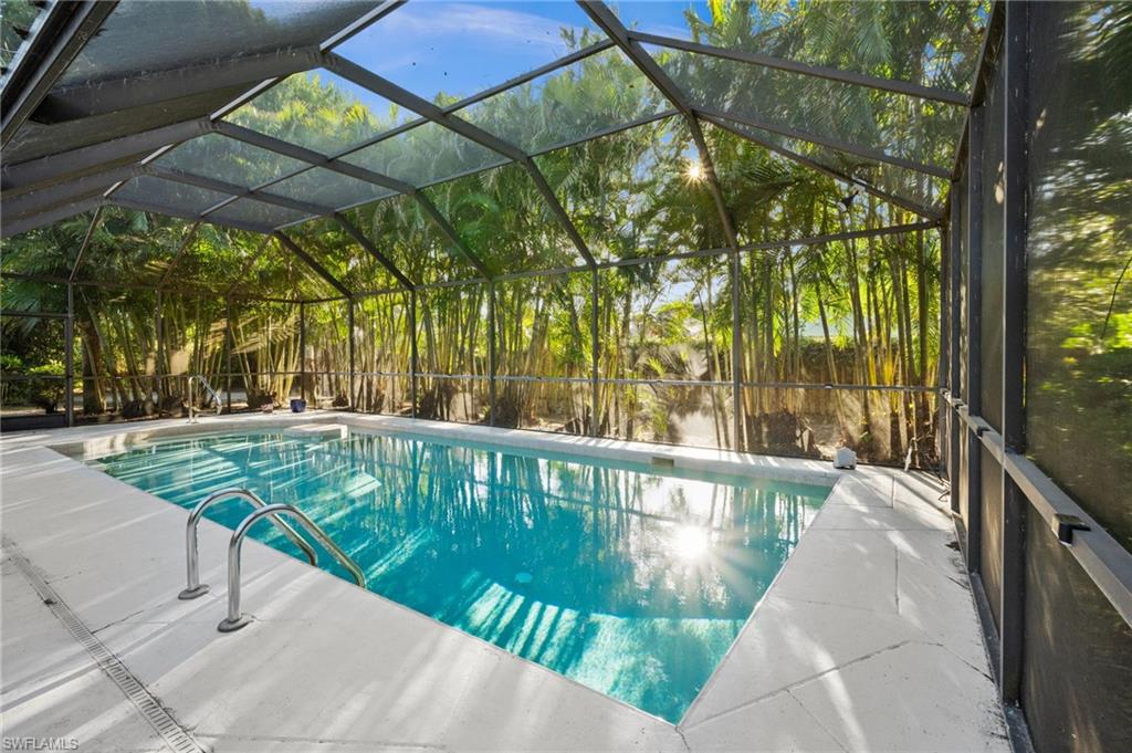 Move-in ready single-family, furnished pool home in the highly desirable Palm River community of North Naples! This single-story residence sits on a private, tree-lined .23-acre lot, offering a rare combination of privacy, tranquility, and room for expansion. The open-concept floor plan includes 3 bedrooms, 2 bathrooms, and a spacious 2-car garage with new epoxy flooring and extra storage. Inside, the updated kitchen features a waterfall island, modern cabinetry, and stainless steel appliances, flowing seamlessly into the living, dining, and great room. The primary suite offers a spa-style bathroom with a rain shower and custom jets, plus a large walk-in closet. Step outside to enjoy true Florida living on the screened lanai with a heated pool—perfect for year-round relaxation and entertaining. Recent updates include interior paint throughout, new window treatments, new landscaping, updated irrigation, and newer pool equipment. Offered fully furnished, this home is ideal for personal use or as a prime North Naples rental opportunity. With low HOA fees, coveted X flood zone (no flood insurance required), and just minutes to Vanderbilt Beach, Wiggins Pass, dining, shopping, and medical care—this Palm River pool home is hard to resist.