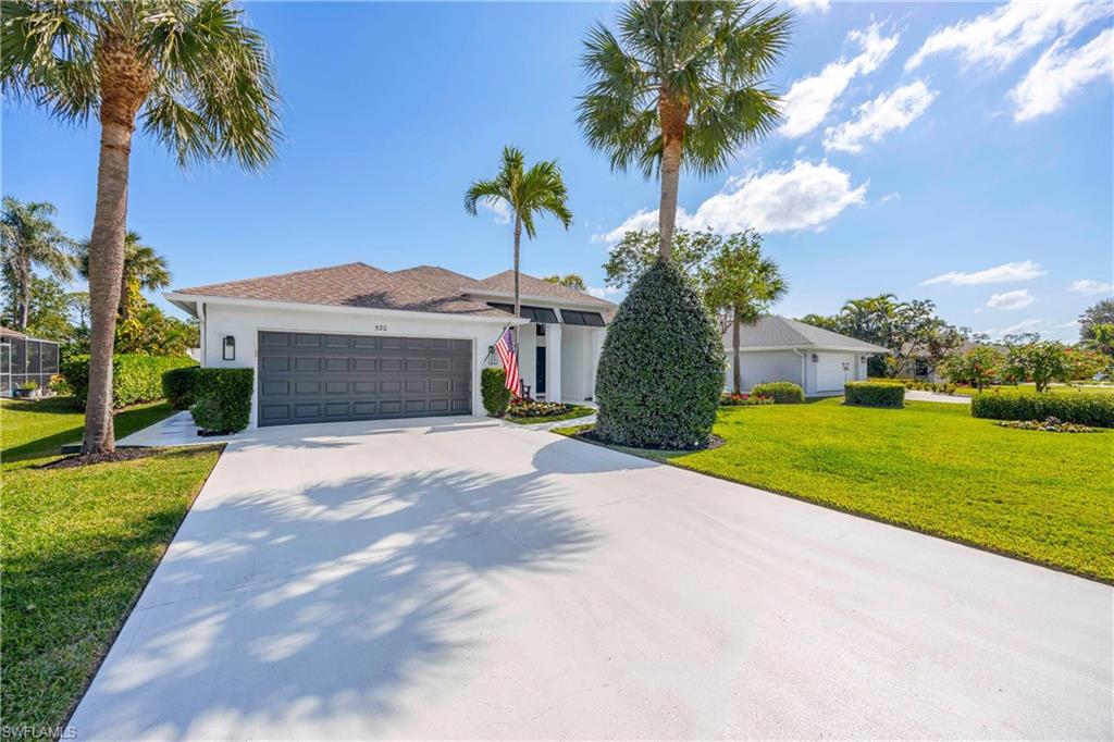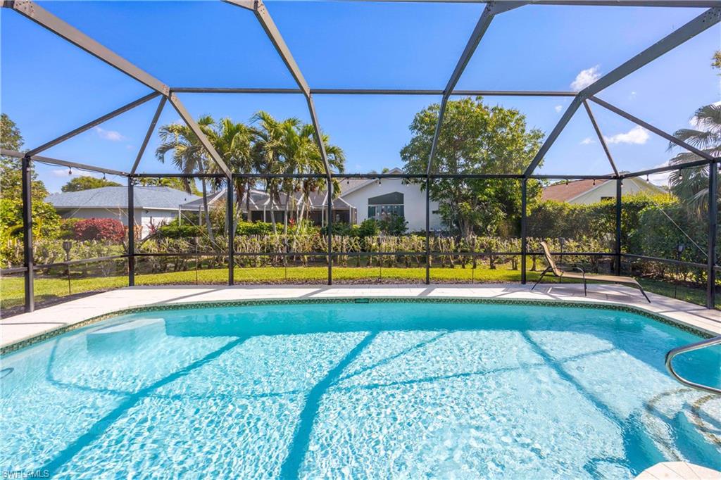 Discover this spacious four-bedroom-plus-den, three-bath single-family home offering 2,614 square feet of living space, one of the larger homes and lots in the community with .49 acres! The thoughtfully designed split floor plan provides privacy and flexibility for everyday living and entertaining. Recent updates include a new roof (2025) and a beautifully appointed travertine-tiled screened lanai with a sparkling pool featuring a sun-shelf and soothing water feature. The lushly landscaped yard is maintained with a well-fed irrigation system, adding efficiency and cost savings. On a quiet street in desirable North Naples, this property combines space, comfort and prime location. Close to shopping, dining and top-rated schools. A rare find offering exceptional value and lifestyle!