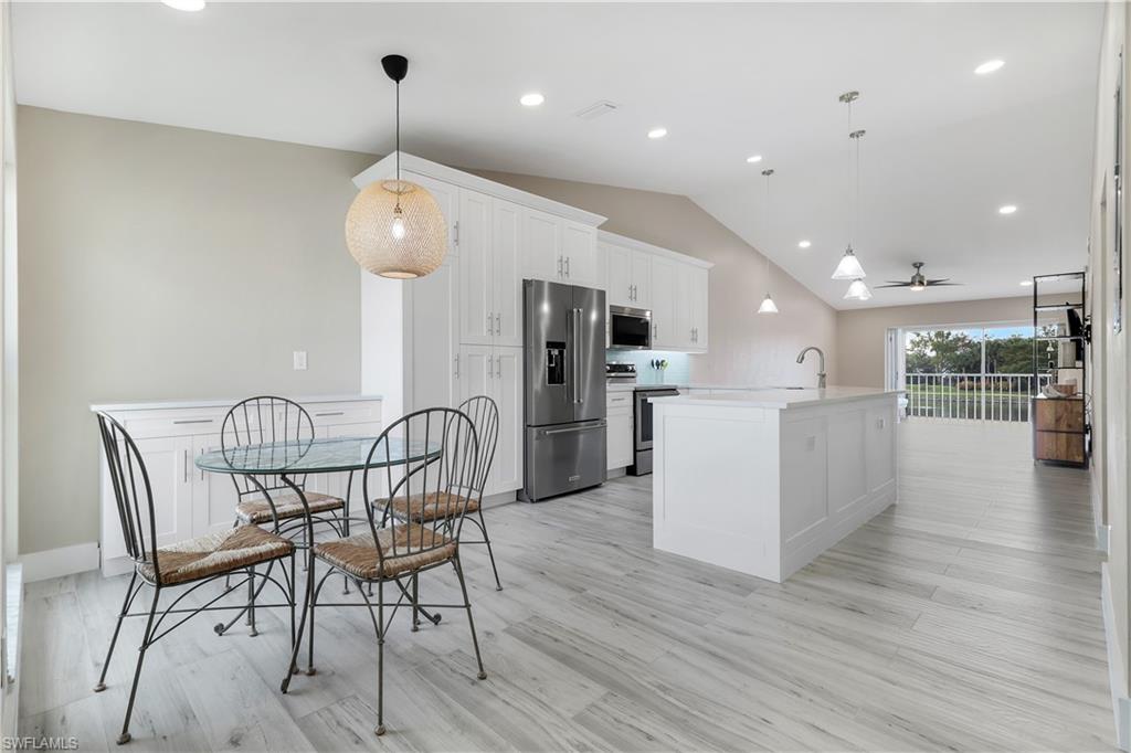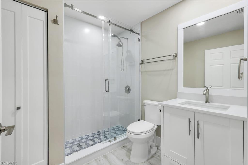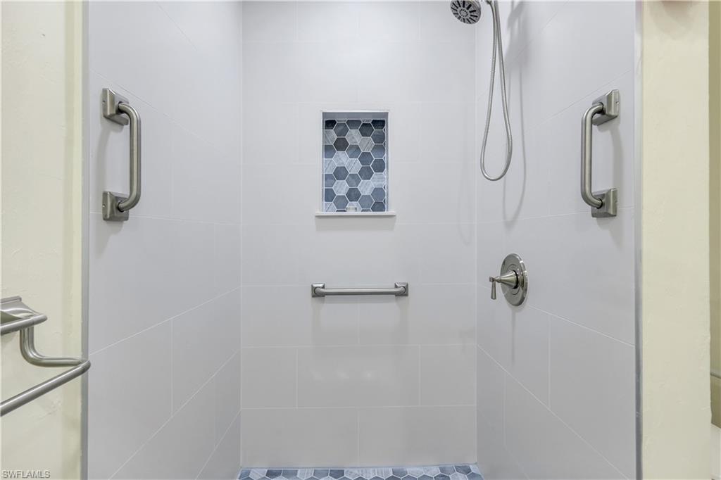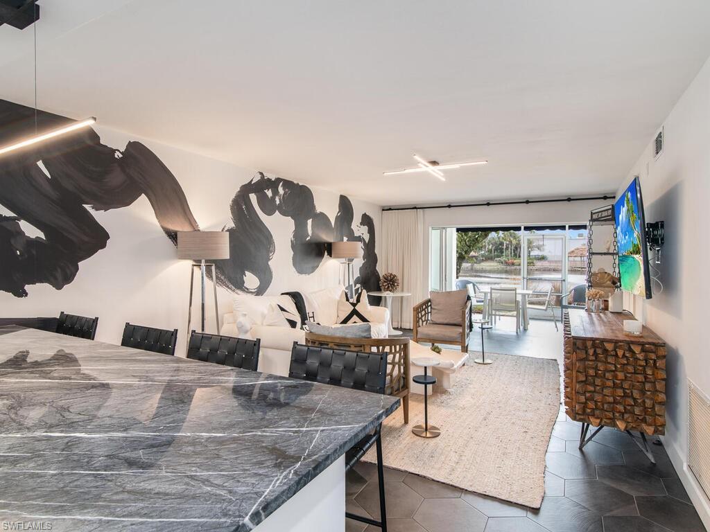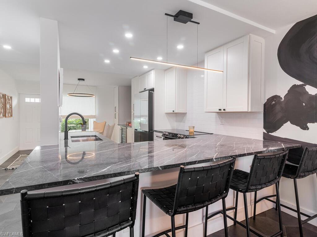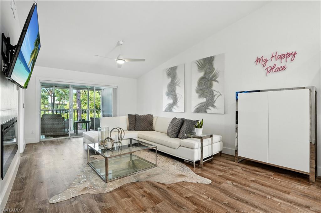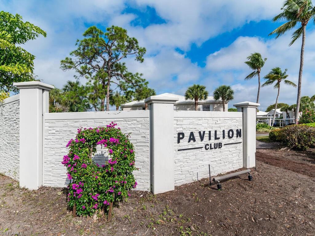 Completely remodeled and ideally located west of U.S. 41. This light-filled two-bedroom, two-bath home in the gated Pavilion Club offers upscale coastal living just blocks from Naples top shopping, dining and entertainment. The open-concept interior features plank tile flooring, white shaker cabinets, quartz countertops and stainless steel appliances. The spacious primary suite includes a walk-in closet, dual vanities and a glass-enclosed walk-in shower. Sliding doors from both the living room and primary bedroom lead to a screened lanai with an outdoor fireplace, overlooking a tropical setting. Enjoy unmatched walkability to Mercato, The Pavilion, Whole Foods, restaurants, movie theaters and a community park. Pavilion Club residents enjoy a community pool and private pedestrian gate to the Pavilion shopping center. Whether you're seeking a full-time residence, vacation getaway or investment opportunity, this home delivers luxury, location and low-maintenance living—all just minutes from the beach. No flooding during past storms, according to the owner.