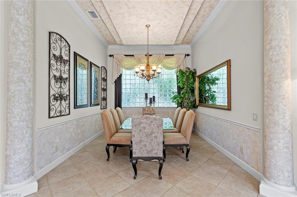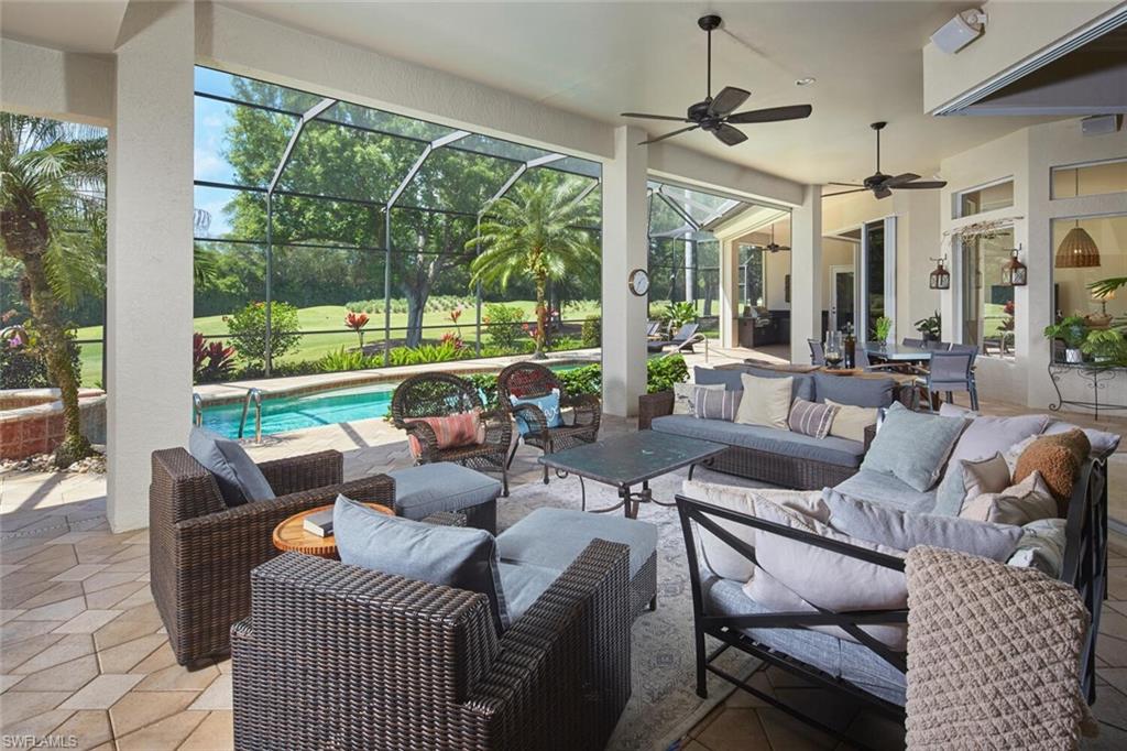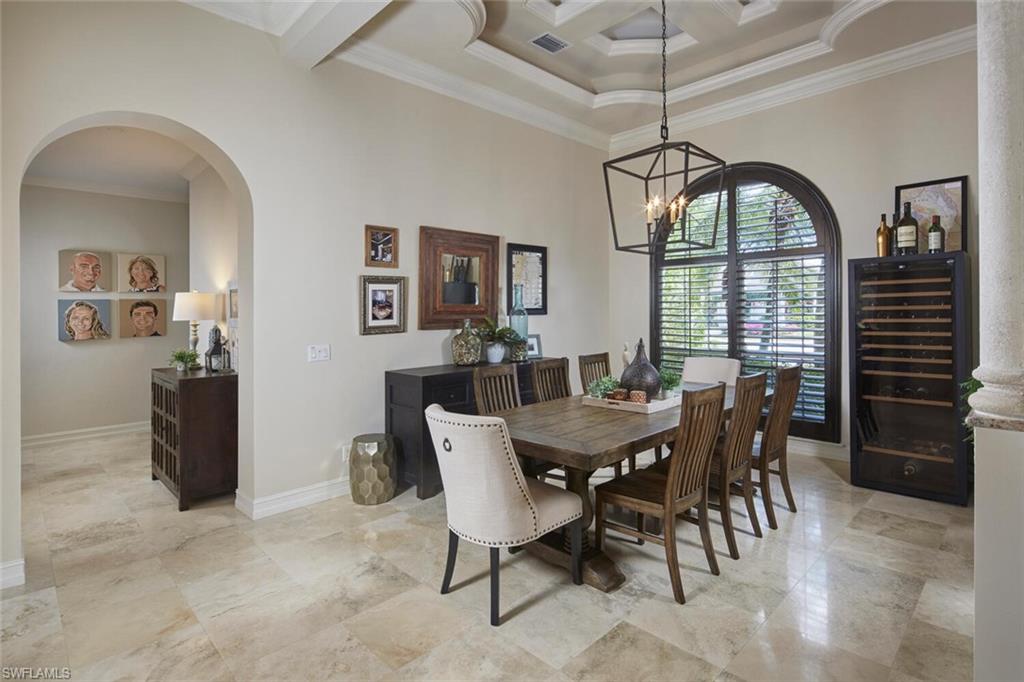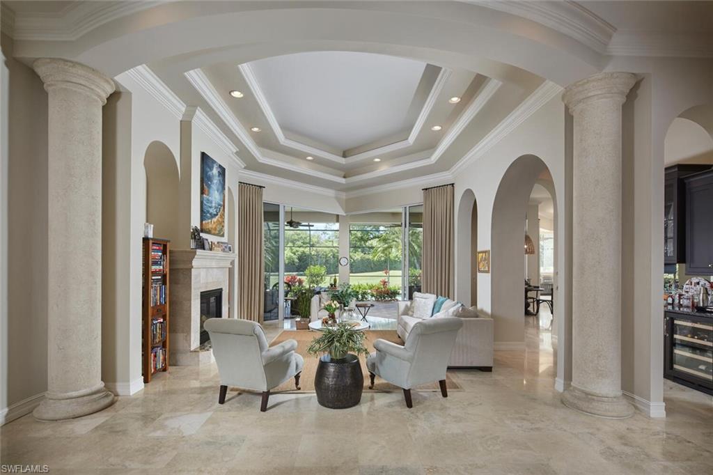This exquisite, fully furnished home blends timeless sophistication with everyday comfort. From the moment you step inside, you’ll be greeted by soaring ceilings, custom details, and an inviting open flow. The living room features a beautiful stone fireplace and a sleek wet bar—perfect for entertaining. A 500+ bottle, temperature-controlled wine room elevates every gathering. The gourmet kitchen features a classic stone backsplash, a designer hood, and ample storage. Two ensuite guest rooms and a private owner’s suite provide space and serenity. The main suite includes a luxurious bath, vanity, dressing area, and three closets. Outside, the expansive lakefront lanai sets the stage for relaxed living, complete with multiple seating and dining areas, a fireplace, a summer kitchen, and a sparkling pool and spa framed by peaceful fountains. Immaculate, elegant, and move-in ready—this home is an exceptional opportunity to enjoy Naples living at its finest.