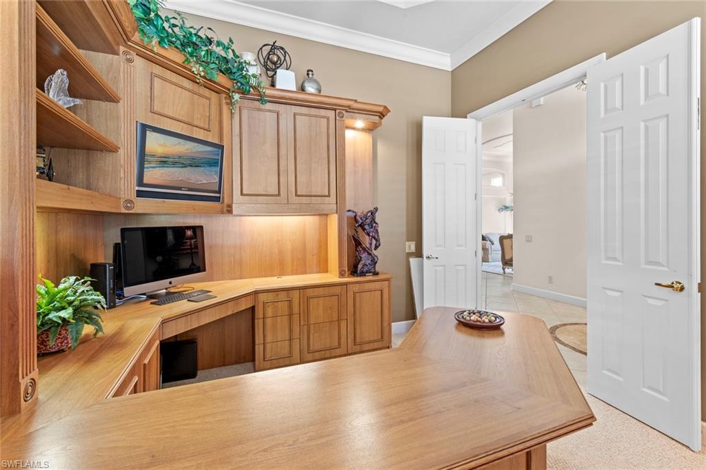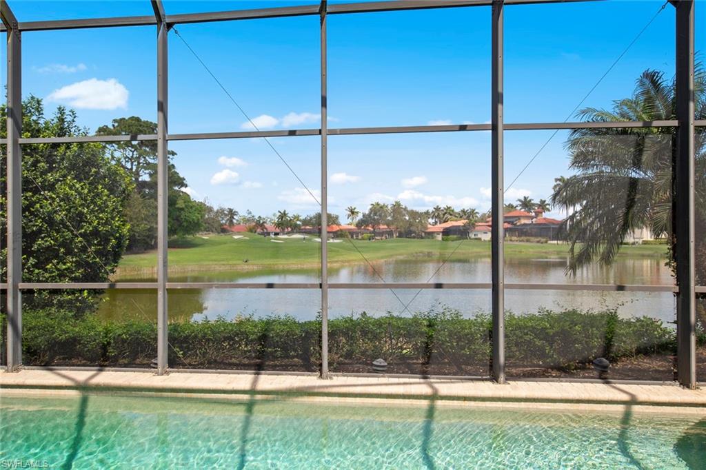 Discover resort-style living in this beautifully appointed single family home featuring three bedrooms plus a den/office and three bathrooms, perfectly situated in the highly sought-after gated community of Watercrest at Pelican Marsh. Step inside to an open-concept floor plan with a spacious kitchen featuring a center island, perfect for entertaining. The bright living spaces flow seamlessly to the serene screened lanai, where a sparkling swimming pool overlooks breathtaking water and golf course views—an ideal setting for relaxing with a morning coffee or for hosting sunset gatherings with guests. The private owner’s suite offers serene views and a spa-like bath with access to the screened lanai and pool area. Additional features include a whole house generator, 42” cabinets in the kitchen, crown molding and 8’ doors throughout the interior of the home. Pelican Marsh is one of Naples’ premier golf course communities, offering an array of amenities including tennis, fitness, walking and biking paths and optional private golf membership. Enjoy the perfect combination of privacy, luxury, and convenience, just minutes from white-sand beaches, Mercato, and world-class dining and shopping.