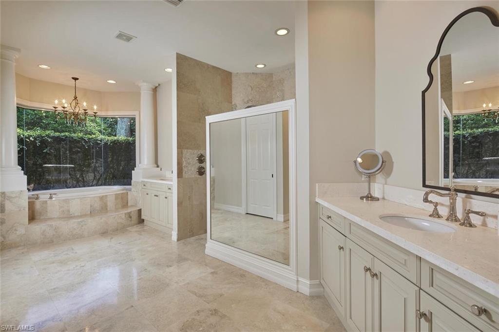 The Estates at Bay Colony, a community definable by no other statement than "Naples' most luxurious estate homes," now offers a residence so special that by comparison on any level, there is no equal. Secluded on a double lakefront estate site, this palatial estate incorporates only the finest materials and artisanship across the 15,247 sq. ft. of living area and exudes a rich European aesthetic. The residence is distinguished by a total of eight-bedroom suites, His and Her studies, a gourmet kitchen, a handsome hidden pub / billiards room, home theatre, and endless views of the lake and golf course from nearly every room. Ideally located on the ground-level, the master suite is nothing short of lavish with His and Her Dressing rooms, a sprawling bathroom befitting of royalty, as well as an adjacent sitting room that could serve a multitude of functions. Offering an impressive landscape for entertaining and relaxing, the exterior living environs host a sprawling logia with motorized screens, a fully-equipped outdoor kitchen, a magnificent pergola, as well as a 50' lap pool with water-lounge and spa - all of which is surrounded by Ritz Carlton styled cabanas. Additionally encompassed on site is a two-bedroom guest house complete with a full kitchen and living room, as well as a six-car capacity four-bay garage plus golf cart bay. It is without a doubt that this home exceeds all expectations and is a "must see" for the most discerning prospects.