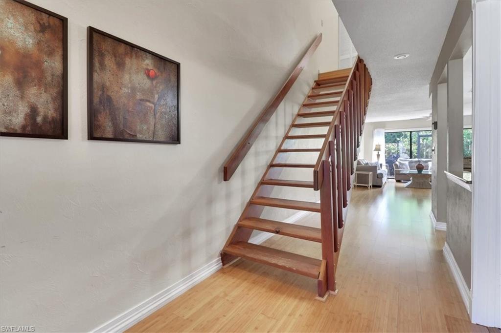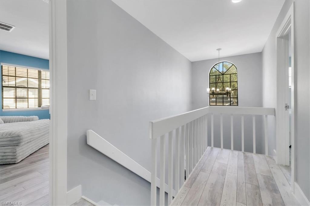Beautiful remodeled end unit with lots of natural light and side view of the lake! This home has just been fully updated with the perfect coastal theme for your beach home! Beautiful light wood like floors, freshly painted walls and baseboards, light kitchen cabinets, and fully transformed back yard area including brand new fencing. This home is also nestled in a nice quiet cul de sac with a 1 car garage and driveway. The brand new flooring, paint and the beautiful back lanai/deck area with new fencing creates your own private oasis. This end unit has the primary bedroom on the ground floor and an additional guest room upstairs and a large loft/den serving as an extra bedroom. All with gorgeous amount of natural light! This home also has a powder room/half bath on the ground floor which is great for guests. Pelican Ridge has 2 heated community pools and is in a prime location in Naples. Just over 1 mile to Vanderbilt Beach and across from the hotspot Mercato, shopping, dining and more. The relatively low HOA fees include the pools, lawn/landscaping, water, pest control, roofs/exterior insurance of home and reserve. Pack your bags and move right in!
