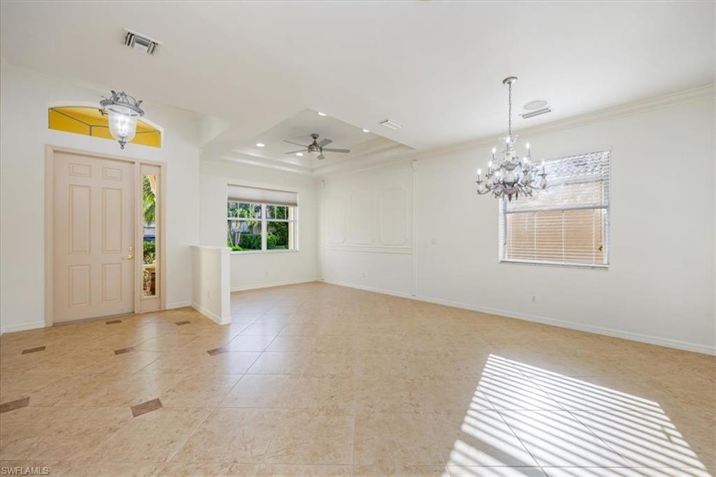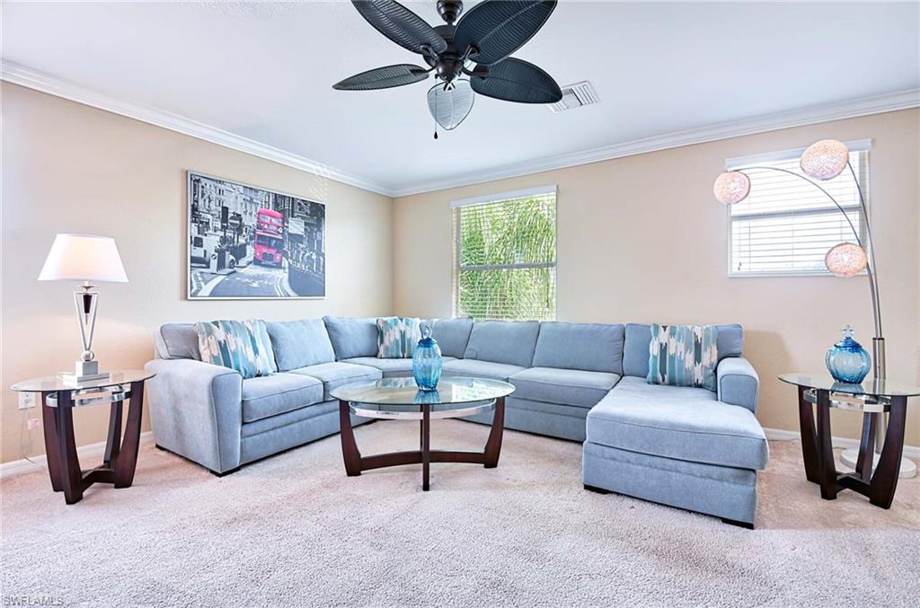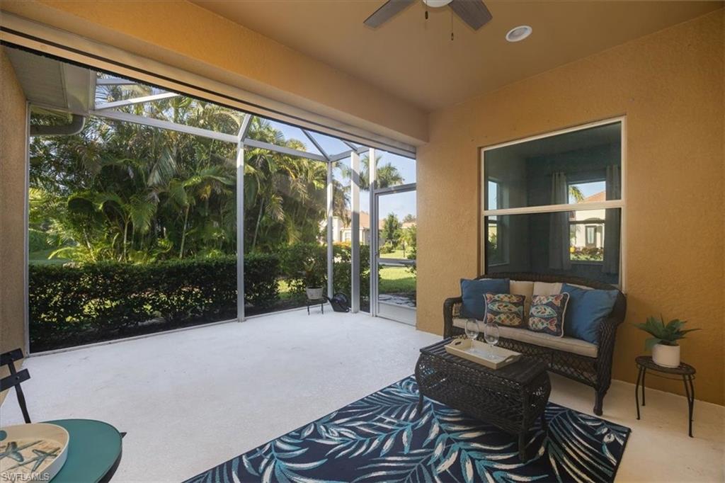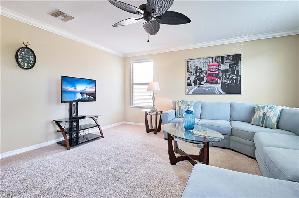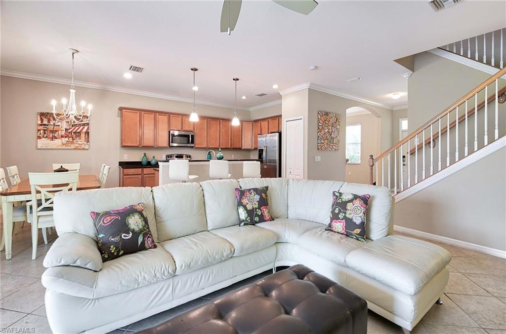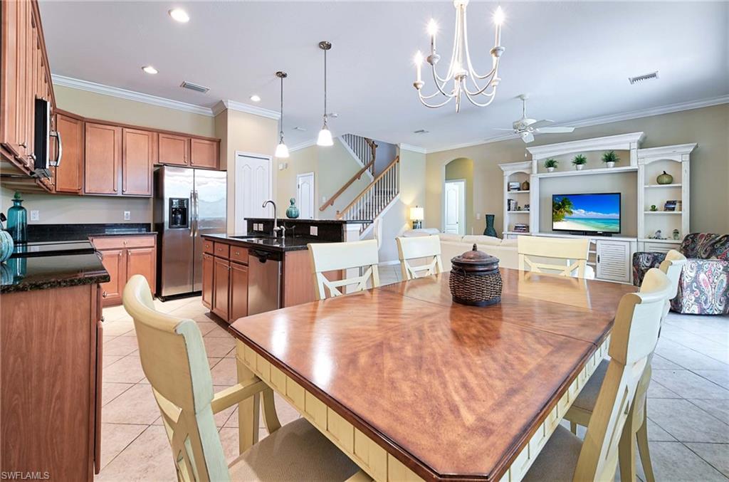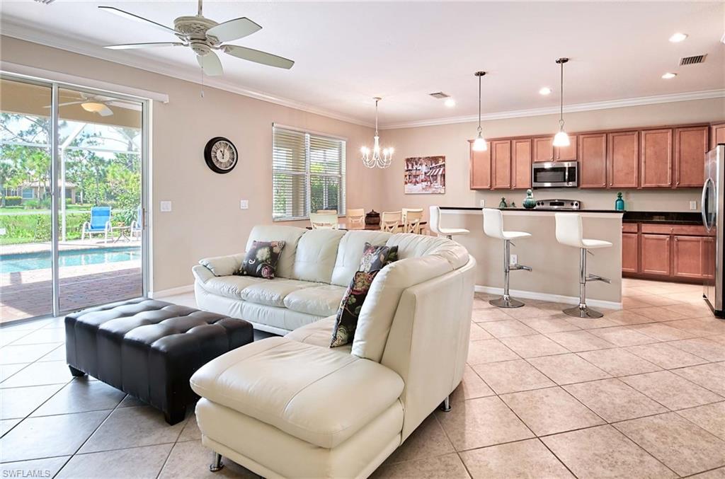 This home offers the ideal blend of comfort, convenience, and resort-style living in Naples. Built in 2014, this 3 bedroom, 3 bath with a den offers a desirable split floorplan, 2 car garage, and a pond view from the screened lanai. Located in the sought-after gated community, Reflection Lakes of Naples, which offers low HOA fees, no CDD and flood insurance is not required. The open design features tile flooring throughout and numerous updates, including a kitchen backsplash, crown molding, fresh paint, garage fan with temperature control, new HVAC (2023), new microwave (2024), new dishwasher (2025). Additional blown in insulation in all attic spaces and pest control maintenance in place. The master suite includes a luxurious bath with a soaking tub, separate shower, and double sink vanity. One guest bedroom features its own ensuite, while the den comes with a built in desk area, and double twin Murphy bed system-perfect for extra guests. Additional highlights include, storm protection including hurricane bracing on garage door, and loft storage in garage in addition to attic storage. Great rental potential with 30 day minimum 3 times a year. Community amenities include a resort style pool, kiddie pool, clubhouse, fitness center, library, bocce ball court, and a vibrant social calendar. Pet friendly too! Perfectly located near Marco Island and 5th Avenue in Naples, with dining, grocery stores and shopping close by. Move in ready.