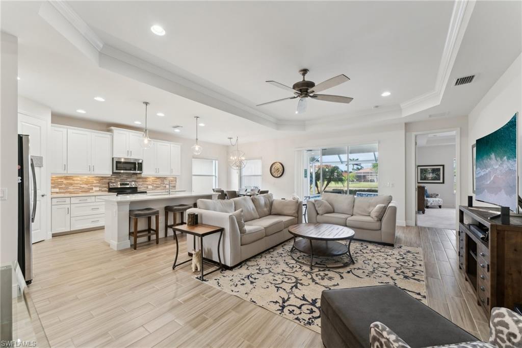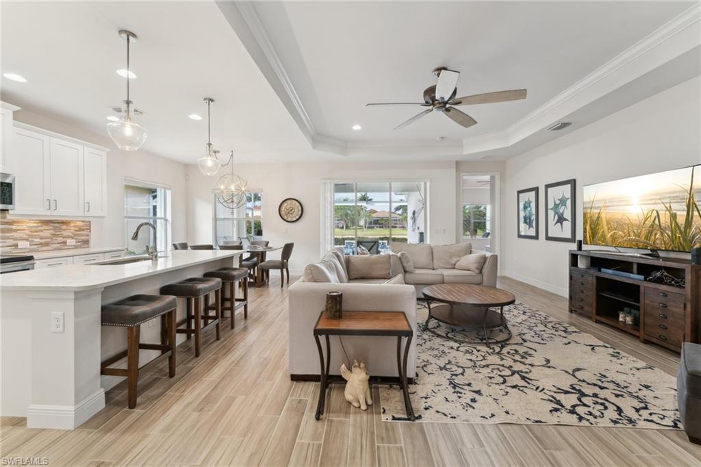LAKEFRONT BEAUTY WITH A HEATED SALTWATER POOL! Step into your backyard oasis with western exposure offering STUNNING SUNSETS. REFLECTION LAKES OF NAPLES is a boutique sized gated community with amenities to keep you happy & active! This 2016 home by Neil Communities is 'move in condition' with an open-concept design- bright and airy, featuring coffered ceilings, crown molding, and durable tile flooring with a wood plank design. Featuring 3 bedrooms + Den and 2 full bathrooms. The gourmet kitchen boasts 42" shaker cabinets, upgraded tile backsplash, walk-in pantry, and stainless steel appliances. The primary suite offers two walk-in closets with dual sinks, and a spacious walk-in shower. Entertaining covered lanai area featuring a screened-in POOL WITH SWIM JET SYSTEM—perfect for an invigorating workout in the comfort of your own home overlooking the water. Equipped with sliding track STORM SHUTTERS around the home for your piece of mind. Reflection Lakes is a no CDD community with palm lined sidewalks & offers: clubhouse, fitness center, heated pool overlooking the lake , bocce ball, billiards, library, and an active social calendar. Conveniently located near Marco Island, Downtown Naples, and world-class beaches. A picture-perfect home in a prime location—schedule your private tour today!