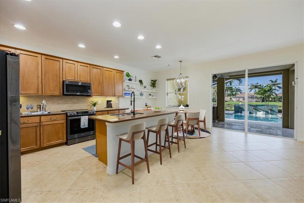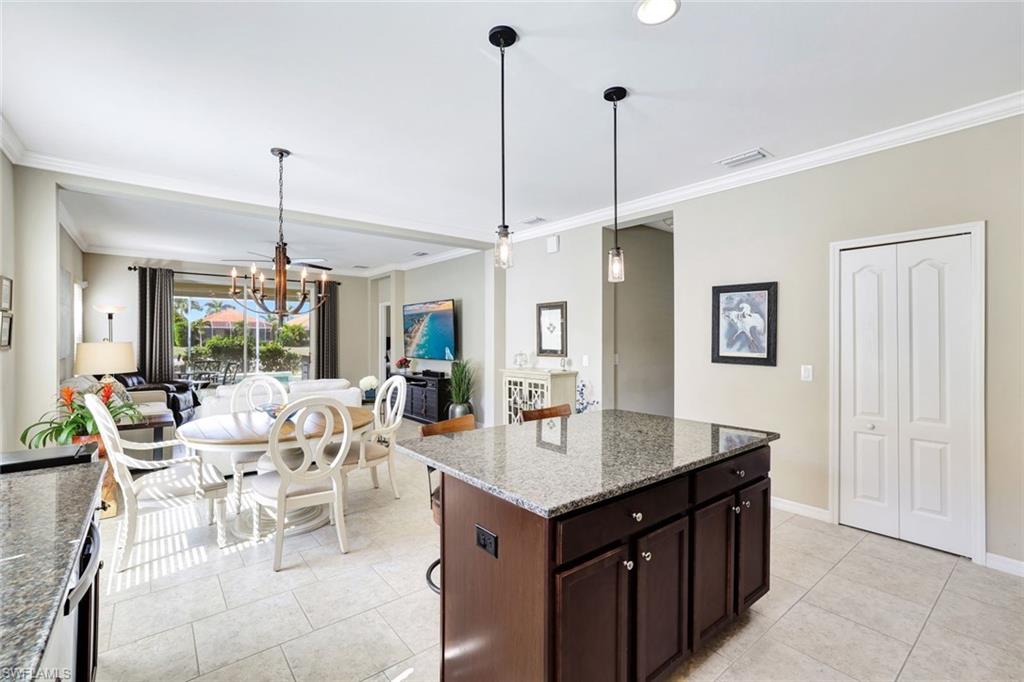 Turnkey elegance awaits in this impeccably maintained property, featuring three bedrooms, two bathrooms, and a versatile open den. This home is a boater's dream, offering an extended garage designed to securely accommodate your vessel indoors. Sold fully furnished with high-end items, the residence features numerous updates, including a new water heater (installed in 2025) and an insulated garage door. Enjoy the heated, west-facing pool and outdoor kitchen, which offer fabulous view of the pond and sunset. The property have been upgraded with crown moulding. The property has window shutters and solar shades in the lanai. Built in 2016 and lightly used, with only 4 to 5 months of annual use, every detail of this property was crafted with efficiency in mind. The home is located just 9 miles from the vibrant heart of Naples, providing easy access to top-rated restaurants, shops, and conveniences.