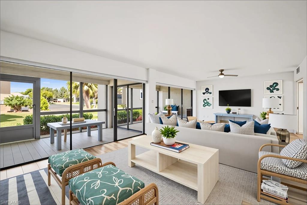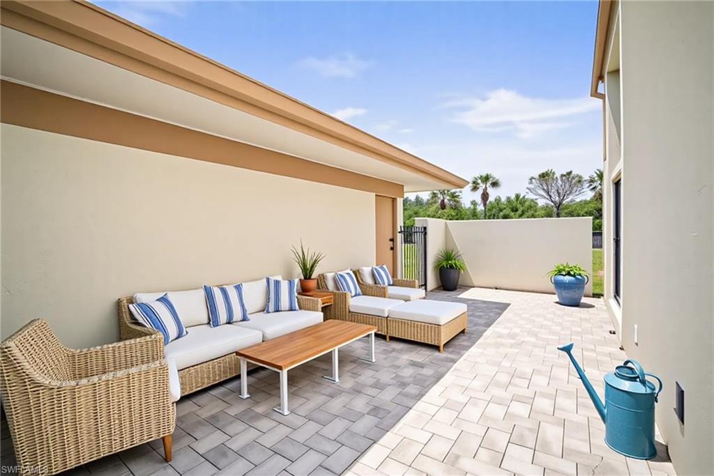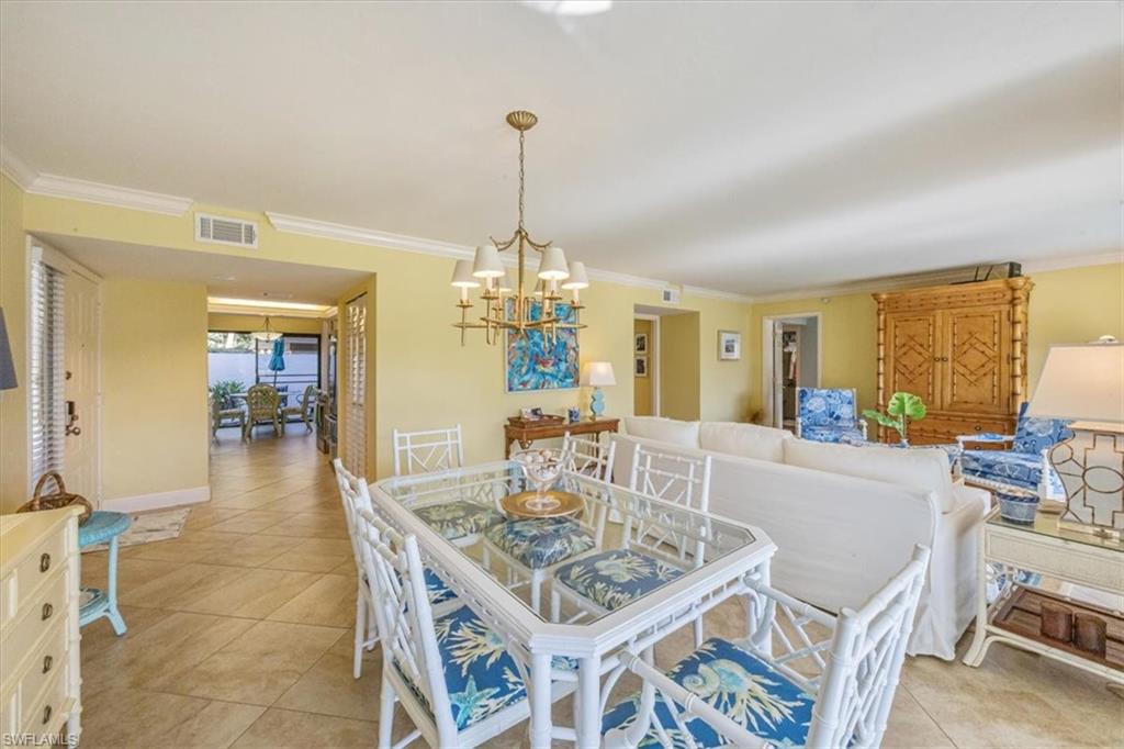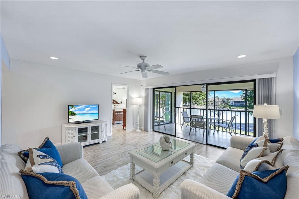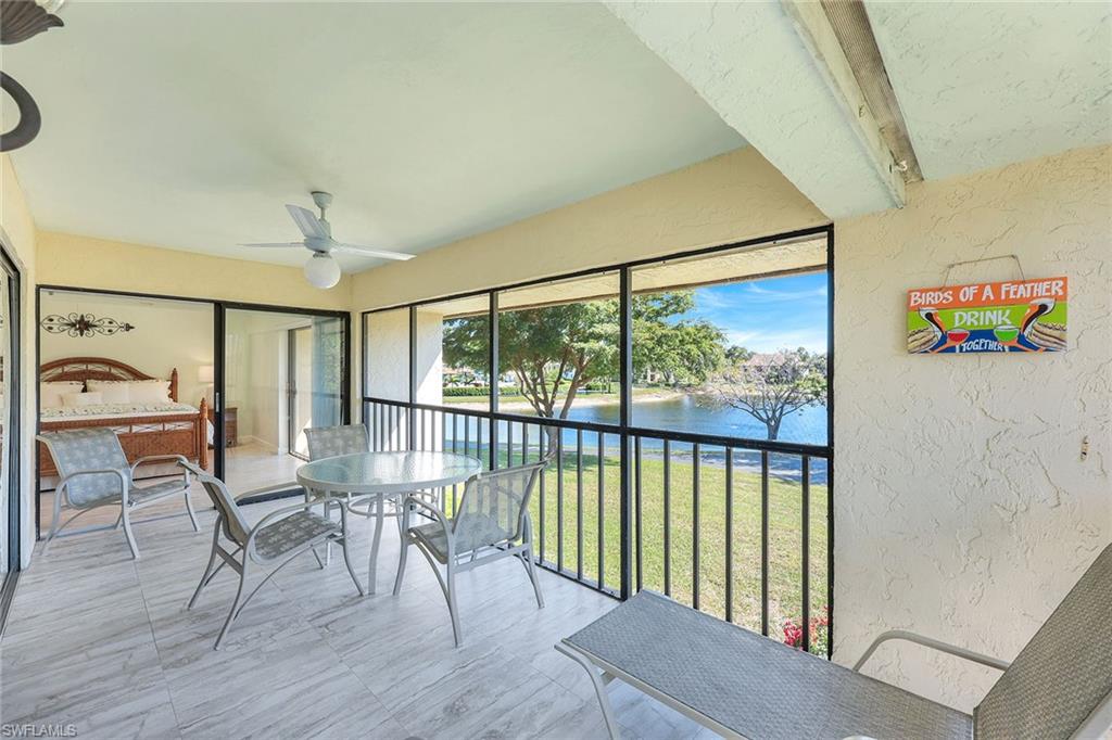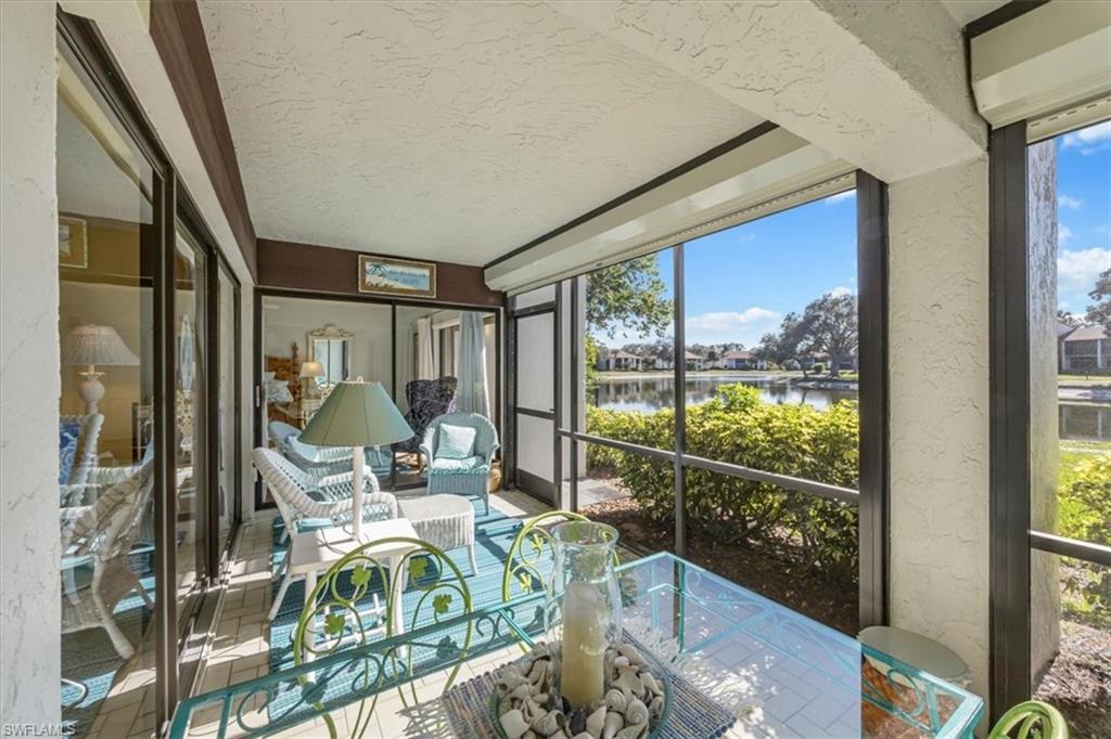 Spectacular panoramic lake views await at this rarely available, first-floor end unit located in the desirable community of The Retreat! Enjoy tranquil water views from nearly every room and a spacious, oversized screened lanai—perfect for morning coffee, evening sunsets, or effortless indoor-outdoor living. A charming garden entry with large private patio courtyard welcomes you home and offers direct access to the detached garage. THIS GARDEN PATIO OFFERS OUTDOOR LIVING FLEXIBILITY FOR THOSE BEAUTIFUL FLORIDA DAYS AND EVENING BBQ’s. Boasting 2 bedrooms plus a den, 2 baths, and 1,737 sq. ft. of light-filled living space (1,962 total sq. ft. WITH LANAI) this residence lives large. Nicely appointed and being sold fully furnished, it’s truly move-in ready from day one. The guest bedroom is as generously sized as the primary suite, and both bedrooms feature walk-in closets and picturesque lake views. Freshly painted interiors, updated bathrooms, and new luxury vinyl plank flooring throughout provide a modern, coastal-inspired feel. You’ll love the abundance of natural light, ample storage, and the flexible den—ideal for a home office, hobby room, or extra sleeping space. Step outside and enjoy The Retreat’s peaceful ambiance, where scenic wooden bridges wind through a natural wildlife estuary and connect to miles of bike and jogging paths. Located west of 41, just minutes from Vanderbilt Beach, Bonita Beach, Wiggins Pass State Park, and Barefoot Beach, this gated community offers 24-hour patrol, a convenient back gate to Vanderbilt Drive, and a saltwater community pool, spa, and grilling area just steps from your door. This is the perfect home for year-round living, a seasonal getaway, or a smart investment in one of Naples’ most sought-after locations. Come experience the beauty, serenity, and lifestyle of The Retreat—your new memories start here!