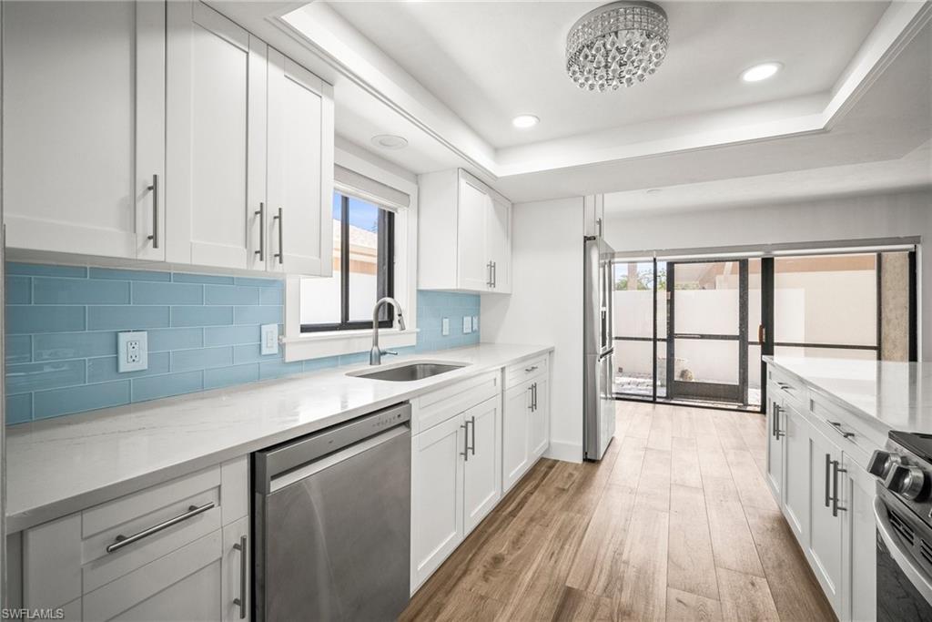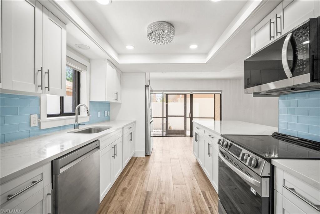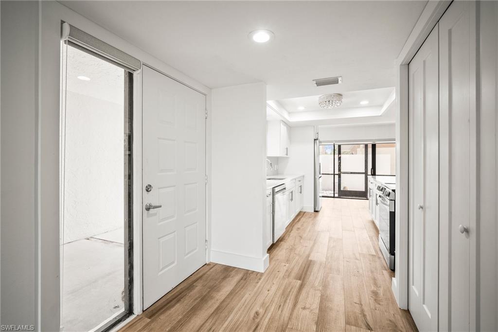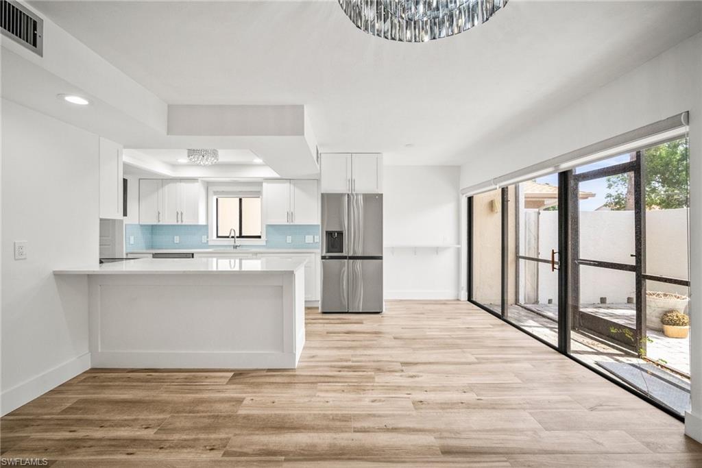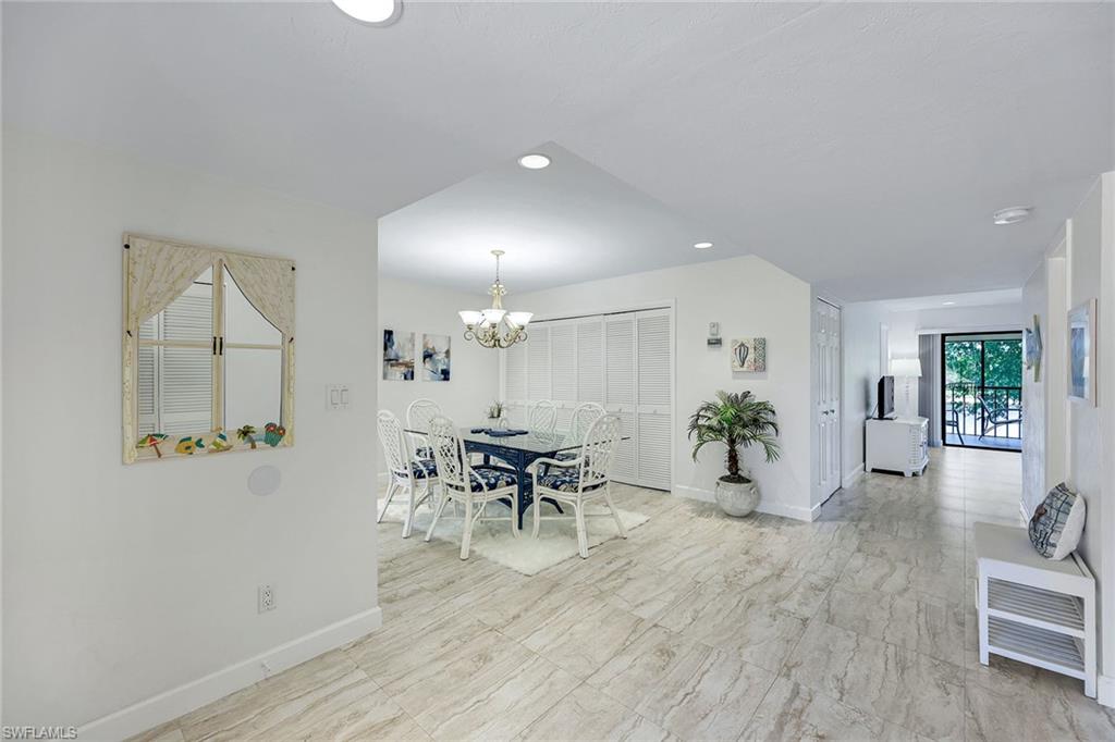 Experience coastal living at its finest in this beautifully remodeled, first-floor END-UNIT condo that feels like a villa! From the moment you arrive, you’ll love the courtyard entrance that leads from your garage directly into your home. Inside, an additional spacious South-facing lanai showcases wide Lake Views, filling the entire residence with vibrant natural light. This stunning 3-bedroom, 2-bath home shines with flowing tile flooring throughout the main living areas, kitchen, and baths, complemented by stylish wood-vinyl flooring in two of the bedrooms. The chef-inspired kitchen is a true showpiece, featuring sleek quartz countertops, a custom tiled backsplash, top-of-the-line Bosch stainless-steel appliances, and rich custom wood cabinetry with soft-close features and convenient pull-out drawers with Large Farm house s/s sink. For peace of mind, the home is equipped with newer electric hurricane shutters on the southern lanai, an electric shutter on the guest bedroom slider, and a manual shutter on the small bedroom window—plus elegant Hunter Douglas blinds. Unwind on your lake side lanai with your favorite drink and nature as your backdrop—otters, graceful birds, and even majestic eagles are known to visit the surrounding trees. Located within a prestigious guard-gated community with a residents-only back entrance off Vanderbilt and 24-hour patrol, The Retreat offers tranquility and natural beauty at every turn. Enjoy scenic walking paths, charming wooden bridges, and approximately five miles of biking and jogging trails winding through a lush wildlife estuary. All this, just minutes from the white-sandy beaches off Vanderbilt, Bonita, and Wiggins State Park, plus an array of shops, restaurants. The heated saltwater community pool offers the perfect place to relax and soak in the sunshine. Retreat ONE is the only association that includes “Hotwire” Internet service included in your condo fee. This is more than a home—it’s a lifestyle. Bring the family and start creating unforgettable memories today!