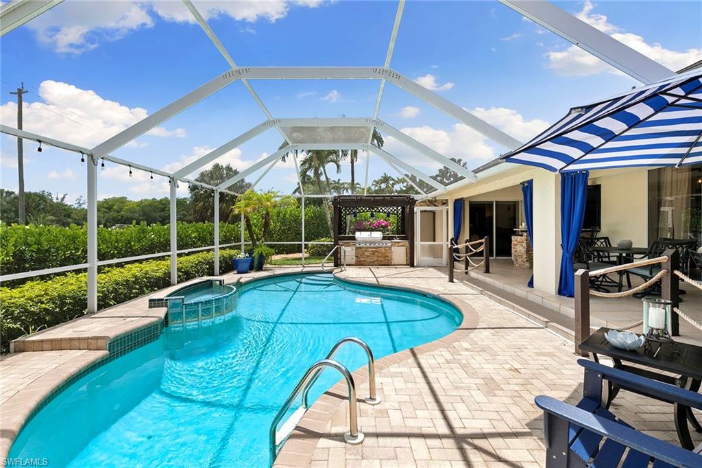 This inviting single-family pool home sits on a beautifully landscaped lot with standout curb appeal. All on one level, the spacious great room floor plan offers stylish design with three bedrooms, two full baths, soaring ceilings and abundant natural light from preferred southern exposure. Recent updates include light oak wood-look LVP flooring installed by Hadinger in 2024, an updated kitchen and a custom built-in with electric Dimplex fireplace. The generous primary suite features a large walk-in closet and an updated bath with dual sinks, soaking tub and separate shower. The guest bath offers convenient access from the pool area. The backyard retreat is designed for relaxing and entertaining, complete with a solar-heated pool, screened lanai, and a covered seating area with wet bar and with beverage refrigerator. A built-in grill station with sink, freestanding hot tub and partially fenced green space add to the appeal. Additional highlights include an attached two-car garage with epoxy flooring, built-in storage, workbench and sink. New roof in 2016. River Reach is a non-gated neighborhood with a low annual HOA fee of just $520 and no community rental restrictions. Ideally west of Airport-Pulling Road, it’s minutes from shopping, dining, the Gordon River Greenway, and less than five miles to Lowdermilk Beach or downtown Naples iconic 5th Avenue South. Optional membership to Coconut River Civic Association provides access to a heated pool, tennis, pickleball, shuffleboard, playground, community events, a boat ramp with Gulf access, and optional boat trailer or kayak storage.