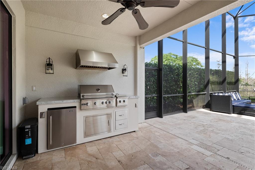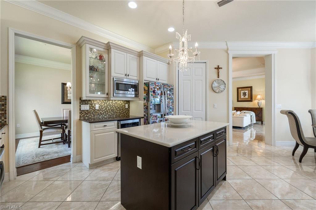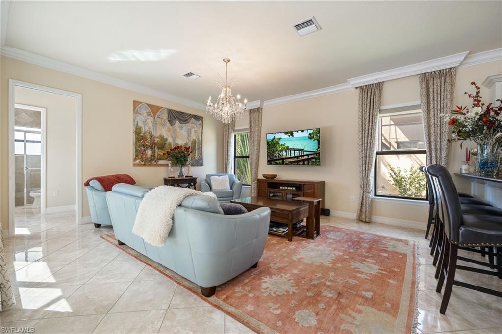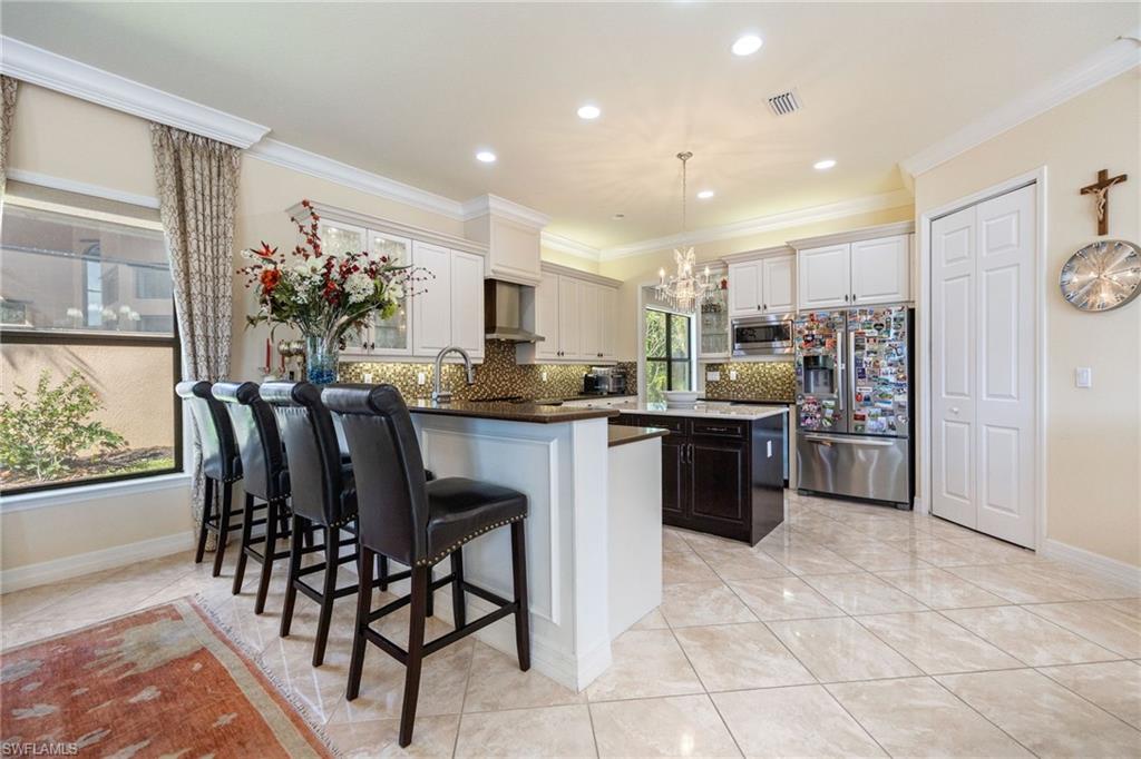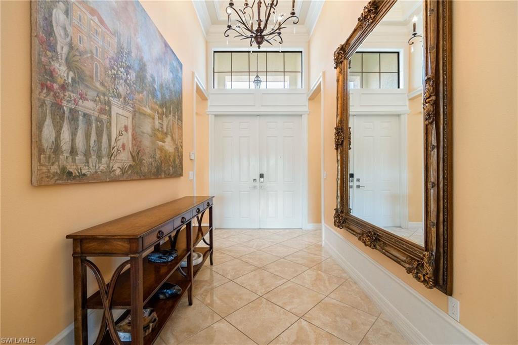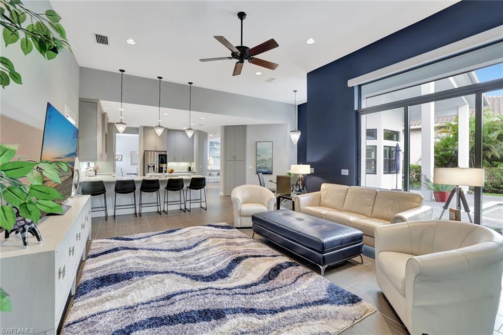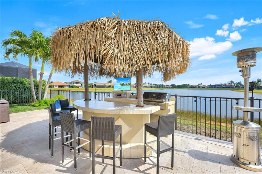 Behind the gated courtyard of this thoughtfully curated Carlyle lies a home designed for effortless living & unforgettable entertaining, where every day feels like a vacation. The interior has just been freshly painted, creating a crisp, inviting backdrop that complements the home’s refined finishes & sunlit spaces. Step through decorative glass entry doors into an expansive, entertainer’s dream layout, where the wet bar, great room, flexible dining area, and gourmet kitchen flow seamlessly to the outdoors. A sparkling lake view beckons you to the screened lanai, which offers ample room to relax or dine alfresco. Spend your days lounging by the saltwater pool, then prepare dinner in the outdoor kitchen—equipped with marine-grade cabinetry, a sink, granite surfaces, dual burners & a 60,000 BTU wok-capable burner, all powered by a buried 120-gallon propane tank. Inside, no detail has been overlooked. The chef’s kitchen features upgraded white cabinetry, granite counters, a new GE Café four-door refrigerator, double wall ovens, newer microwave, range with vented hood, custom pull-out shelves & a professionally painted island. Glass atrium doors with side panels enclose the dining space, adding elegance & allowing for flexible usage. The luxurious primary suite overlooking the lake includes dual custom closets, a serene sitting area & a renovated spa-like bath. The primary bath has been updated with a newly tiled walk-in shower with linear drain and new fixtures. Vanities feature new quartz counters, professionally painted cabinetry, framed mirrors & Rohl sinks. Both guest suites offer private baths & walk-in closets. One ensuite bath includes a remodeled shower with frameless glass doors & new tile. The versatile club room adapts to your needs—ideal as an office, den, or media space. Additional highlights include 18" porcelain tile throughout, plantation shutters, crown molding, Hunter Douglas Luminette sheers & built-in closets. A well-appointed laundry room offers a newer GE Profile washer and dryer, abundant cabinetry, a laundry tub, and a secondary refrigerator. The garage is equally refined with epoxy floors, insulated doors & built-in storage. Peace of mind comes standard with impact glass throughout, a Ring doorbell, fenced yard for pets, and a generator transfer switch. Additional upgrades include a new whole-house water softener system, UV lights on the A/C, & landscape lighting. Riverstone offers a vibrant, vacation-inspired lifestyle for all ages. Located in North Naples, just minutes from I-75 and zoned for "A"-rated schools, the community features a fitness center, social hall, resort-style pool, lap pool, spa, five lighted tennis courts, outdoor basketball and pickleball, a full indoor basketball court, tot lot, children’s water play area, game room, and an activities coordinator; making it easy to meet new friends. Whether hosting, relaxing, or simply enjoying the view, this home delivers the ideal setting for your Naples lifestyle.