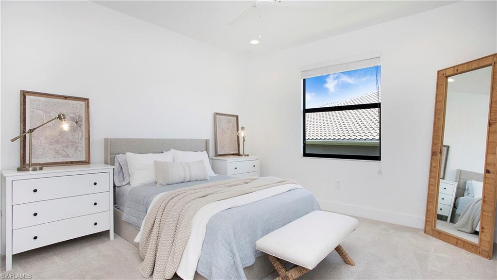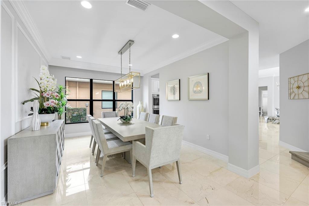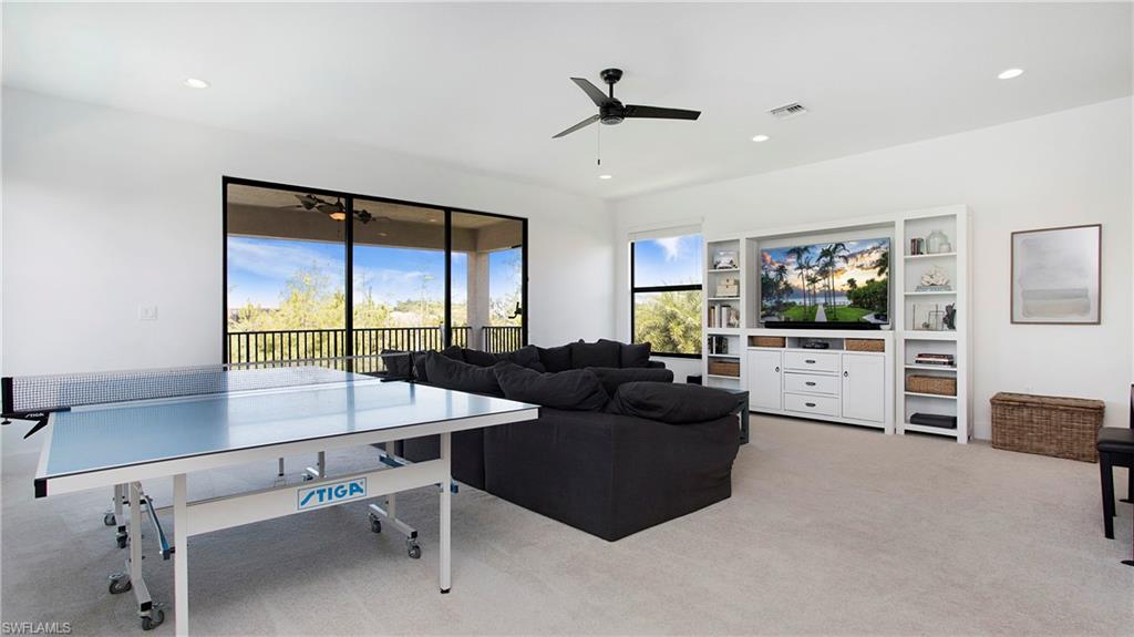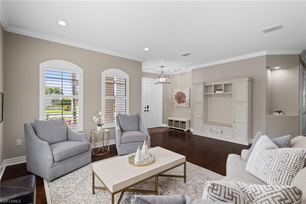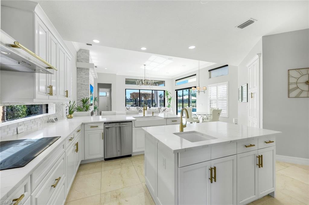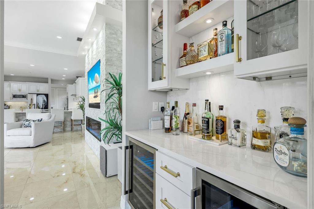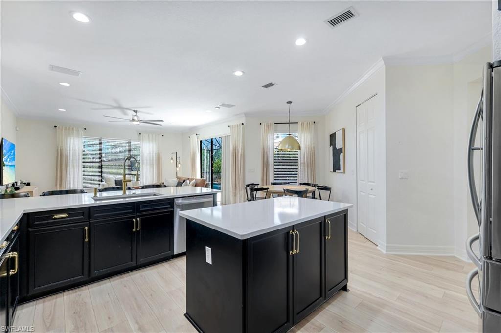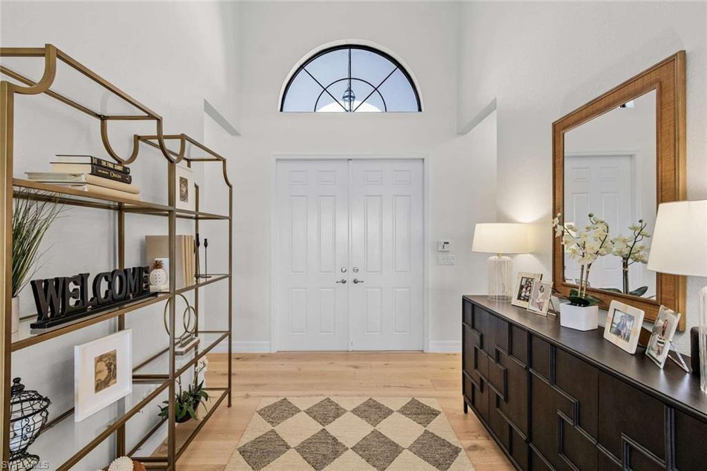 Behind the gated courtyard of this thoughtfully curated Carlyle lies a home designed for effortless living & unforgettable entertaining, where every day feels like a vacation. The interior has just been freshly painted, creating a crisp, inviting backdrop that complements the home’s refined finishes & sunlit spaces. Step through decorative glass entry doors into an expansive, entertainer’s dream layout, where the wet bar, great room, flexible dining area, and gourmet kitchen flow seamlessly to the outdoors. A sparkling lake view beckons you to the screened lanai, which offers ample room to relax or dine alfresco. Spend your days lounging by the saltwater pool, then prepare dinner in the outdoor kitchen—equipped with marine-grade cabinetry, a sink, granite surfaces, dual burners & a 60,000 BTU wok-capable burner, all powered by a buried 120-gallon propane tank. Inside, no detail has been overlooked. The chef’s kitchen features upgraded white cabinetry, granite counters, a new GE Café four-door refrigerator, double wall ovens, newer microwave, range with vented hood, custom pull-out shelves & a professionally painted island. Glass atrium doors with side panels enclose the dining space, adding elegance & allowing for flexible usage. The luxurious primary suite overlooking the lake includes dual custom closets, a serene sitting area & a renovated spa-like bath. The primary bath has been updated with a newly tiled walk-in shower with linear drain and new fixtures. Vanities feature new quartz counters, professionally painted cabinetry, framed mirrors & Rohl sinks. Both guest suites offer private baths & walk-in closets. One ensuite bath includes a remodeled shower with frameless glass doors & new tile. The versatile club room adapts to your needs—ideal as an office, den, or media space. Additional highlights include 18" porcelain tile throughout, plantation shutters, crown molding, Hunter Douglas Luminette sheers & built-in closets. A well-appointed laundry room offers a newer GE Profile washer and dryer, abundant cabinetry, a laundry tub, and a secondary refrigerator. The garage is equally refined with epoxy floors, insulated doors & built-in storage. Peace of mind comes standard with impact glass throughout, a Ring doorbell, fenced yard for pets, and a generator transfer switch. Additional upgrades include a new whole-house water softener system, UV lights on the A/C, & landscape lighting. Riverstone offers a vibrant, vacation-inspired lifestyle for all ages. Located in North Naples, just minutes from I-75 and zoned for "A"-rated schools, the community features a fitness center, social hall, resort-style pool, lap pool, spa, five lighted tennis courts, outdoor basketball and pickleball, a full indoor basketball court, tot lot, children’s water play area, game room, and an activities coordinator; making it easy to meet new friends. Whether hosting, relaxing, or simply enjoying the view, this home delivers the ideal setting for your Naples lifestyle.