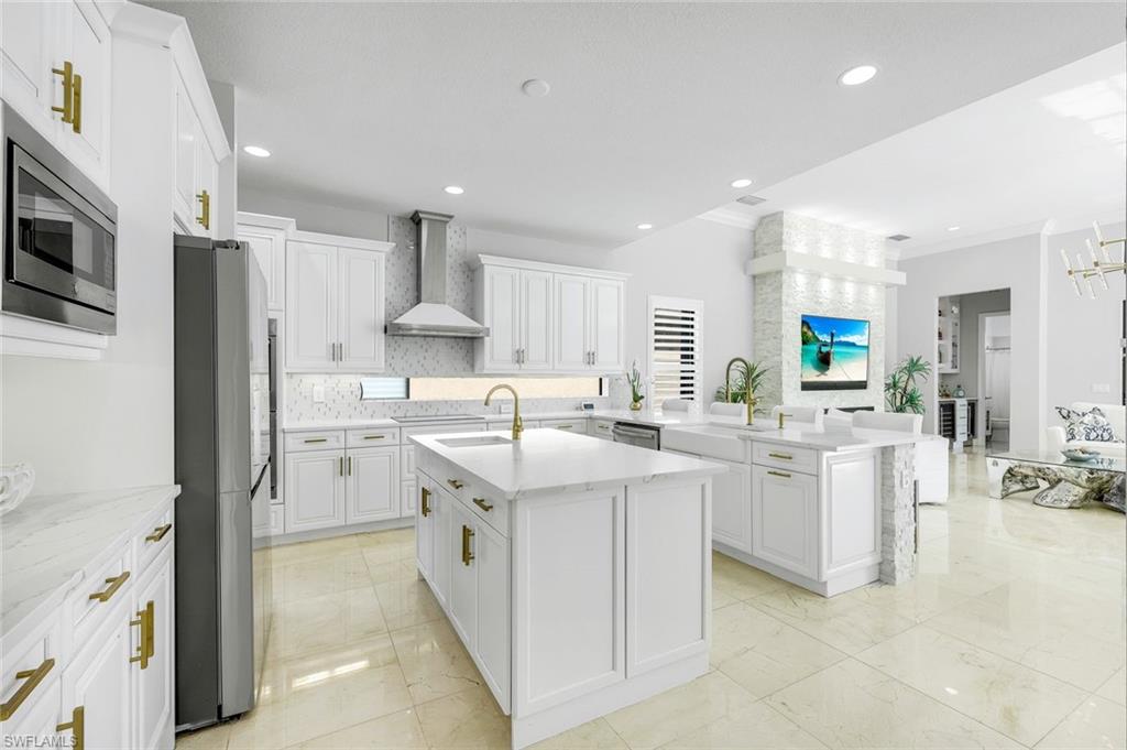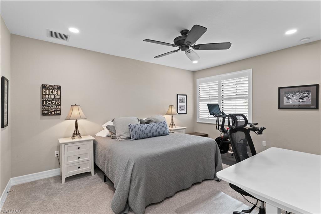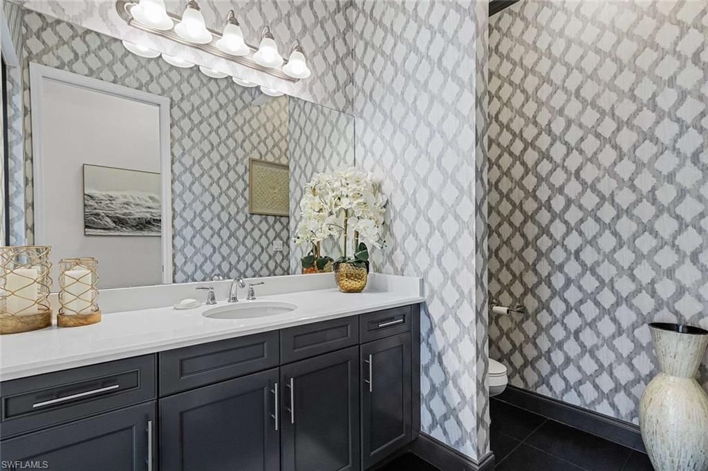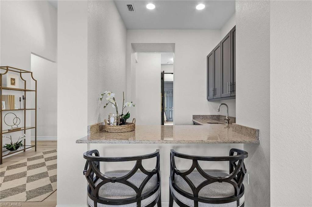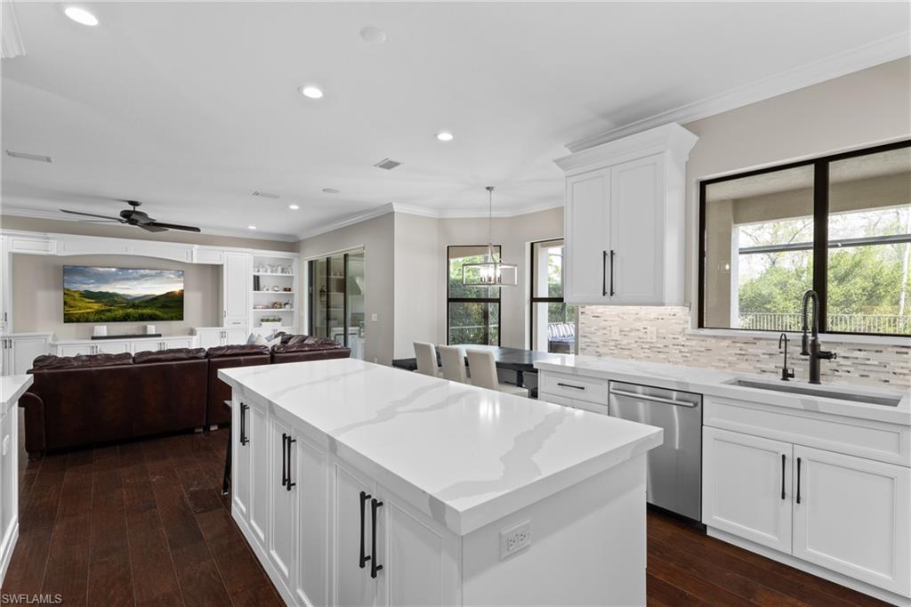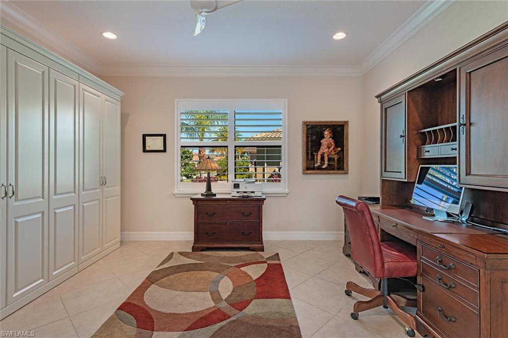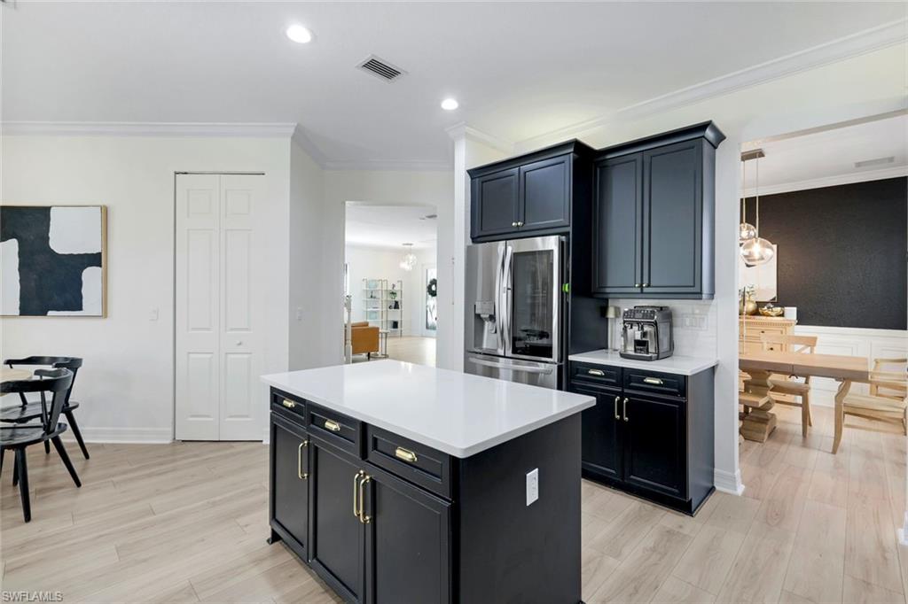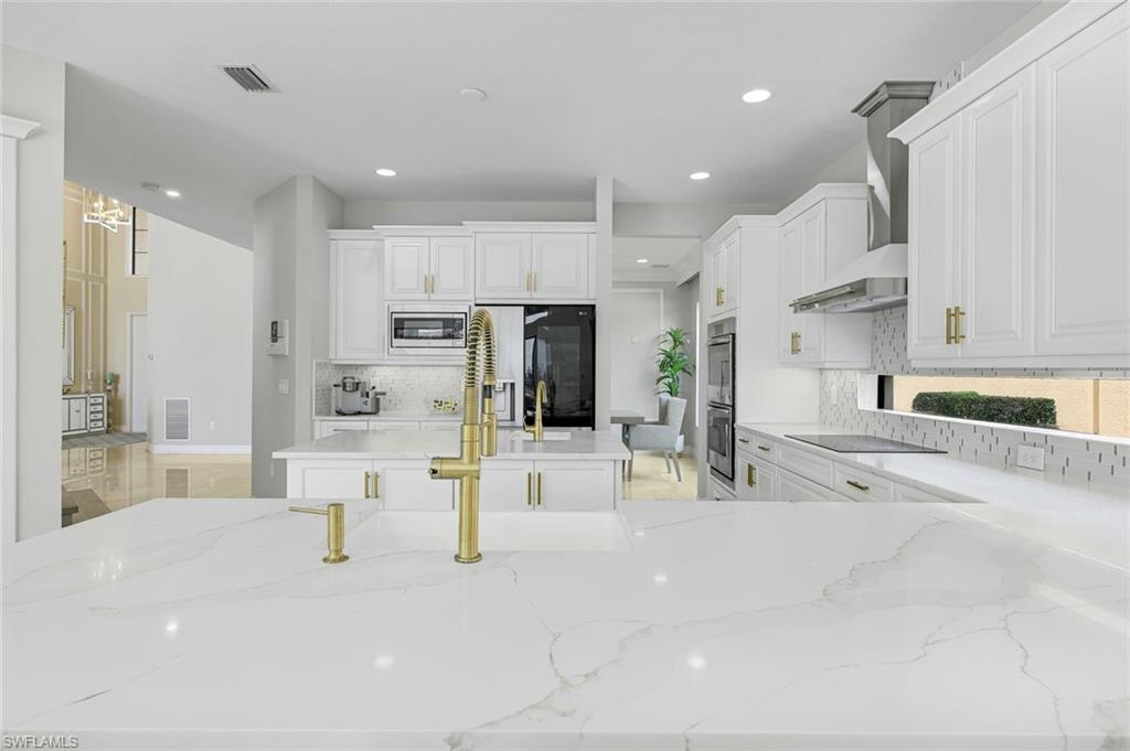 Behind the gated courtyard of this thoughtfully curated Carlyle lies a home designed for effortless living & unforgettable entertaining, where every day feels like a vacation. The interior has just been freshly painted, creating a crisp, inviting backdrop that complements the home’s refined finishes & sunlit spaces. Step through decorative glass entry doors into an expansive, entertainer’s dream layout, where the wet bar, great room, flexible dining area, and gourmet kitchen flow seamlessly to the outdoors. A sparkling lake view beckons you to the screened lanai, which offers ample room to relax or dine alfresco. Spend your days lounging by the saltwater pool, then prepare dinner in the outdoor kitchen—equipped with marine-grade cabinetry, a sink, granite surfaces, dual burners & a 60,000 BTU wok-capable burner, all powered by a buried 120-gallon propane tank. Inside, no detail has been overlooked. The chef’s kitchen features upgraded white cabinetry, granite counters, a new GE Café four-door refrigerator, double wall ovens, newer microwave, range with vented hood, custom pull-out shelves & a professionally painted island. Glass atrium doors with side panels enclose the dining space, adding elegance & allowing for flexible usage. The luxurious primary suite overlooking the lake includes dual custom closets, a serene sitting area & a renovated spa-like bath. The primary bath has been updated with a newly tiled walk-in shower with linear drain and new fixtures. Vanities feature new quartz counters, professionally painted cabinetry, framed mirrors & Rohl sinks. Both guest suites offer private baths & walk-in closets. One ensuite bath includes a remodeled shower with frameless glass doors & new tile. The versatile club room adapts to your needs—ideal as an office, den, or media space. Additional highlights include 18" porcelain tile throughout, plantation shutters, crown molding, Hunter Douglas Luminette sheers & built-in closets. A well-appointed laundry room offers a newer GE Profile washer and dryer, abundant cabinetry, a laundry tub, and a secondary refrigerator. The garage is equally refined with epoxy floors, insulated doors & built-in storage. Peace of mind comes standard with impact glass throughout, a Ring doorbell, fenced yard for pets, and a generator transfer switch. Additional upgrades include a new whole-house water softener system, UV lights on the A/C, & landscape lighting. Riverstone offers a vibrant, vacation-inspired lifestyle for all ages. Located in North Naples, just minutes from I-75 and zoned for "A"-rated schools, the community features a fitness center, social hall, resort-style pool, lap pool, spa, five lighted tennis courts, outdoor basketball and pickleball, a full indoor basketball court, tot lot, children’s water play area, game room, and an activities coordinator; making it easy to meet new friends. Whether hosting, relaxing, or simply enjoying the view, this home delivers the ideal setting for your Naples lifestyle.