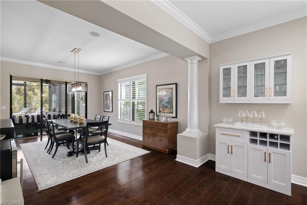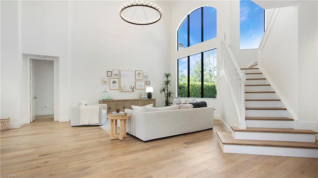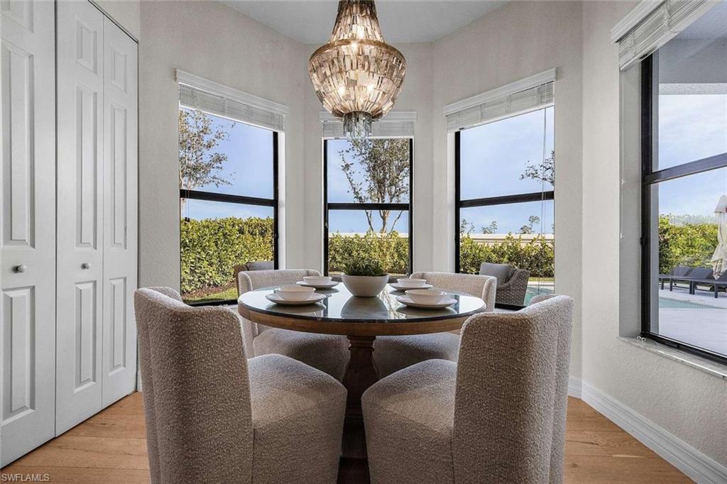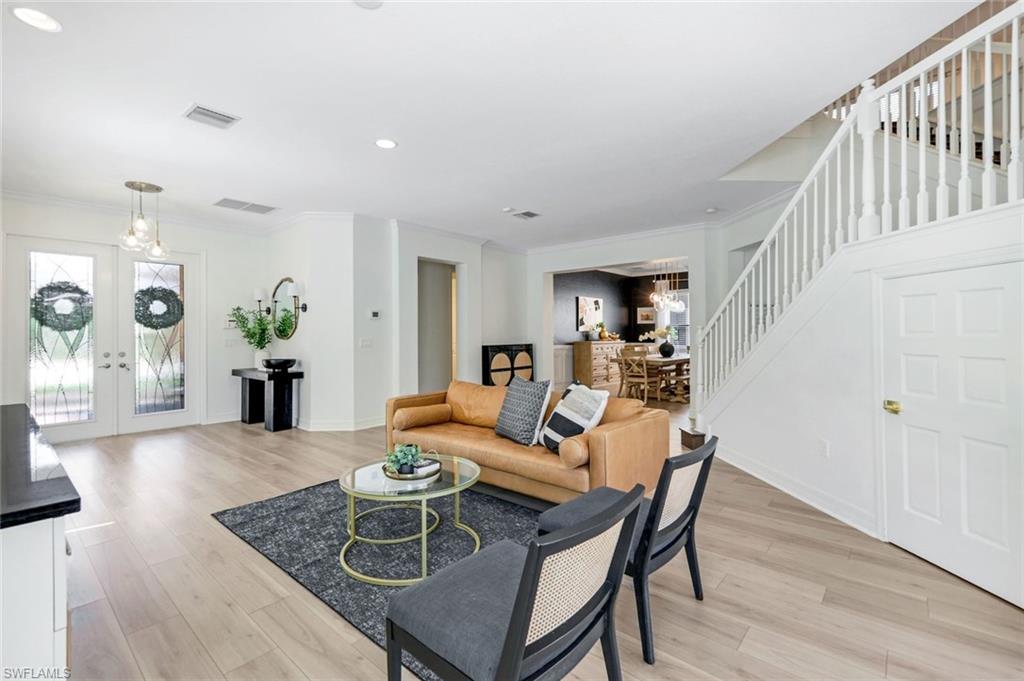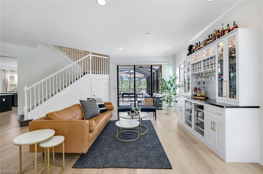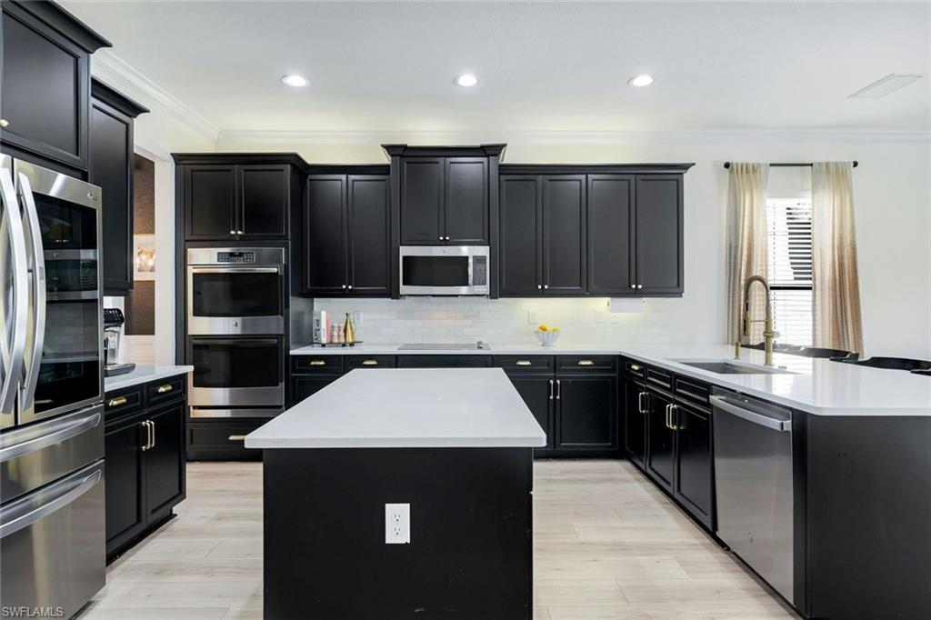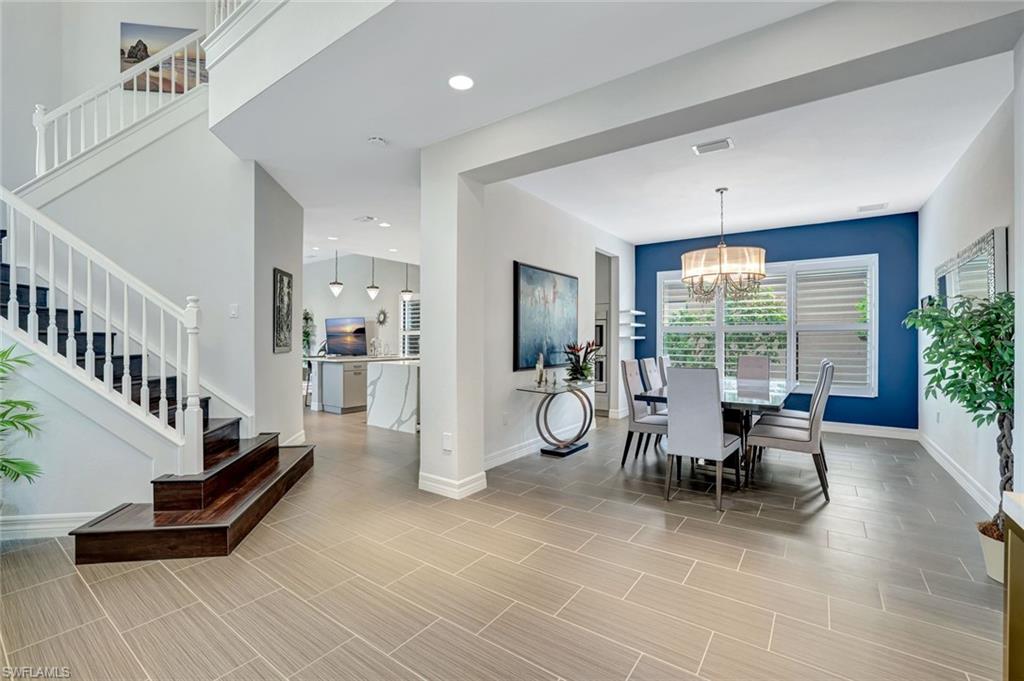 Discover the pinnacle of luxury living with the largest floor plan available in Riverstone of Naples. The Dubonnet Grande model seamlessly blends style, elegance, and functionality, offering a home that has been meticulously remodeled with exceptional attention to detail. As you enter, you are greeted by a grand foyer and soaring volume ceilings, with natural light cascading into the family room through expansive picture windows. The kitchen is a culinary masterpiece, featuring custom cabinetry, a functional island, GE Monogram appliances, glass front cabinets and stunning quartz countertops, all reminiscent of a magazine showroom. The pantry is a marvel, with its glass French door entry, subway tile backsplash, butcher block counters, and custom shelving designed to optimize every nook. The main living areas boast engineered hardwood flooring, enhanced with a thicker veneer for added durability and humidity resistance. The entryway leads to a mud/laundry room equipped with custom gray cabinets and a convenient bench seat. The crown jewel of the ground floor is the primary suite, featuring grand bay windows and a luxuriously remodeled primary bath that promises a spa-like retreat. Step outside to a vast, private outdoor space. Clusia hedges lined with fencing offer seclusion, while the preserve and trellis in the rear create the perfect backdrop for the western exposure. The pool area is a haven, with natural shell inlay pavers that stay cool underfoot, a smartly designed pool with a sun shelf, and a hot tub with a drip edge overlook. Ascend the grand staircase, accentuated with white risers, to reach the open loft/den area, which can be enclosed for an office. A few steps lead to the versatile bonus/media room, complete with built-in cabinets and a mini-fridge. The second floor also includes an open balcony, perfect for crafting your own Southwest Florida paradise, as well as three additional bedrooms and two and a half baths. Further enhancements include crown moldings throughout most of the home, three separate HVAC systems for personalized comfort, a 50-amp breaker for a generator, and a 240-amp breaker for your electric vehicle. This impeccably designed home is ready for you to move in and start living the dream.