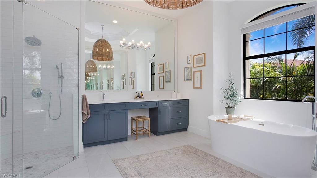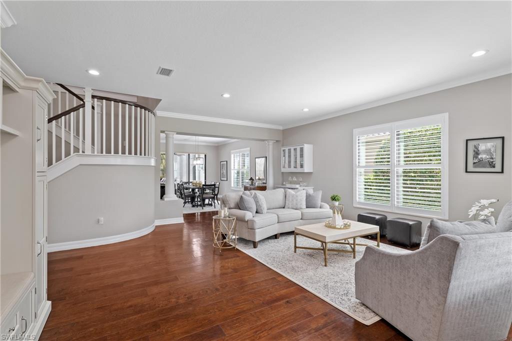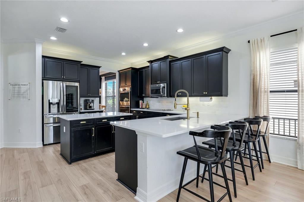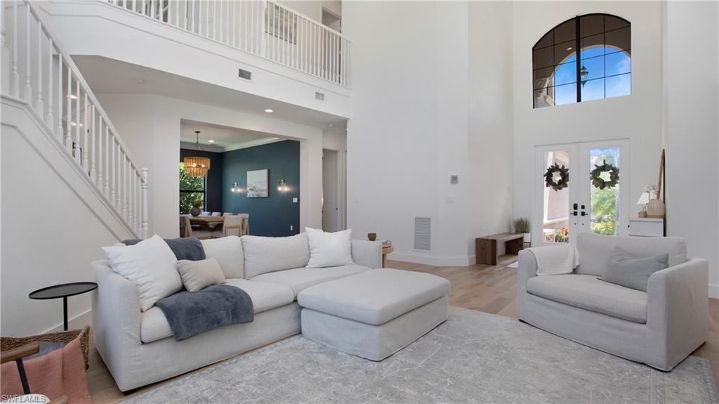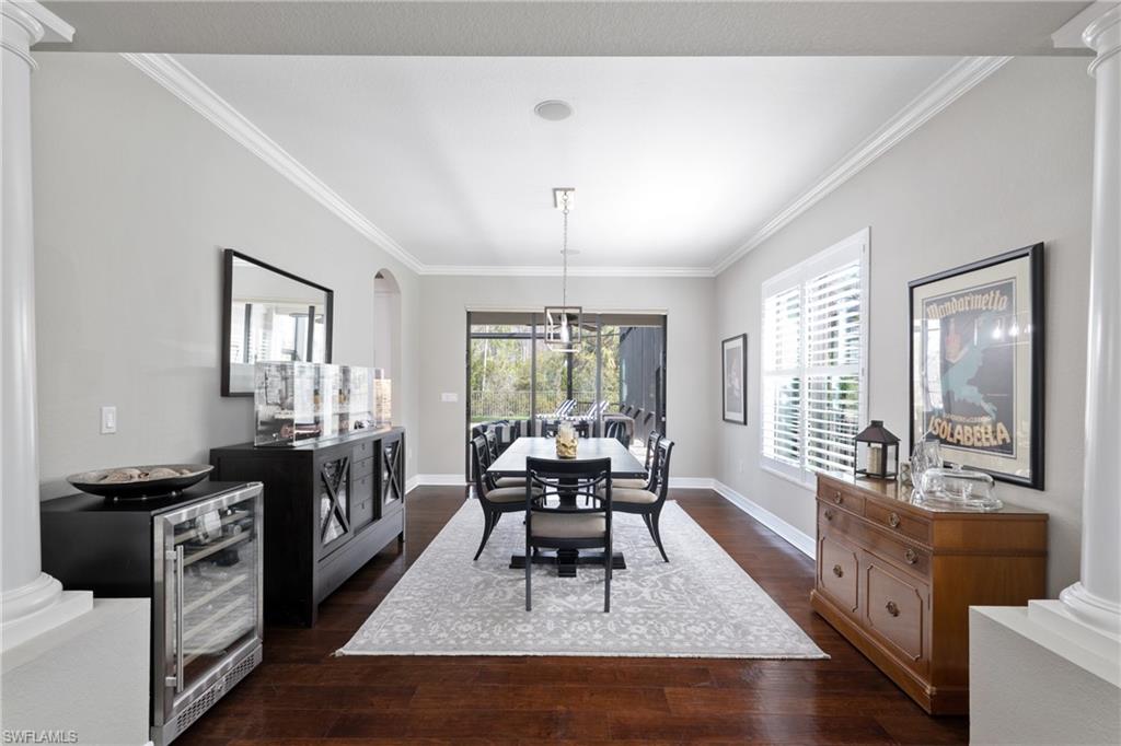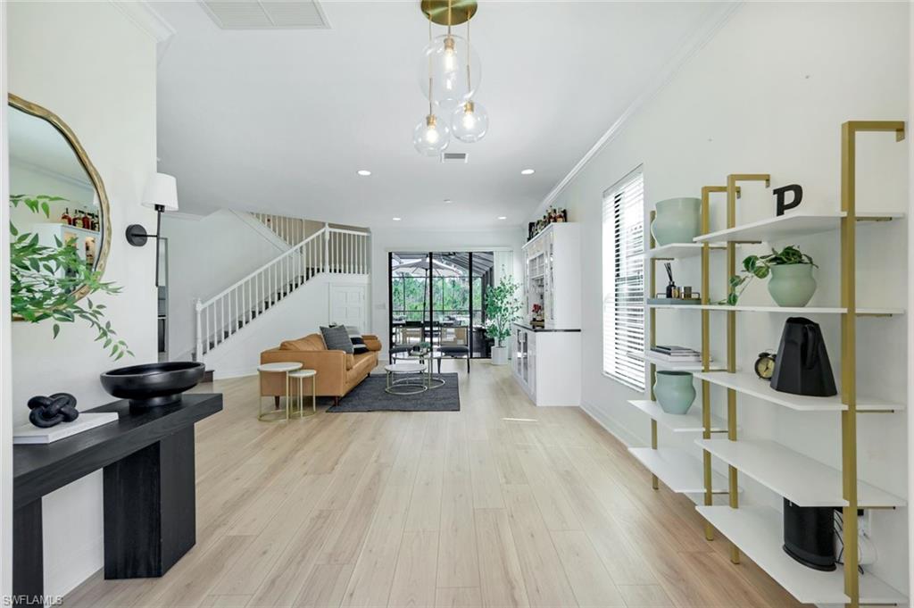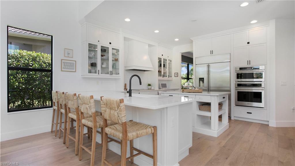 Discover the pinnacle of luxury living with the largest floor plan available in Riverstone of Naples. The Dubonnet Grande model seamlessly blends style, elegance, and functionality, offering a home that has been meticulously remodeled with exceptional attention to detail. As you enter, you are greeted by a grand foyer and soaring volume ceilings, with natural light cascading into the family room through expansive picture windows. The kitchen is a culinary masterpiece, featuring custom cabinetry, a functional island, GE Monogram appliances, glass front cabinets and stunning quartz countertops, all reminiscent of a magazine showroom. The pantry is a marvel, with its glass French door entry, subway tile backsplash, butcher block counters, and custom shelving designed to optimize every nook. The main living areas boast engineered hardwood flooring, enhanced with a thicker veneer for added durability and humidity resistance. The entryway leads to a mud/laundry room equipped with custom gray cabinets and a convenient bench seat. The crown jewel of the ground floor is the primary suite, featuring grand bay windows and a luxuriously remodeled primary bath that promises a spa-like retreat. Step outside to a vast, private outdoor space. Clusia hedges lined with fencing offer seclusion, while the preserve and trellis in the rear create the perfect backdrop for the western exposure. The pool area is a haven, with natural shell inlay pavers that stay cool underfoot, a smartly designed pool with a sun shelf, and a hot tub with a drip edge overlook. Ascend the grand staircase, accentuated with white risers, to reach the open loft/den area, which can be enclosed for an office. A few steps lead to the versatile bonus/media room, complete with built-in cabinets and a mini-fridge. The second floor also includes an open balcony, perfect for crafting your own Southwest Florida paradise, as well as three additional bedrooms and two and a half baths. Further enhancements include crown moldings throughout most of the home, three separate HVAC systems for personalized comfort, a 50-amp breaker for a generator, and a 240-amp breaker for your electric vehicle. This impeccably designed home is ready for you to move in and start living the dream.