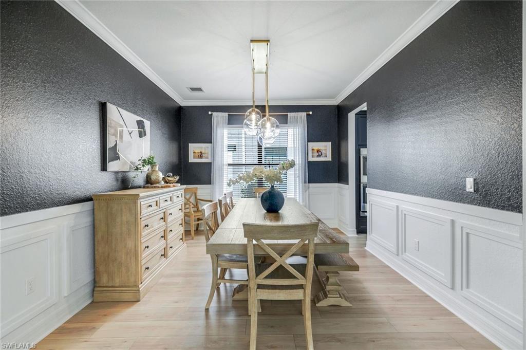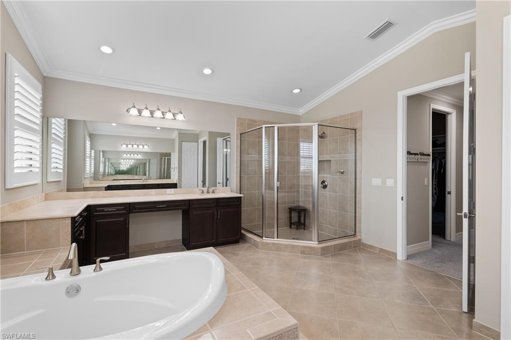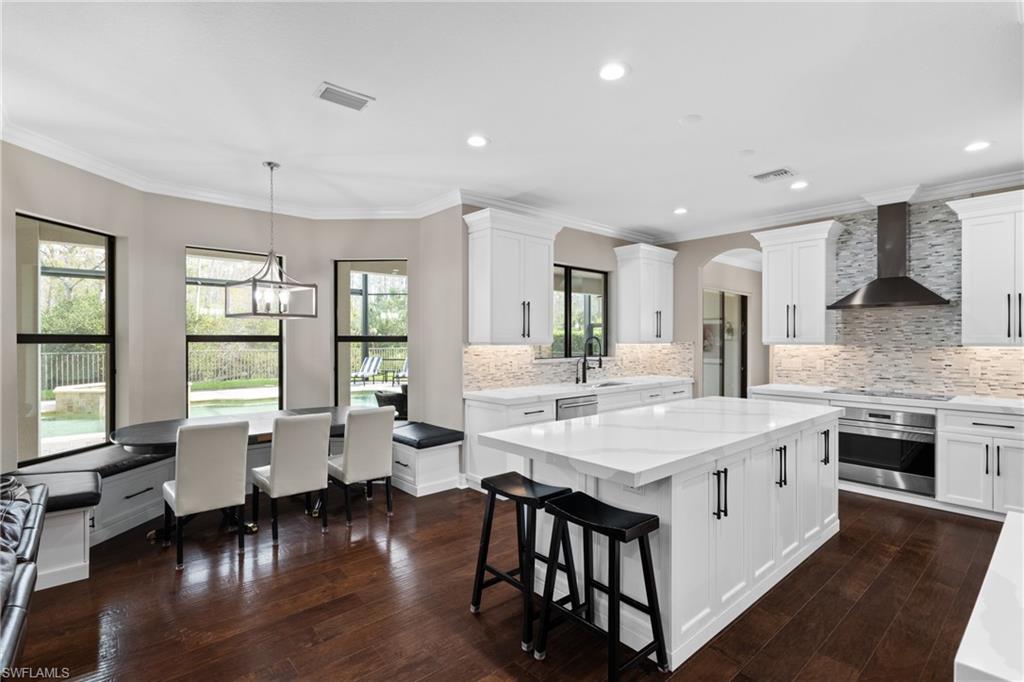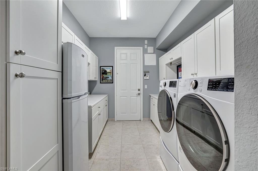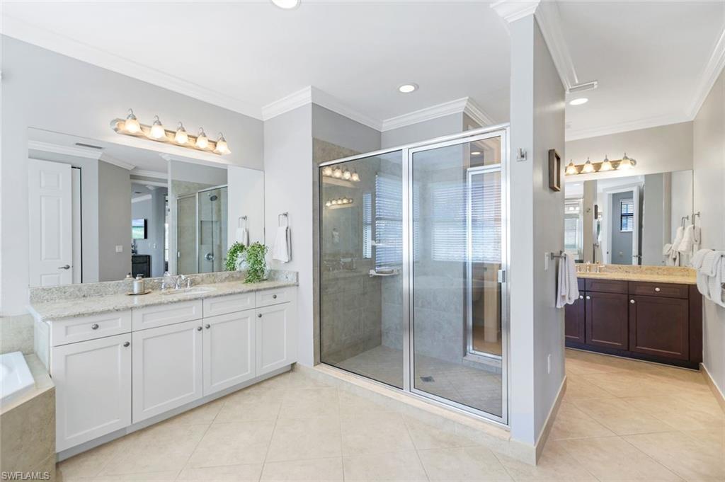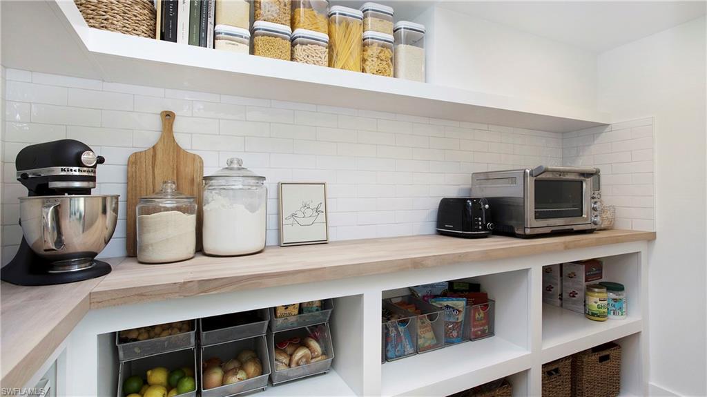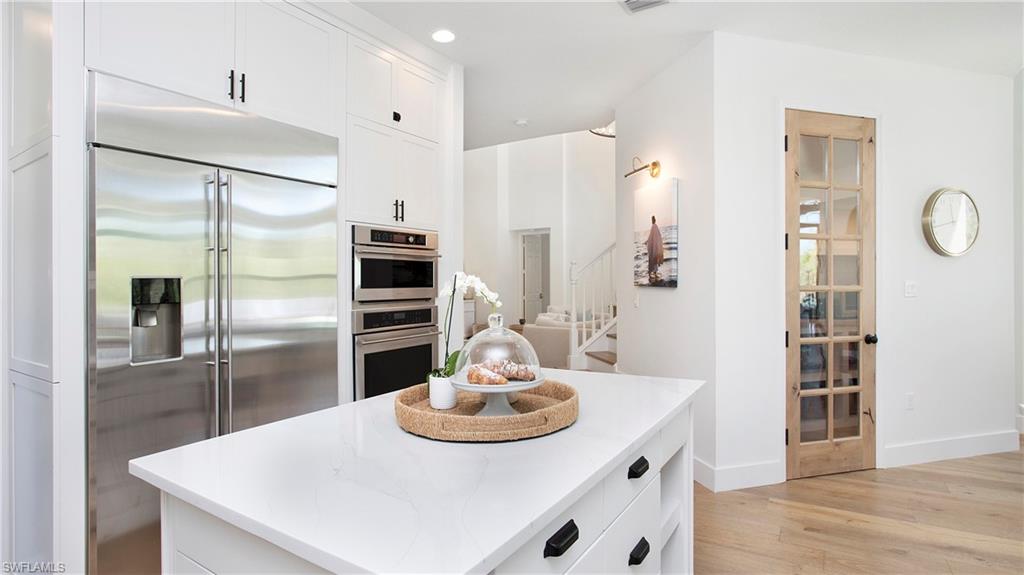 Discover the pinnacle of luxury living with the largest floor plan available in Riverstone of Naples. The Dubonnet Grande model seamlessly blends style, elegance, and functionality, offering a home that has been meticulously remodeled with exceptional attention to detail. As you enter, you are greeted by a grand foyer and soaring volume ceilings, with natural light cascading into the family room through expansive picture windows. The kitchen is a culinary masterpiece, featuring custom cabinetry, a functional island, GE Monogram appliances, glass front cabinets and stunning quartz countertops, all reminiscent of a magazine showroom. The pantry is a marvel, with its glass French door entry, subway tile backsplash, butcher block counters, and custom shelving designed to optimize every nook. The main living areas boast engineered hardwood flooring, enhanced with a thicker veneer for added durability and humidity resistance. The entryway leads to a mud/laundry room equipped with custom gray cabinets and a convenient bench seat. The crown jewel of the ground floor is the primary suite, featuring grand bay windows and a luxuriously remodeled primary bath that promises a spa-like retreat. Step outside to a vast, private outdoor space. Clusia hedges lined with fencing offer seclusion, while the preserve and trellis in the rear create the perfect backdrop for the western exposure. The pool area is a haven, with natural shell inlay pavers that stay cool underfoot, a smartly designed pool with a sun shelf, and a hot tub with a drip edge overlook. Ascend the grand staircase, accentuated with white risers, to reach the open loft/den area, which can be enclosed for an office. A few steps lead to the versatile bonus/media room, complete with built-in cabinets and a mini-fridge. The second floor also includes an open balcony, perfect for crafting your own Southwest Florida paradise, as well as three additional bedrooms and two and a half baths. Further enhancements include crown moldings throughout most of the home, three separate HVAC systems for personalized comfort, a 50-amp breaker for a generator, and a 240-amp breaker for your electric vehicle. This impeccably designed home is ready for you to move in and start living the dream.