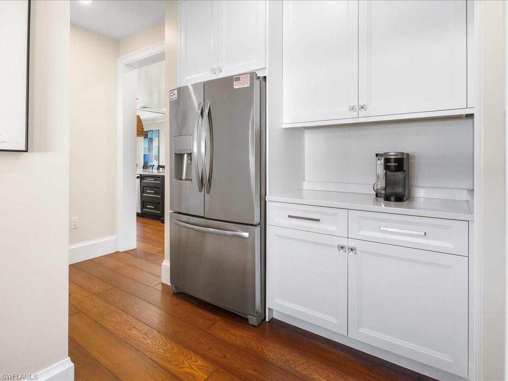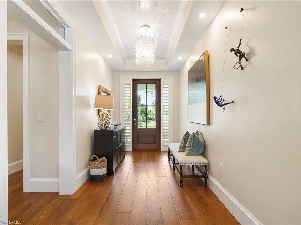 Prepare to be captivated by this exceptional waterfront residence, custom built by JVM and located in one of Naples’ most desirable communities — notably with no flooding or storm damage from recent hurricanes. This beautifully designed one-story home showcases a seamless blend of timeless craftsmanship and modern luxury. The open-concept great room floor plan is flooded with natural light and offers stunning water views throughout. Soaring volume ceilings with elegant wood beam accents, wide-plank engineered hardwood flooring, and sophisticated finishes set the tone for effortless coastal living. The heart of the home is the chef’s kitchen, featuring a 12-foot quartz island, Viking stainless steel appliances, a gas range, farmhouse sink, pristine white cabinetry, and a spacious walk-in pantry. A walk-through butler’s pantry—with second refrigerator, laundry area, sink, and custom cabinetry—adds both convenience and charm. With three generously sized bedrooms, a private den, and four impeccably appointed full baths, the layout offers comfort, style, and flexibility. Step outside to a true waterfront oasis: a saltwater pool, oversized spa, sun shelf, and a screened-in covered boathouse create the ultimate backdrop for relaxation or entertaining. A private dock with 15,000 lb lift, water and electric, provides quick Gulf access and puts downtown Naples, Keewaydin Island, and Marco Island just minutes away by boat. Additional highlights include a spacious three-car garage, 30- and 50-amp service ideal for generators or EV charging, and a rare combination of location, protection, and premium finishes. This is coastal living at its finest—schedule your private showing today.