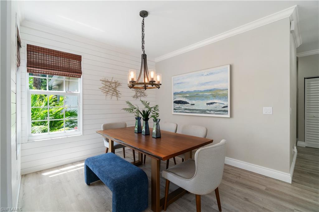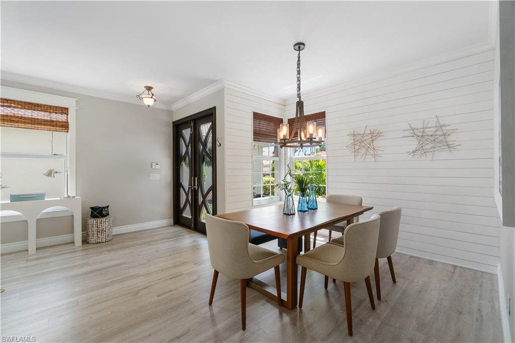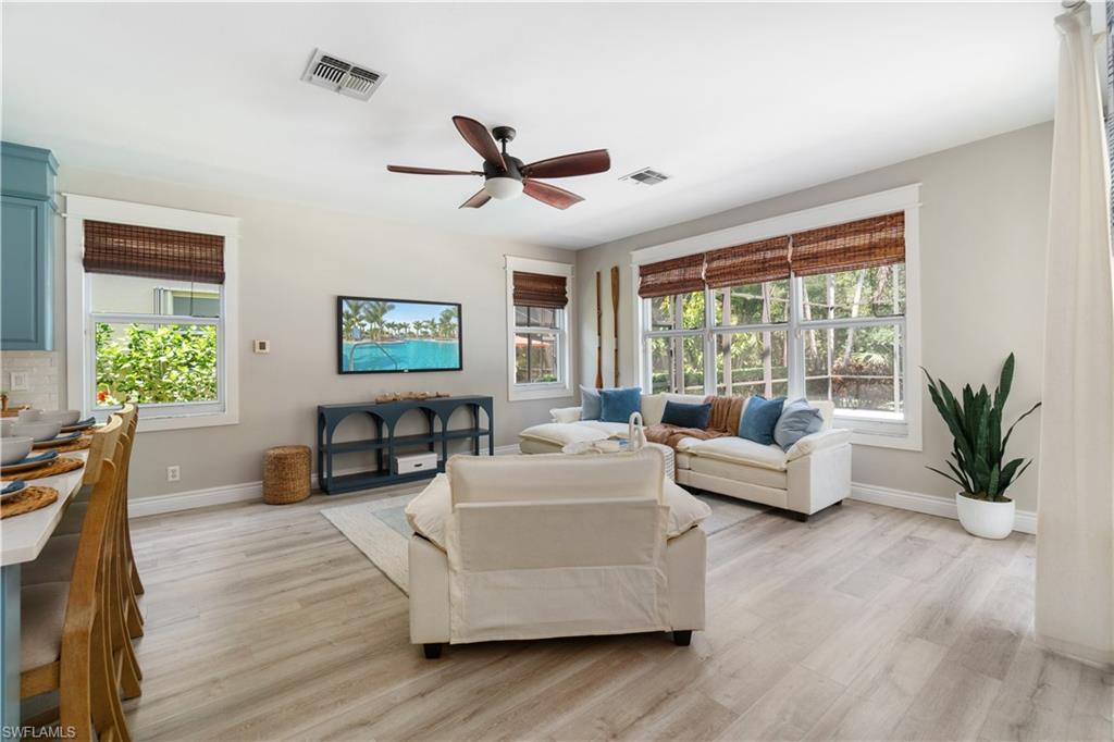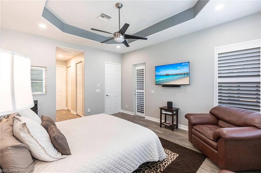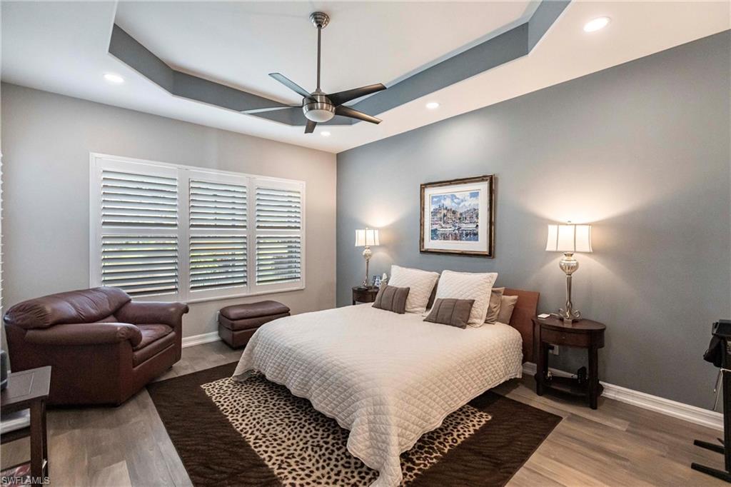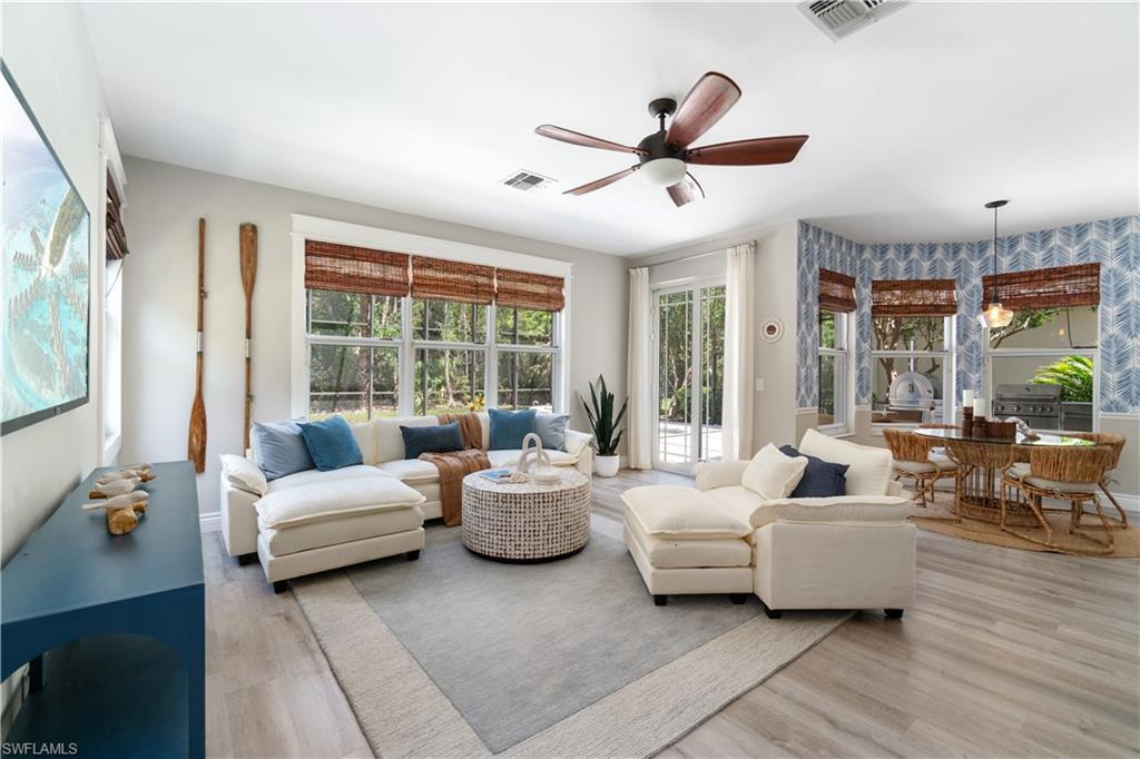 Beautifully updated 3 bed + den + loft, 3 bath pool home with western exposure in the gated community of Saturnia Lakes. This 2,735 sq ft home features engineered wood flooring throughout, custom 4” plantation shutters, and a fully remodeled kitchen with quartz countertops, a 10’ island, ceramic backsplash, and new LG appliances. All bathrooms have been tastefully renovated with quartz countertops and frameless glass showers. The den serves as a built-in home office with custom cabinetry, while additional upgraded features throughout the home include shiplap accents and enhanced LED lighting. Upstairs, a spacious loft offers a versatile bonus area that could be used as a fourth bedroom, media room, or playroom. It even has a large walk in closet! Enjoy stunning sunsets from the screened lanai with a saltwater pool, spa, fountains, LED lighting, and iAquaLink phone app control. The garage features kitchen-grade built-in cabinets for extra storage. Bedrooms and great room are pre-wired for wall-mounted TVs. This property is not in a flood zone! Saturnia Lakes offers resort-style amenities including a 12,000 sq ft clubhouse, fitness center, tennis courts, basketball, spa, pool, and more—plus 24-hour gated security and full lawn care. Ideally located just minutes from I-75 and Logan Blvd.