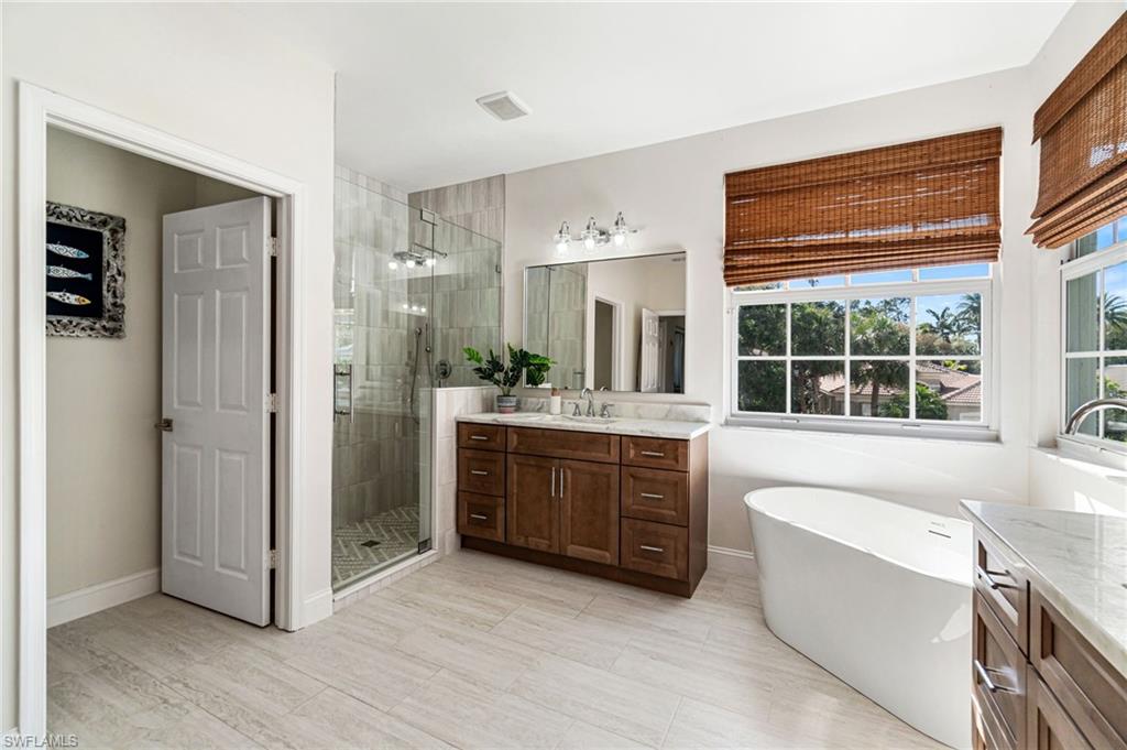 Spacious “Sapphire” floorplan (4 Bedrooms + Loft / 3.5 Baths / 3-Car Garage / 3,773 sq. ft.) is perfectly situated in the highly sought-after, amenity-rich community of Saturnia Lakes. From the moment you enter, you’ll be greeted by soaring 22-foot ceilings, luxury Brand New Epoxy floors throughout ground level and an open, light-filled layout with generously sized rooms throughout. The first-floor primary suite is a true retreat featuring two large walk-in closets, a cozy sitting area, French doors leading to the lanai, and a luxurious bath with dual vanities, a soaking tub, and a brand-new frameless glass shower. Master suite also includes dedicated AC/Heat unit. Upstairs, enjoy a spacious loft/bonus area, three oversized guest bedrooms, and two full bathrooms — perfect for family or guests. Brand new White luxury LVP floors throughout 2 nd floor and stairs. Step outside to your private solar-heated pool and soak up the Florida sunshine! The pool is powered by Brand New pump system. Additional upgrades include ; Grand chandelier at the entrance and new light fixtures throughout the first floor, Tinted windows in t California type build in linen, bedroom closets and pantry, a whole-house generator with 2 above ground 120LB (each) propane gas tanks, new roof (2021), roll-down shutters on all windows and doors (automated 1st floor shutters), newer A/C systems with new ductwork, and an electric car charger. Saturnia Lakes offers resort-style living with a multi-million-dollar clubhouse featuring a heated resort and lap pool, kiddie pool, hot tub, fitness center, dance studio, internet café, saunas, massage rooms, billiards, ballroom, 4 clay tennis courts, basketball court, putting green, playground, and miles of scenic walking paths and Nature Preserve Park. Located in an A-rated school district and close to shopping, dining, and Naples’ white sand beaches