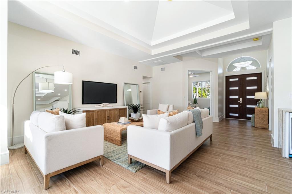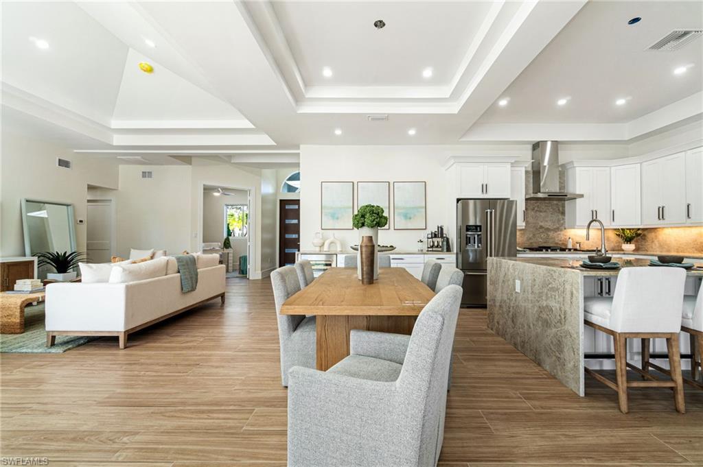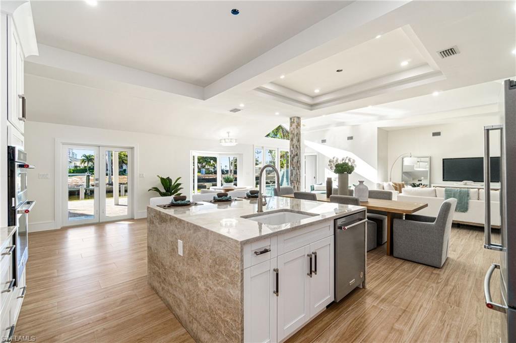 Welcome to 5215 Seashell Avenue in the highly coveted waterfront enclave of Seagate. Tucked away at the end of a quiet cul-de-sac surrounded by high-end homes is this 4 Bedroom/3 Bathroom waterfront home with 110 feet of canal frontage. This exceptional home was thoughtfully redesigned by renowned local architect, MHK Architects, and was completely renovated inside and out in 2023. This home boasts a light and airy mid-century contemporary flair inspired by California ranch-style architecture. Enter into an open-concept living space with spacious living room replete with vaulted ceilings, wide plank light oak hardwood floors and dramatic contemporary accent wall. Wall of glass opens to the rear outdoor space seamlessly blending indoor/outdoor living. A true chef's eat-in kitchen features sleek European-style flat panel cabinetry, oversized island with waterfall edges, stainless steel appliances, bar area plus lovely dining room ideal for entertaining. Master suite oasis with spacious bedroom with contemporary accent wall, walk-in closet with custom built-ins and a spa-like en-suite bath with custom double vanity, step-in shower, freestanding soaking tub and separate water closet. Split floor plan with 2 additional guest bedrooms with full baths plus a 4th bedroom currently set up as an office/media room. Convenient laundry room with great storage. 2-car attached garage with epoxy floor. Outdoor resort-style private oasis with covered living and dining area, TV, gorgeous pool and spa plus a canal front patio with firepit. A boater's dream with direct water access and a floating dock. Optional Seagate Beach Club membership offers private beachfront access. Truly exceptional and a great value for this highly desirable neighborhood. Easy access to schools, Waterside Shops, downtown Naples, I-75 as well as Naples and Fort Myers airports.