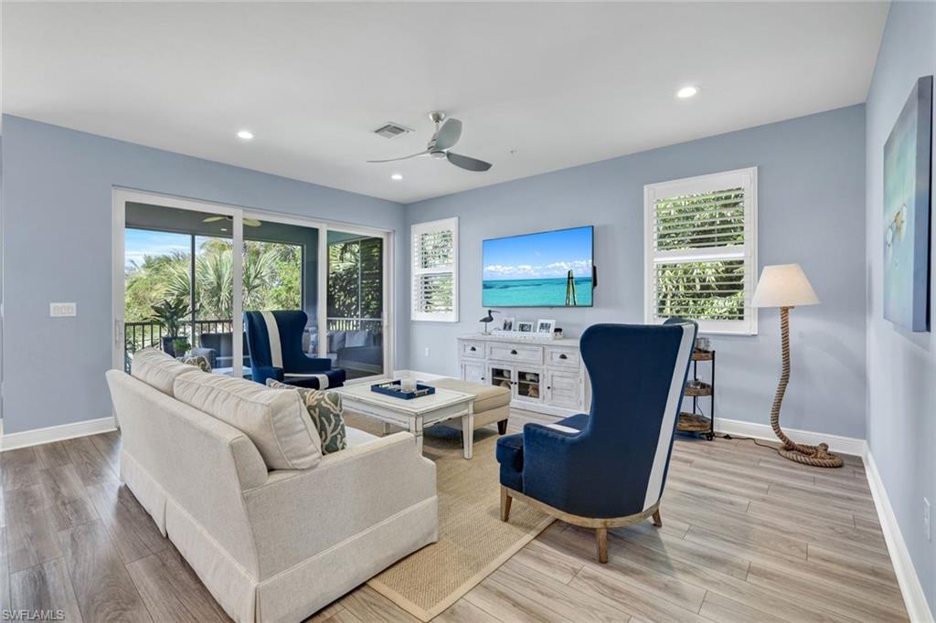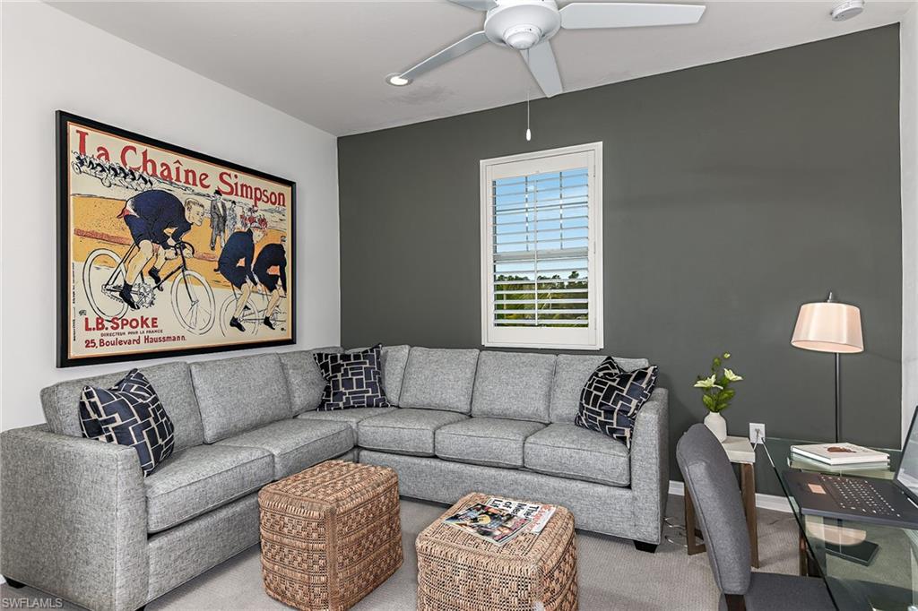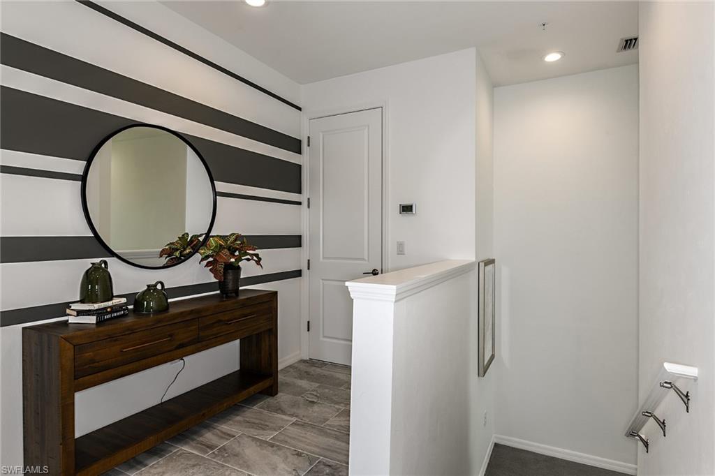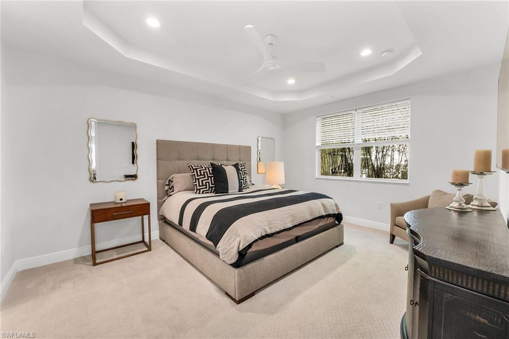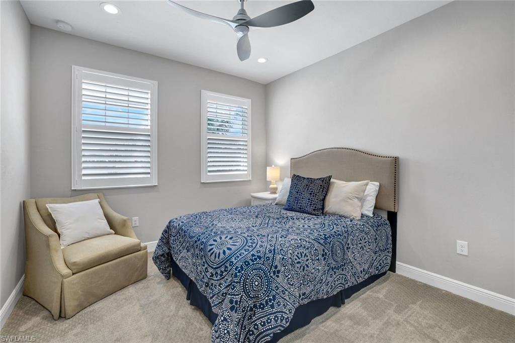 Welcome to your piece of paradise in the sought-after community of Seychelles, just minutes from downtown Naples and the Gulf’s white sandy beaches. This beautifully appointed carriage home is the only 2nd floor residence in the community with a sparkling lake view on two sides of the lanai — the perfect setting to enjoy gorgeous sunsets from your spacious screened lanai. Inside, you’ll find an inviting open-concept design that blends comfort and elegance. The chef-inspired kitchen features a large island, quartz countertops, 42-inch upper cabinets, a decorative backsplash, stainless steel appliances, and stylish pendant lighting — ideal for entertaining or everyday living. The home showcases wood plank tile flooring in the main living areas, with carpet in the bedrooms for added comfort. Elegant window coverings and plantation shutters enhance select spaces throughout the home, creating a warm and refined atmosphere. Glass French doors lead to the den, which offers flexibility as a home office, hobby room or reading nook — all while capturing a tranquil view of the lake and picturesque fountain. The primary suite is a serene retreat featuring beautiful lake views, decorative drapes, a spacious walk-in closet, and a spa-like bathroom with dual sinks, a large walk-in shower, and a separate water closet. Additional highlights include this home having one of longest driveways in the community, providing convenience, and a garage with epoxy flooring. Residents of Seychelles enjoy resort-style amenities, including a large community pool, hot tub/spa, well-equipped fitness center, and a beautiful clubhouse surrounded by tropical landscaping and palm trees. Located just a short drive from 5th Avenue South, 3rd Street South, Tin City, the Naples Botanical Gardens, Naples Zoo, Baker Park, Cambier Park, the Gordon River Greenway, the Naples Philharmonic, countless golf courses, and the National Pickleball Center, this home offers easy access to the best of Naples’ dining, shopping, culture, and recreation — as well as the pristine white-sand beaches of Naples and Marco Island. Furniture is negotiable. *Please watch the video.*